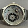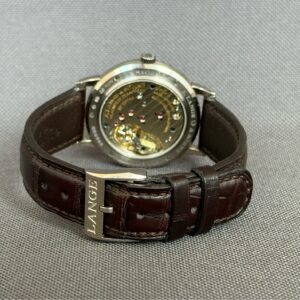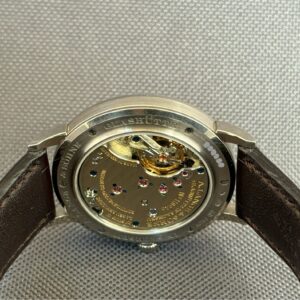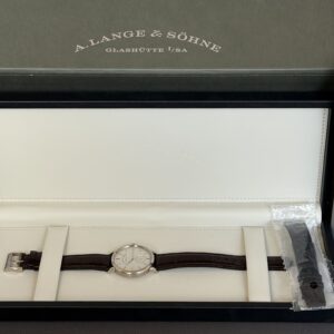 Yderst smukt A. Lange & Söhne Saxonia herre ur, som er håndlavet i hvidguld inkl. hvidguldsspænde. Uret måler 35mm, men syner nærmere af 36 til 37mm. Igennem den gennemsigtige safir bagkasse kan man nyde det smukke L.941.1 værk med manuelt optræk. Gangreserve 45 timer ved fuldt optrukket.