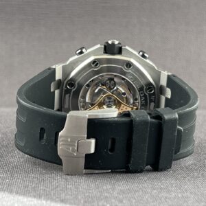Et lækkert AP Offshore Chronograph i stål med blå skive, sort gummi-rem og keramik-knapper. Der medfølger også orignal blå croco-rem. Safirglas for og bag med kig til det automatiske værk ca. 3126. Vandtæthed til 100m.