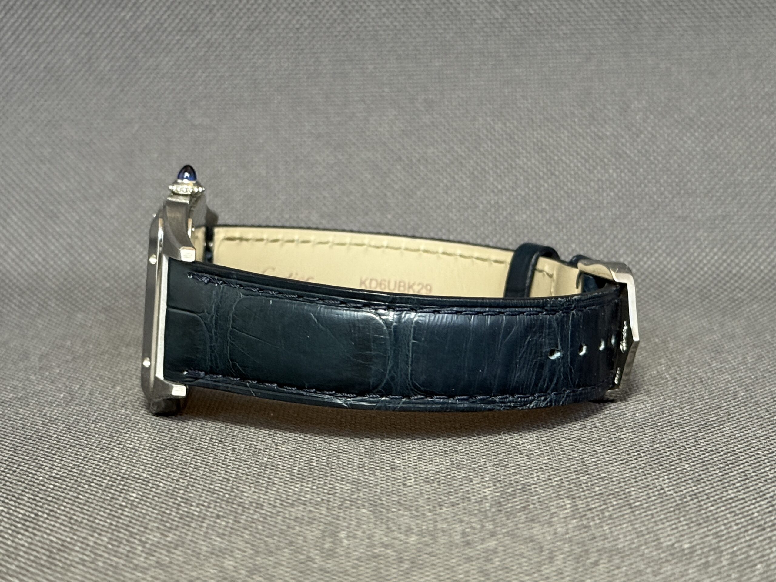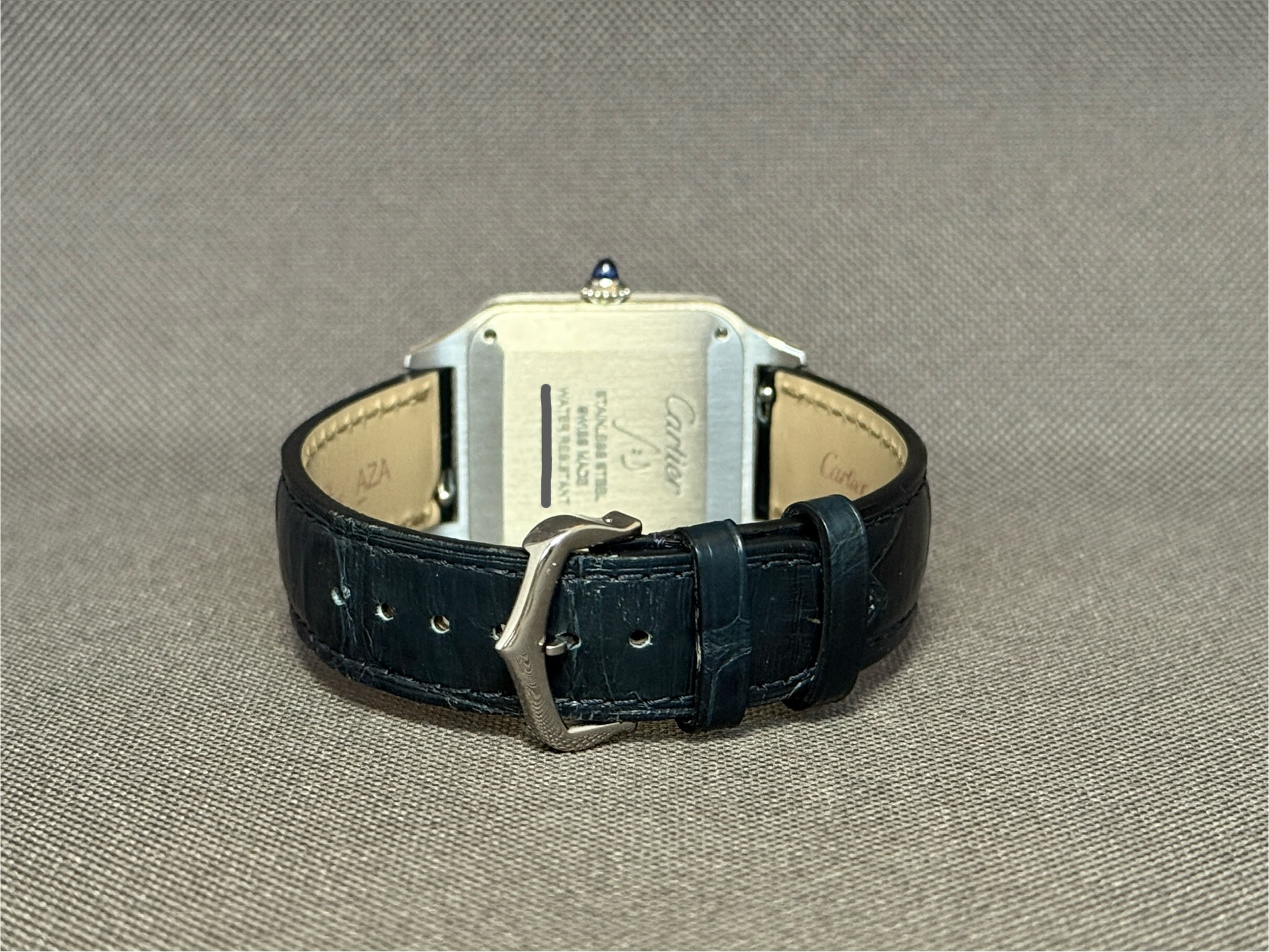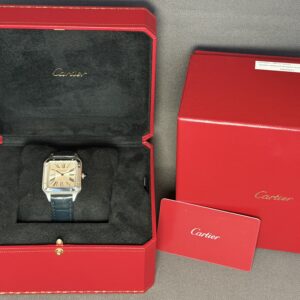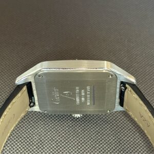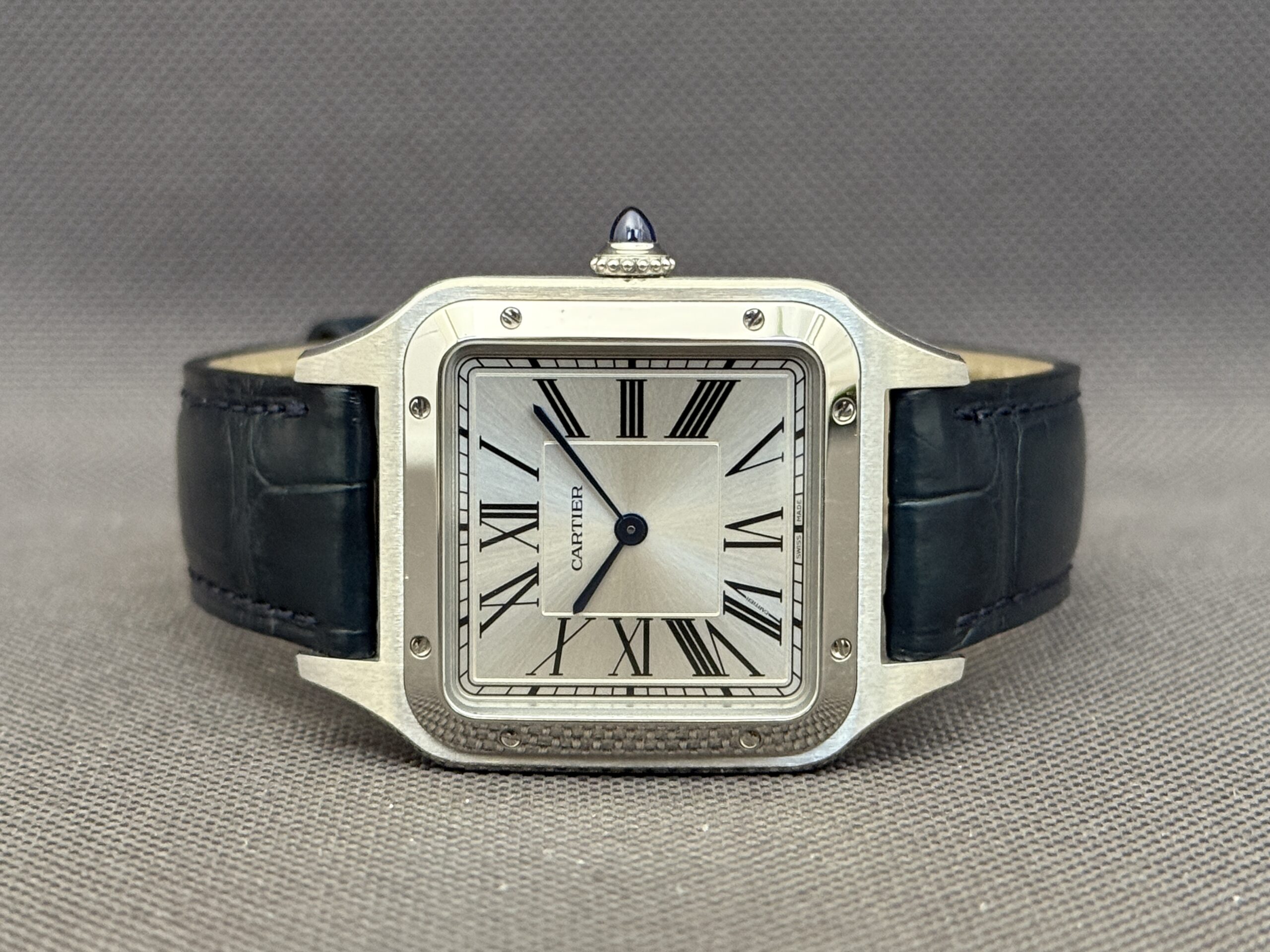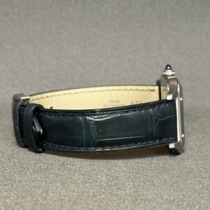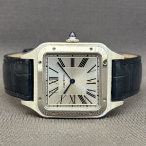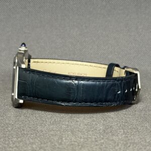 Elegant Santos Dumont Large-model i poleret stål med sølvskive og blå alligatorrem. Drevet af Cartiers høj-autonomi quartzværk og beskyttet af safirglas. Et ultra-slankt og klassisk dress-ur med ikoniske romertal og blå visere.