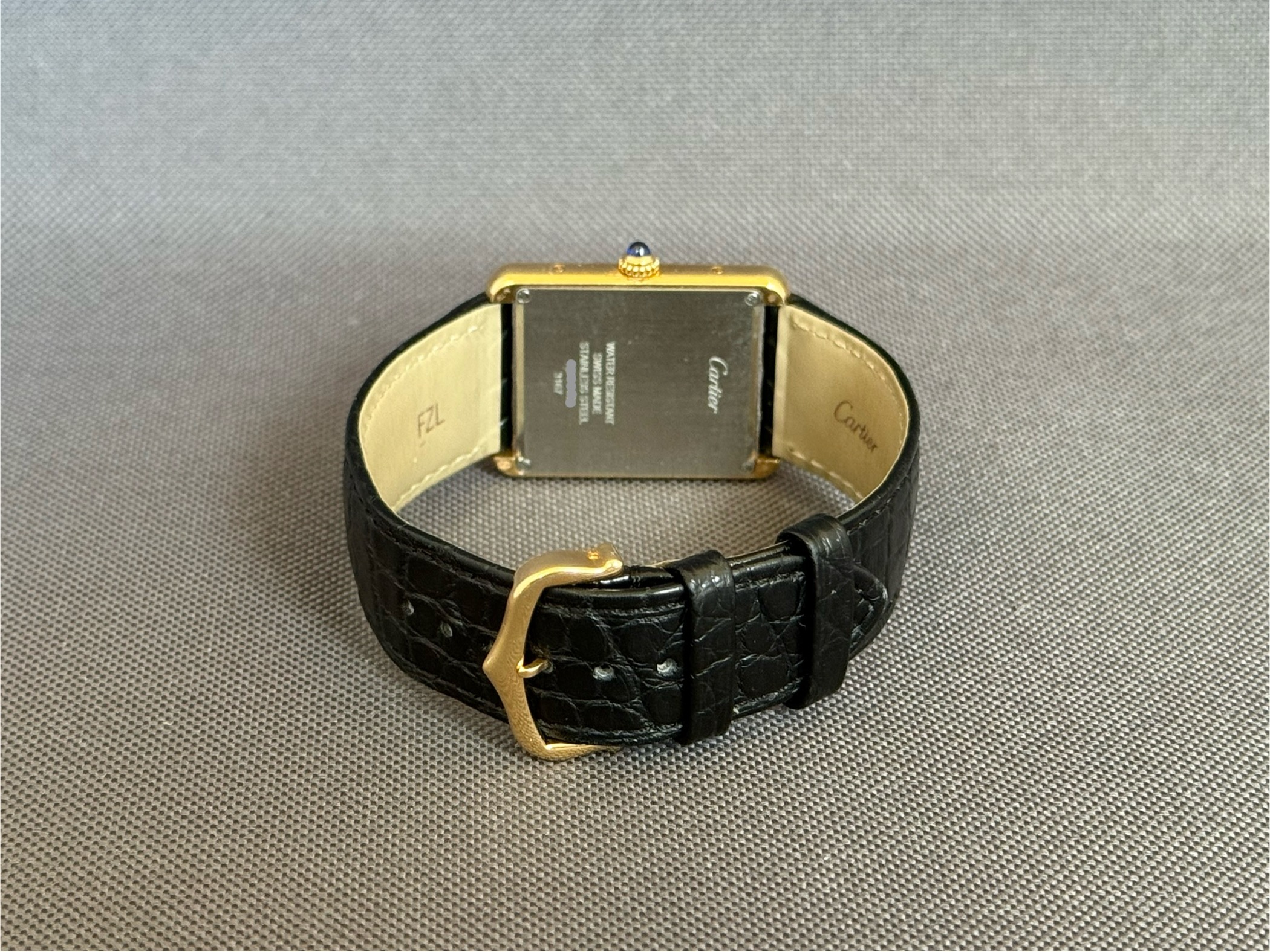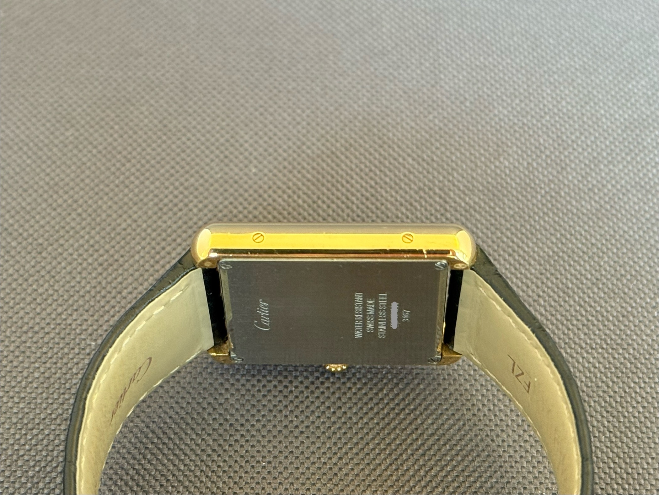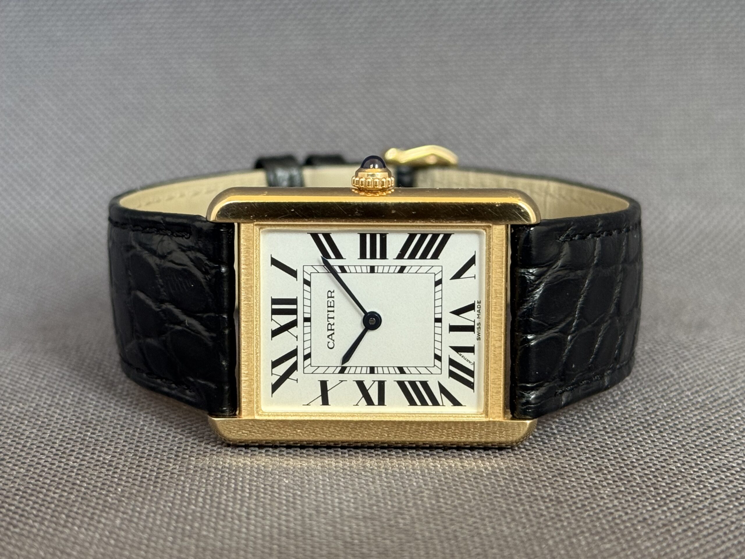 Yderst smukt Cartier Tank Solo i størrelse Large. Uret er fremstillet i 18 karat guld med stål bagkasse samt 18 karat guld spænde.