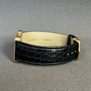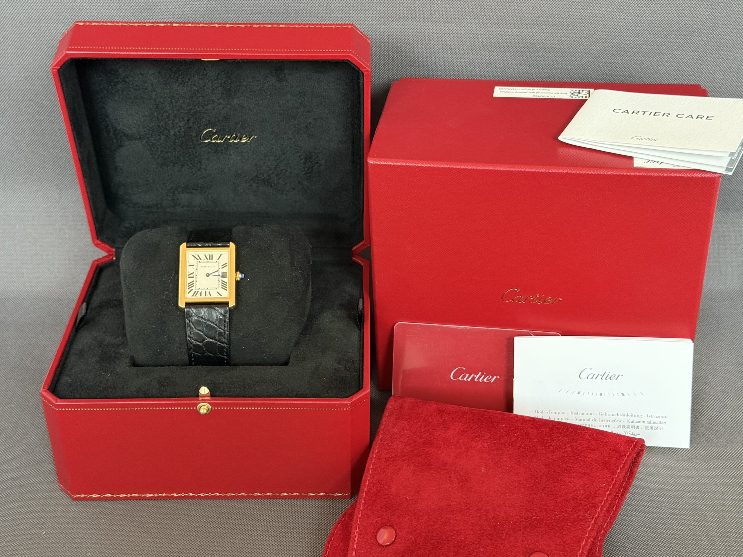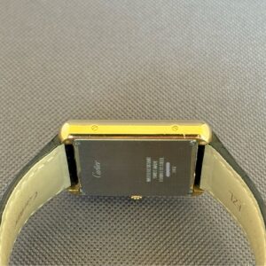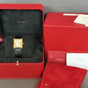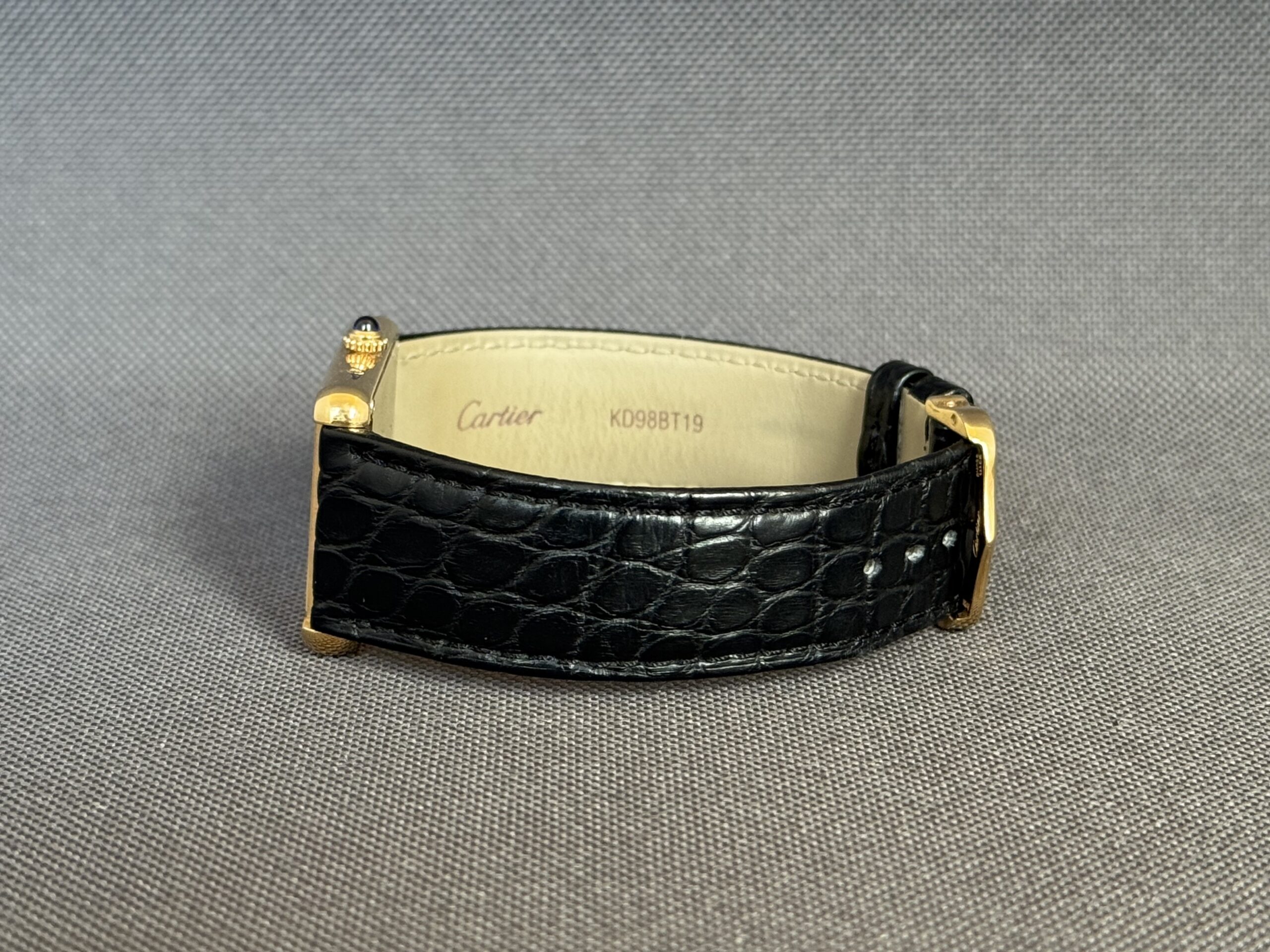 Yderst smukt Cartier Tank Solo i størrelse Large. Uret er fremstillet i 18 karat guld med stål bagkasse samt 18 karat guld spænde.