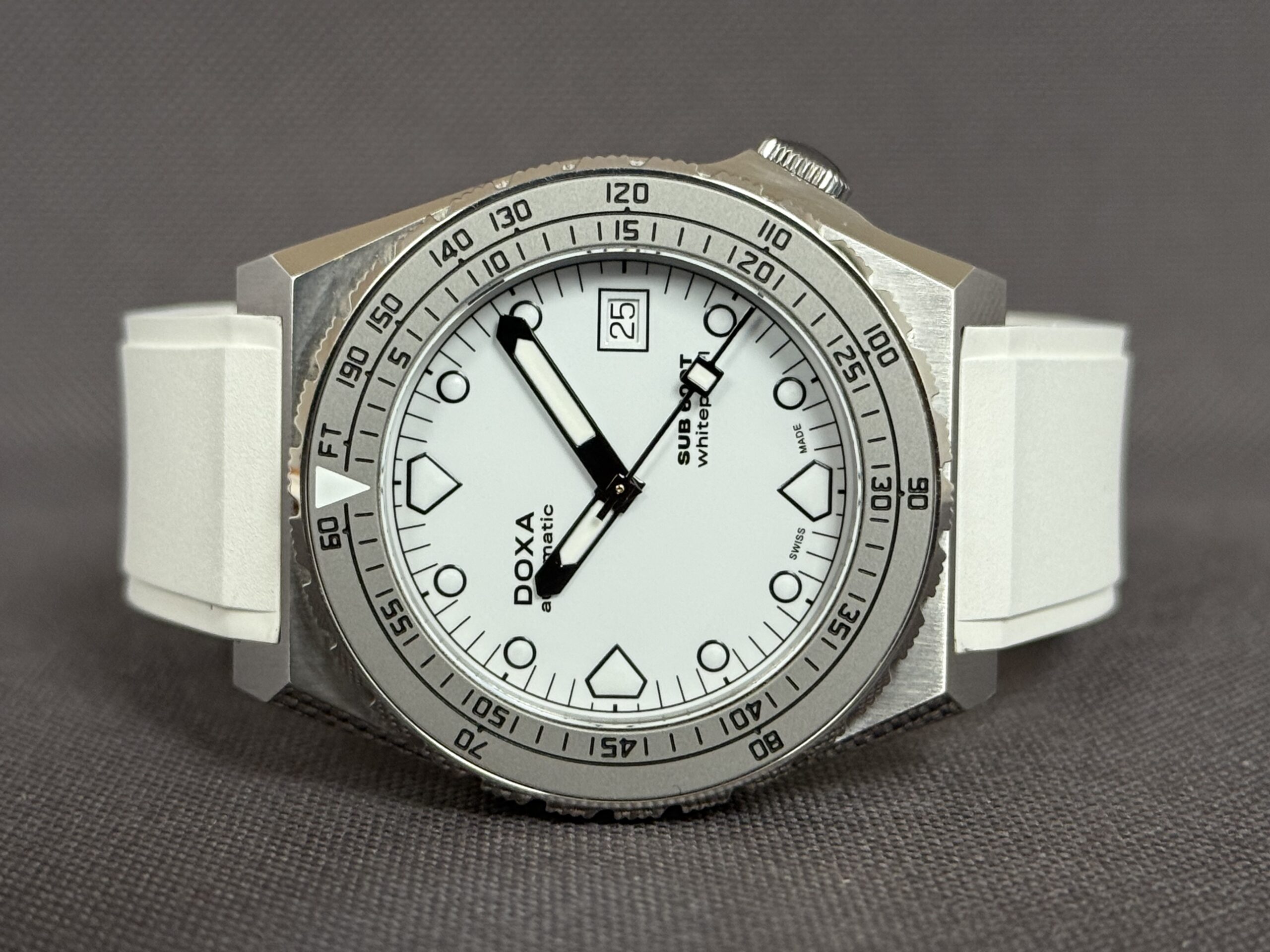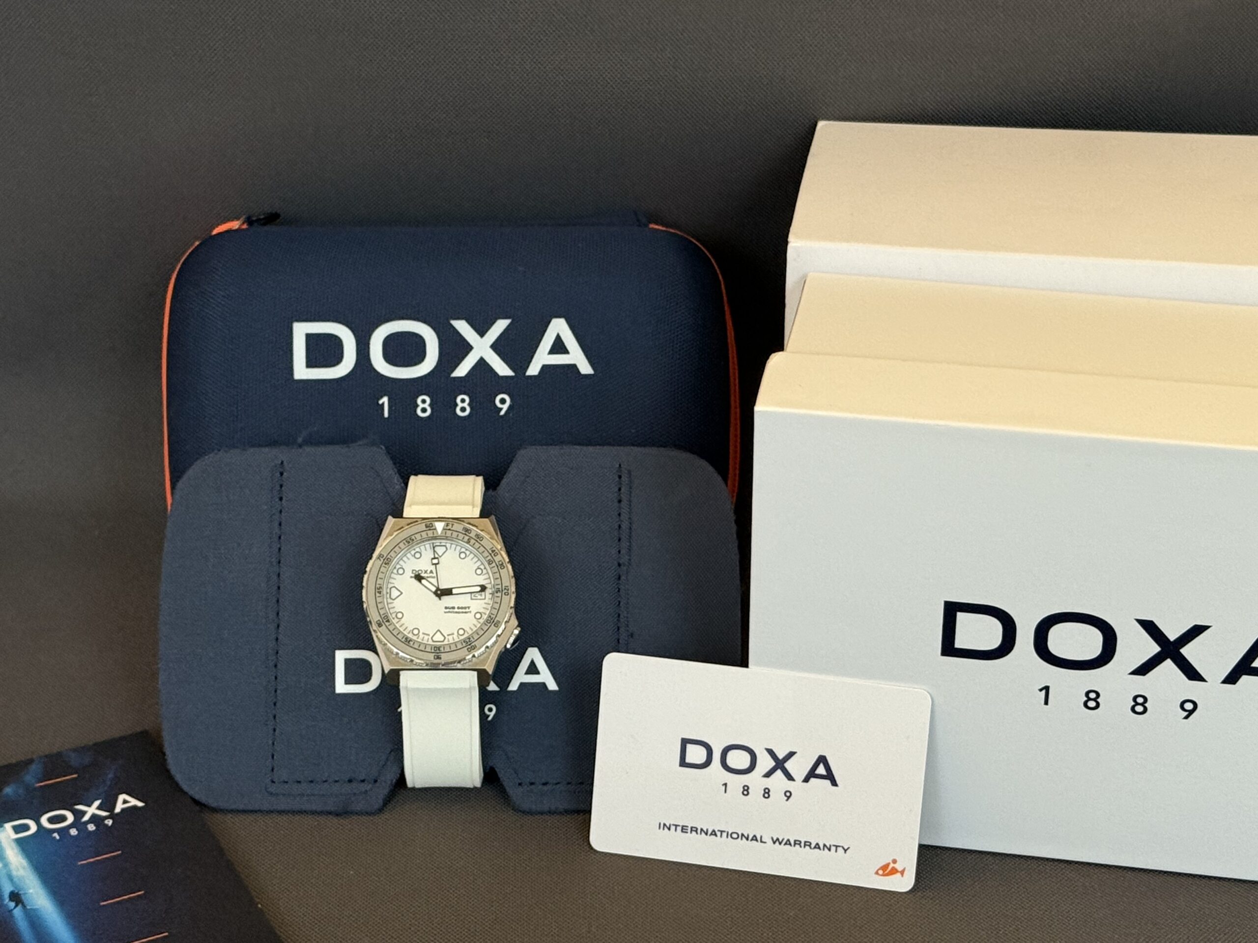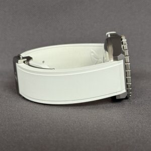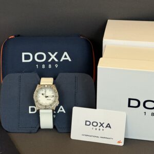 Super flot dykkerur fra Doxa i 40mm. Uret er født med hvid gummirem med foldespænde samt matchede hvid skive ‘Whitepearl’. Kassen er fremstillet i 316L stål som bruges af mange af de store Schweiziske urhuse. Vandtæthed på 600 meter.