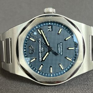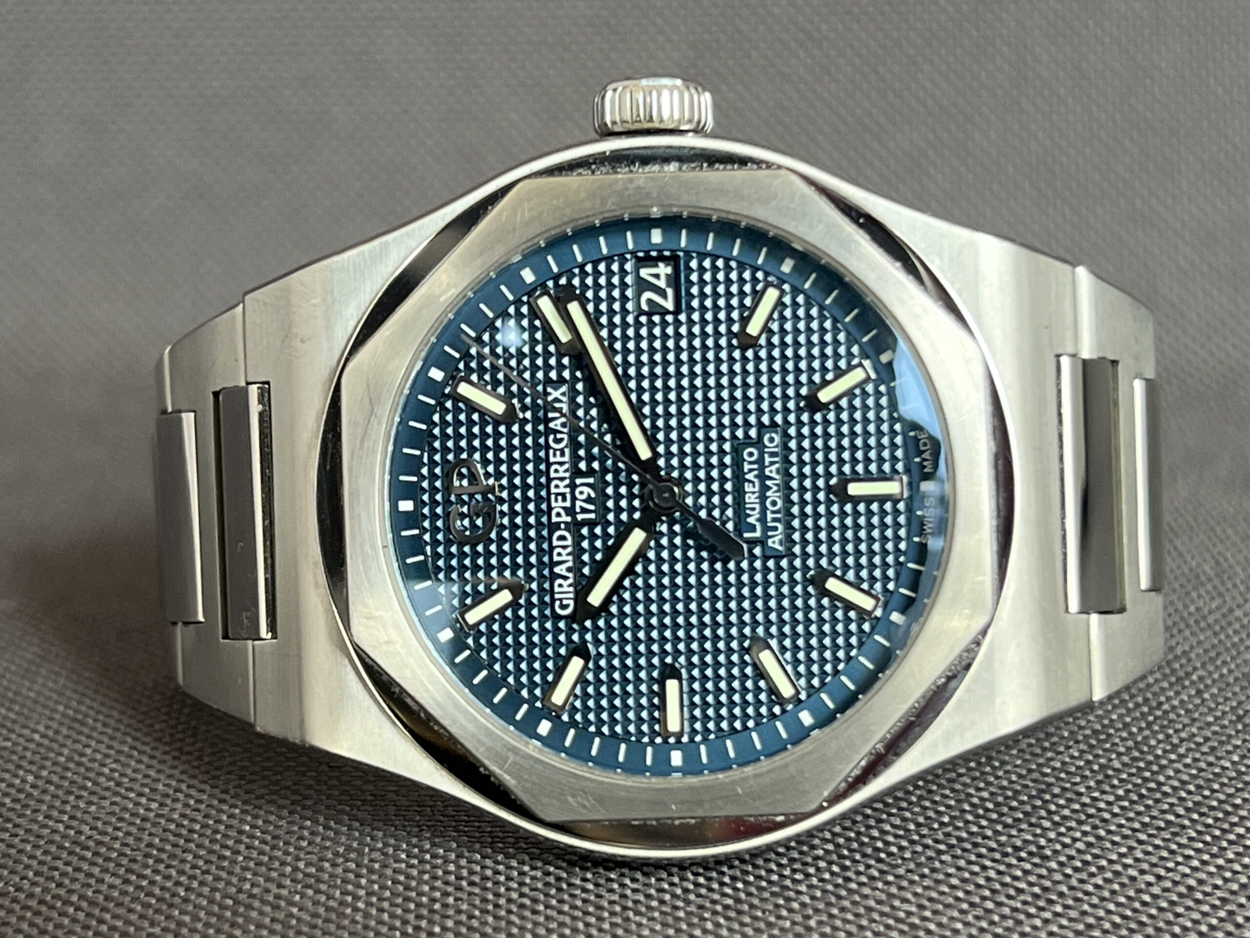 Drøn lækker ny udgave af GP klassikeren Laureato fra 70’erne. Uret er stadig med integreret lænke med polerede centerlinks. Et behageligt ur, der ligger fladt på håndleddet. Den blå skive skal opleves, samt de kniv skarpe visere og indeks, der er enorm lette at aflæse. Den gennemsigtige bagkasse giver udsyn til det smukke automatiske værk kaliber GP01800-0013, der yder 54 timers gangreserve. Uret er vandtæt til 100m.