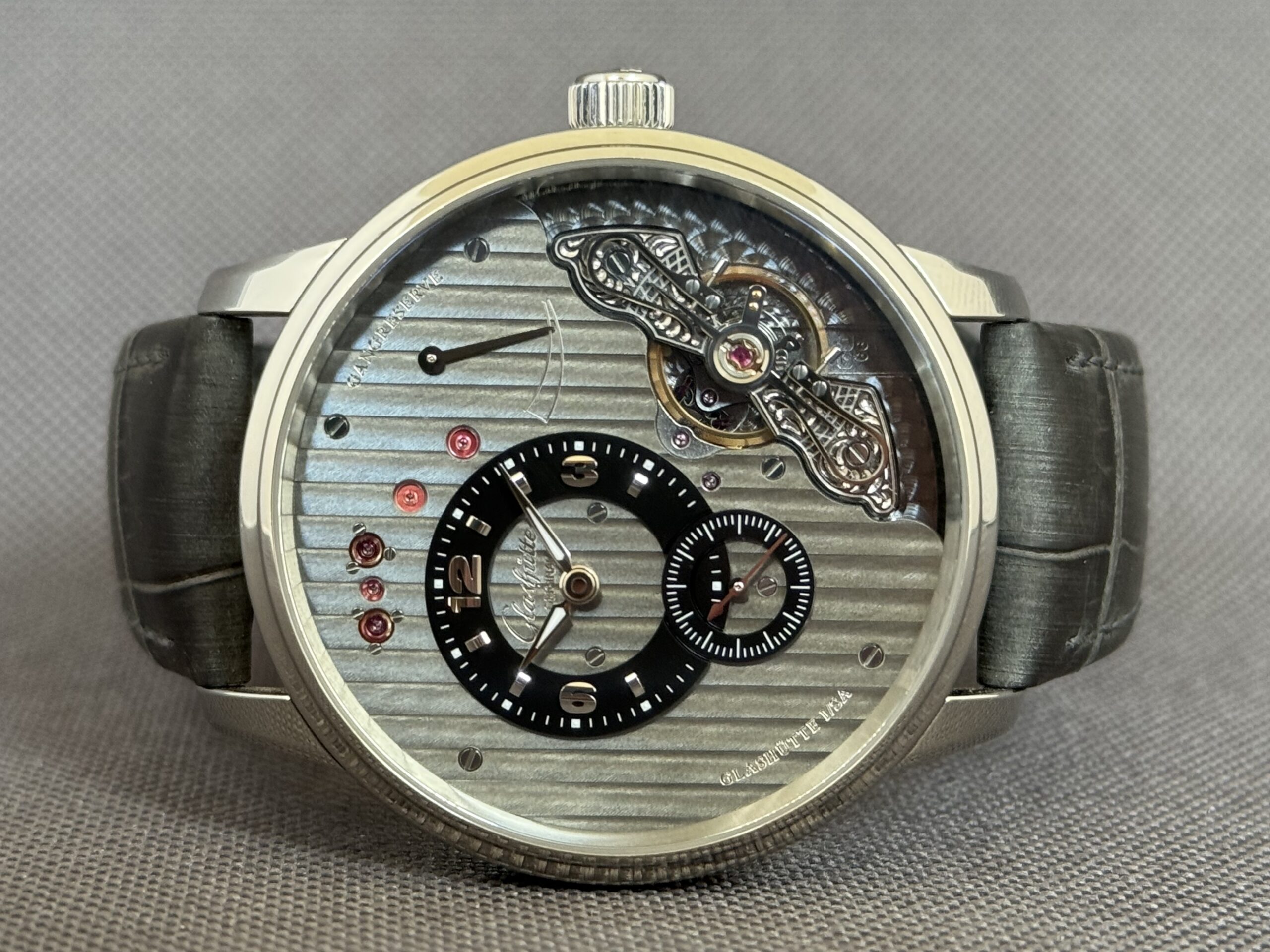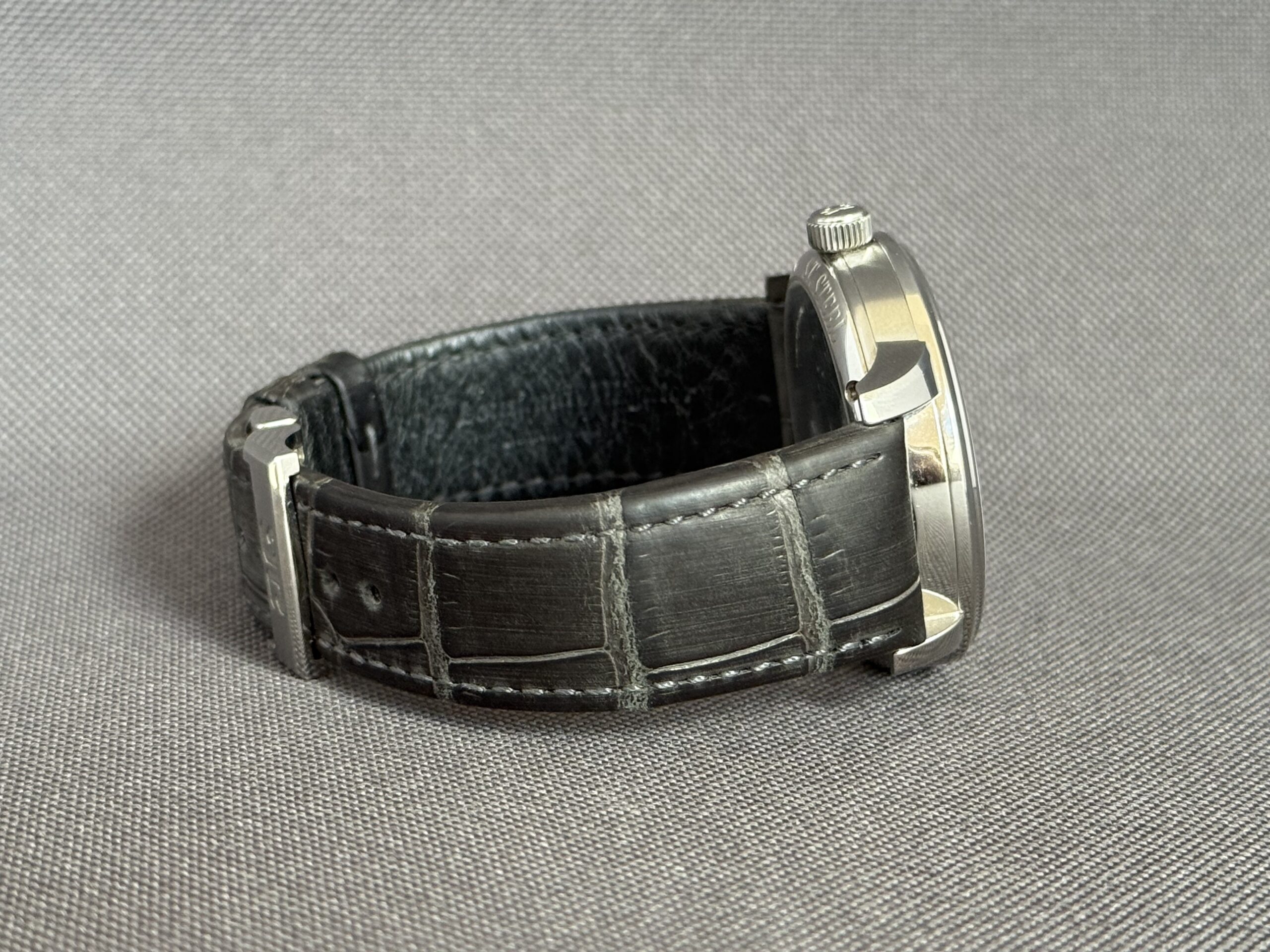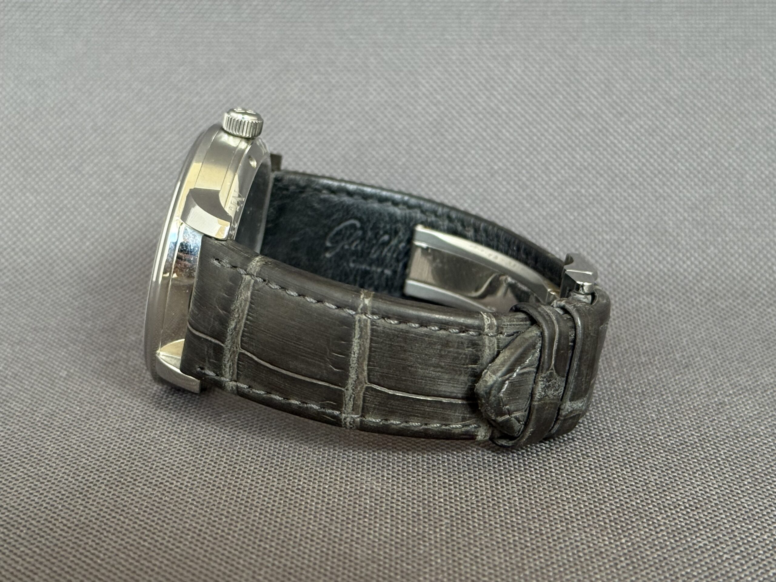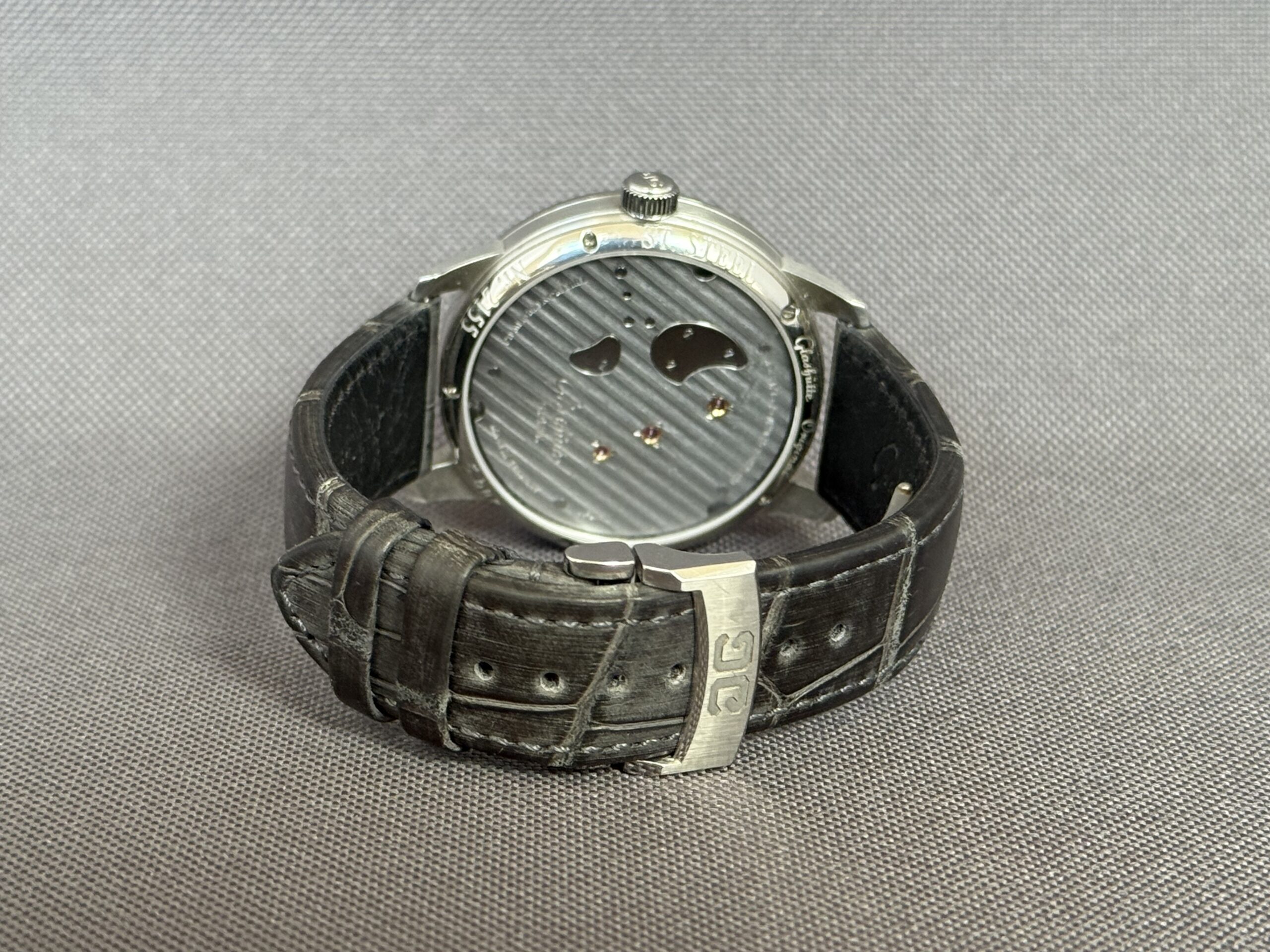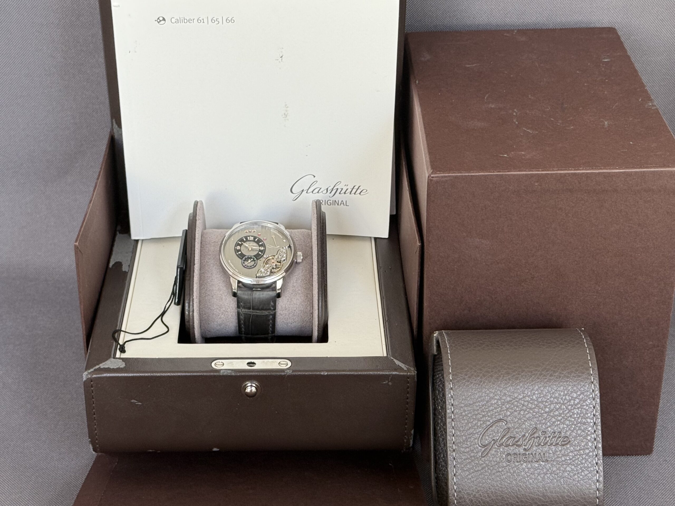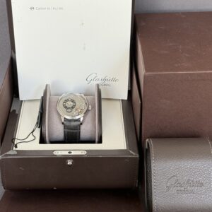 Smukt Glashütte Original med manuelt værk som yder 40 timers gangreserve, i urskiven kan man se det smukke urværk samt gangreserve indikator i skiven. Org. crocorem med foldespænde.
