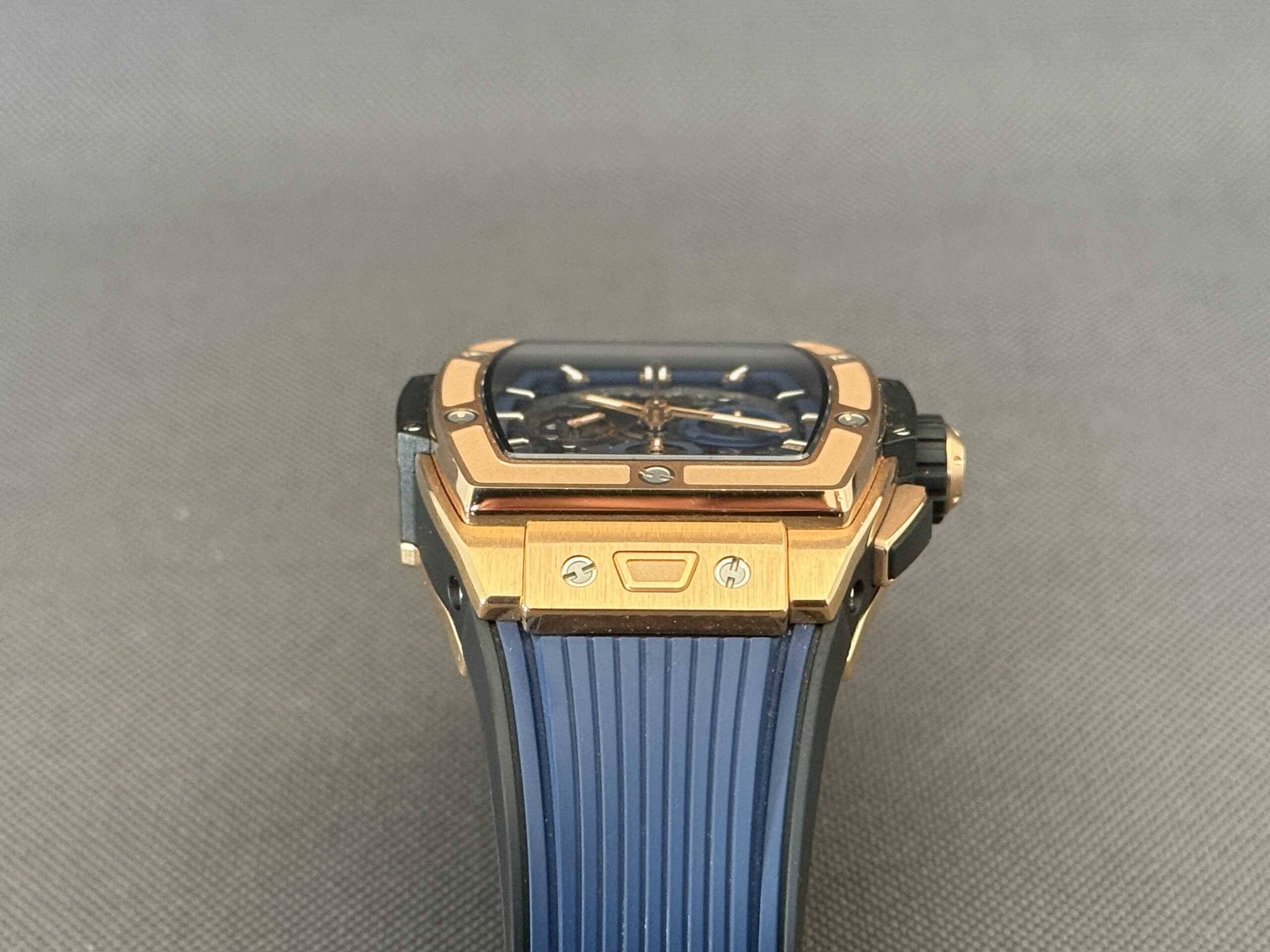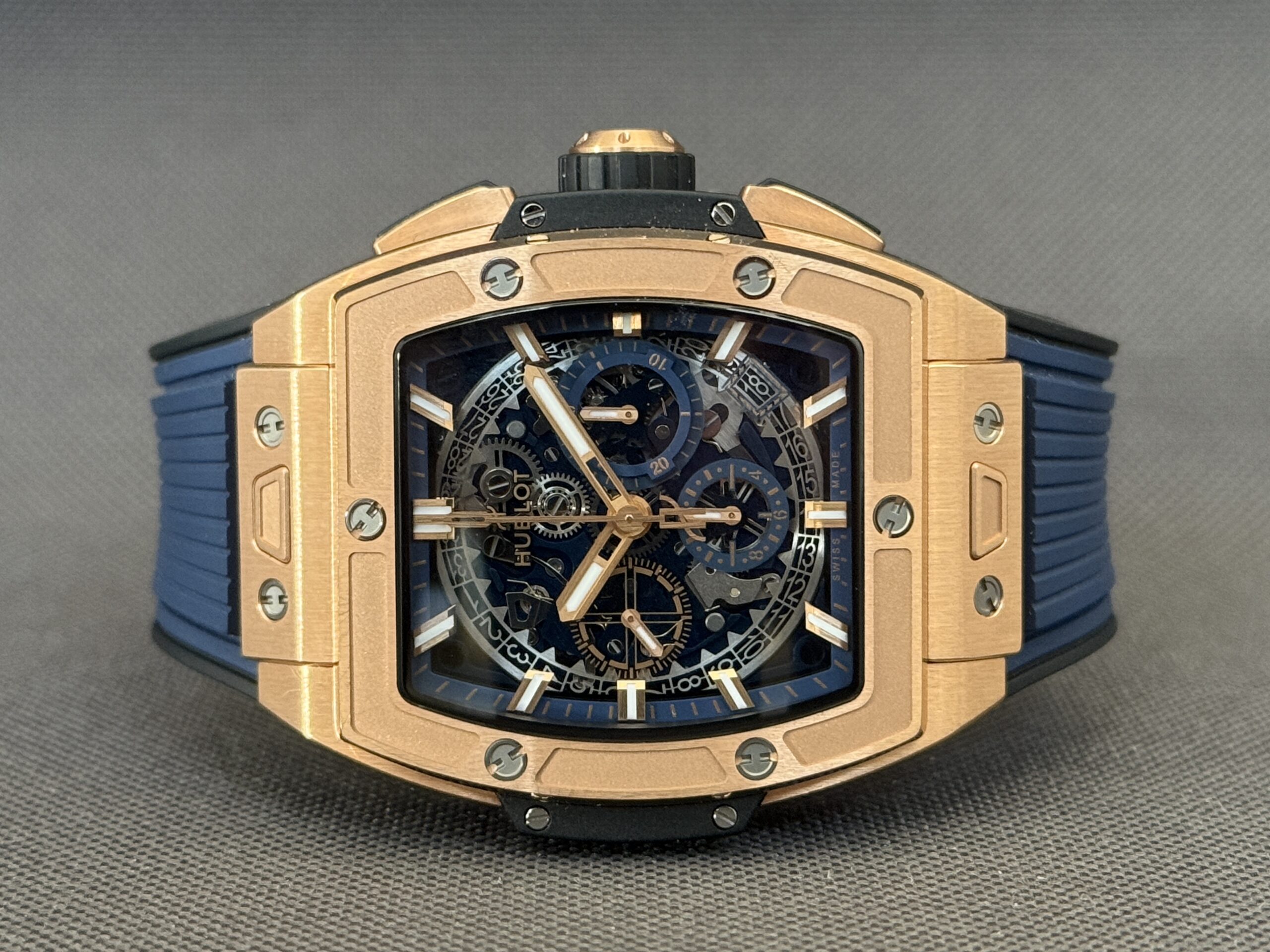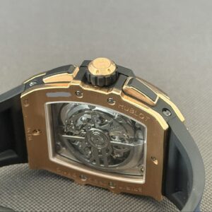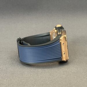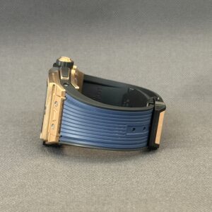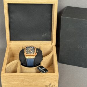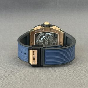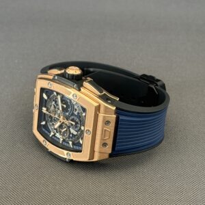 Flot eksemplar af Hublot Spirit of Big Bang i 18 karat rosaguld med skeletteret urskive samt blå gummirem med foldespænde. Bag den gennemsigtige safirbagkasse kan man nyde det automatiske kaliber HUB4700, som yder en gangreserve på 50 timer, chronograph-funktion samt en vandtæthed ned til 100 meter.