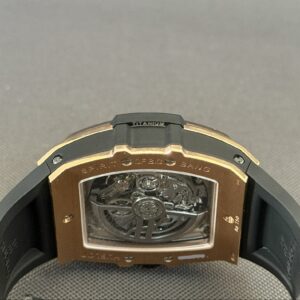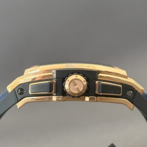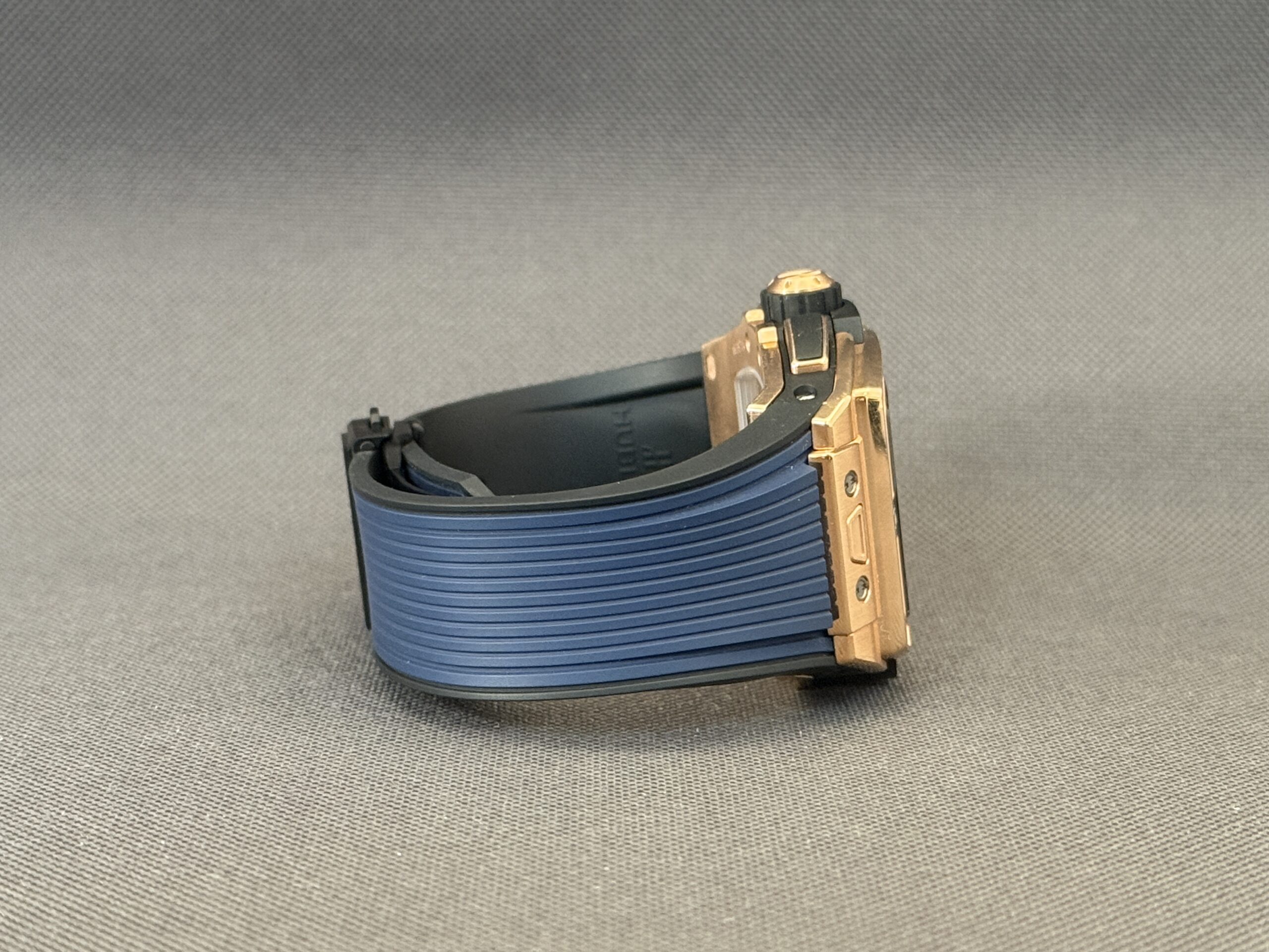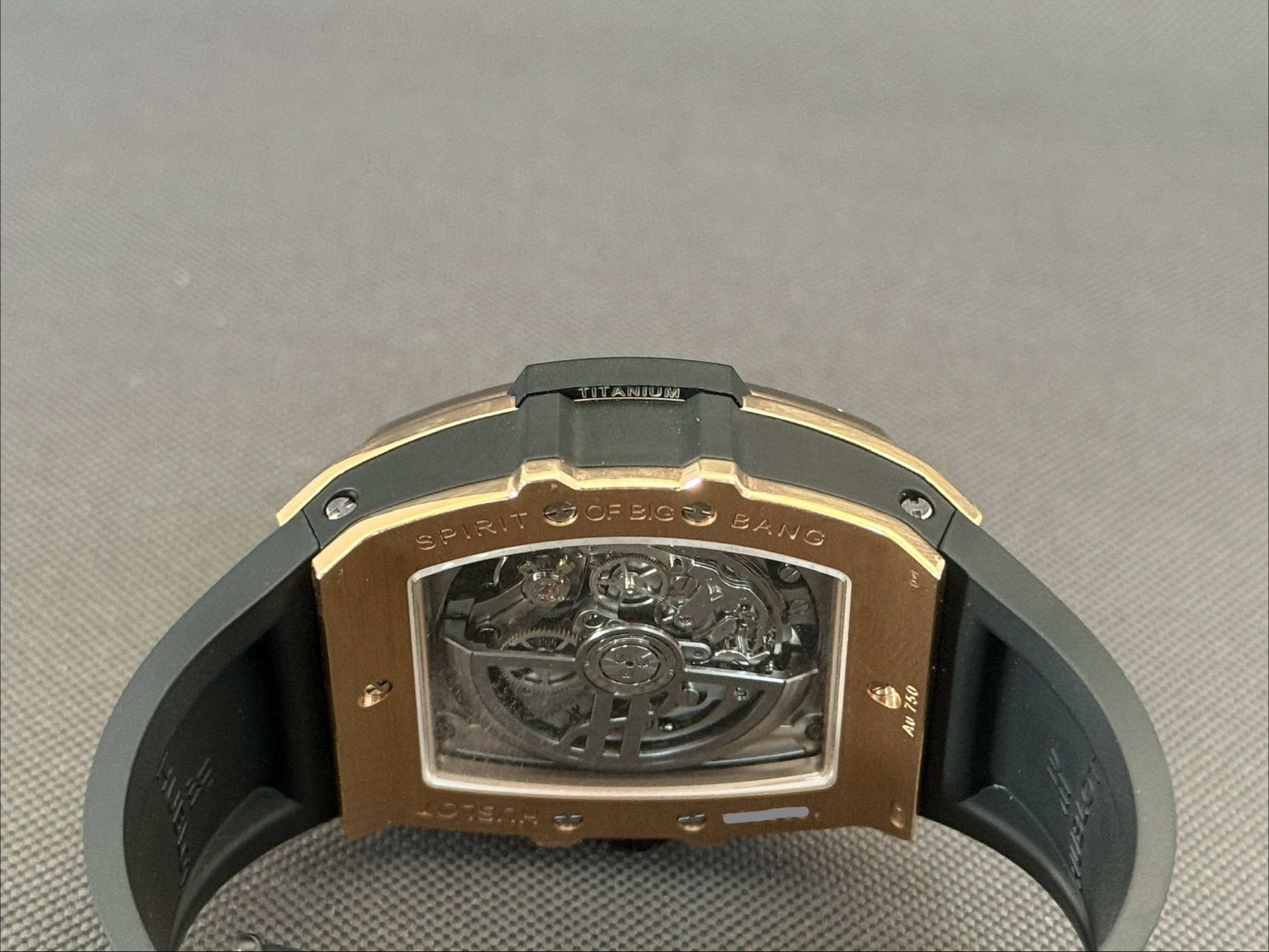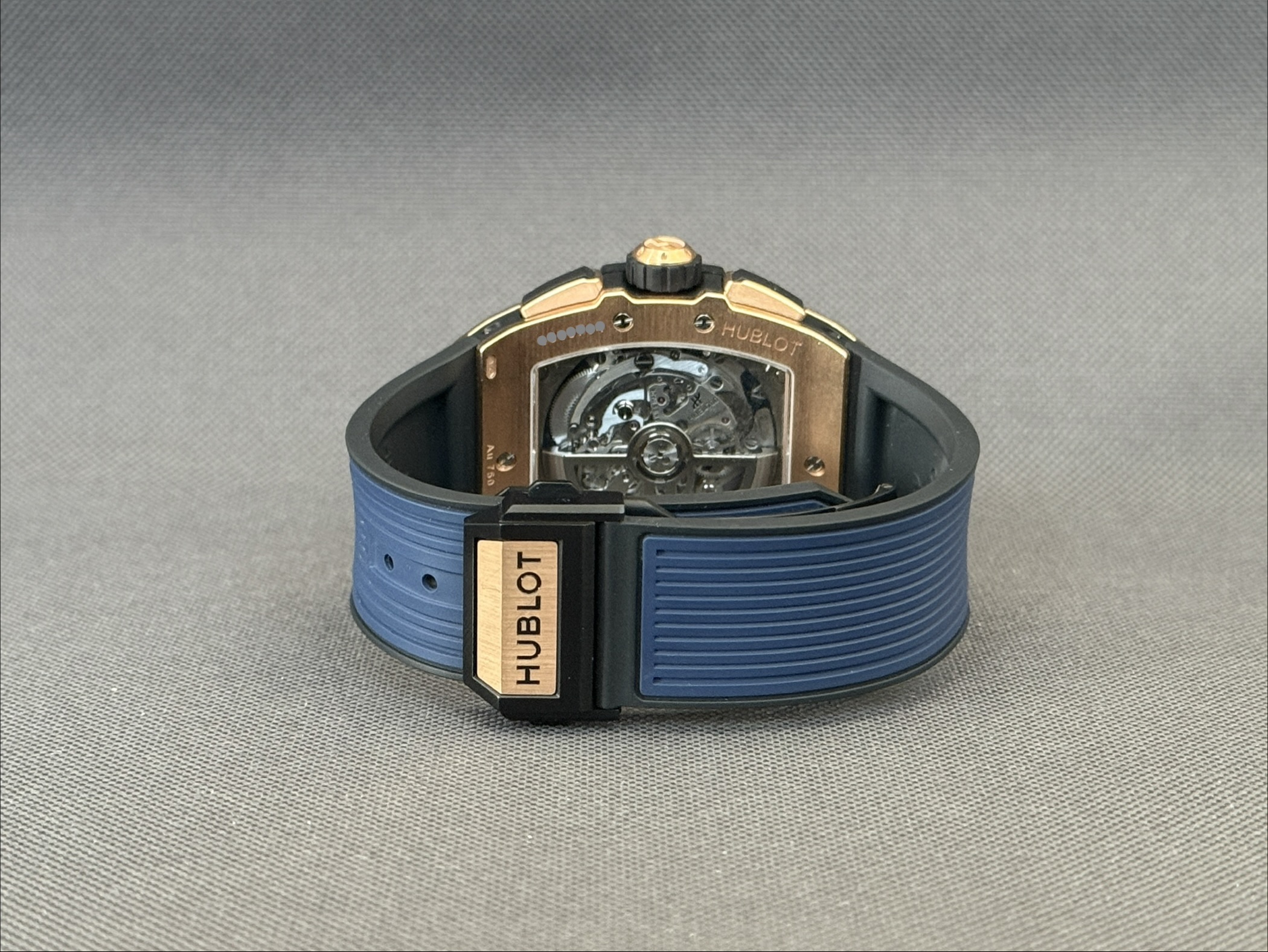 Flot eksemplar af Hublot Spirit of Big Bang i 18 karat rosaguld med skeletteret urskive samt blå gummirem med foldespænde. Bag den gennemsigtige safirbagkasse kan man nyde det automatiske kaliber HUB4700, som yder en gangreserve på 50 timer, chronograph-funktion samt en vandtæthed ned til 100 meter.