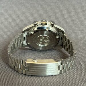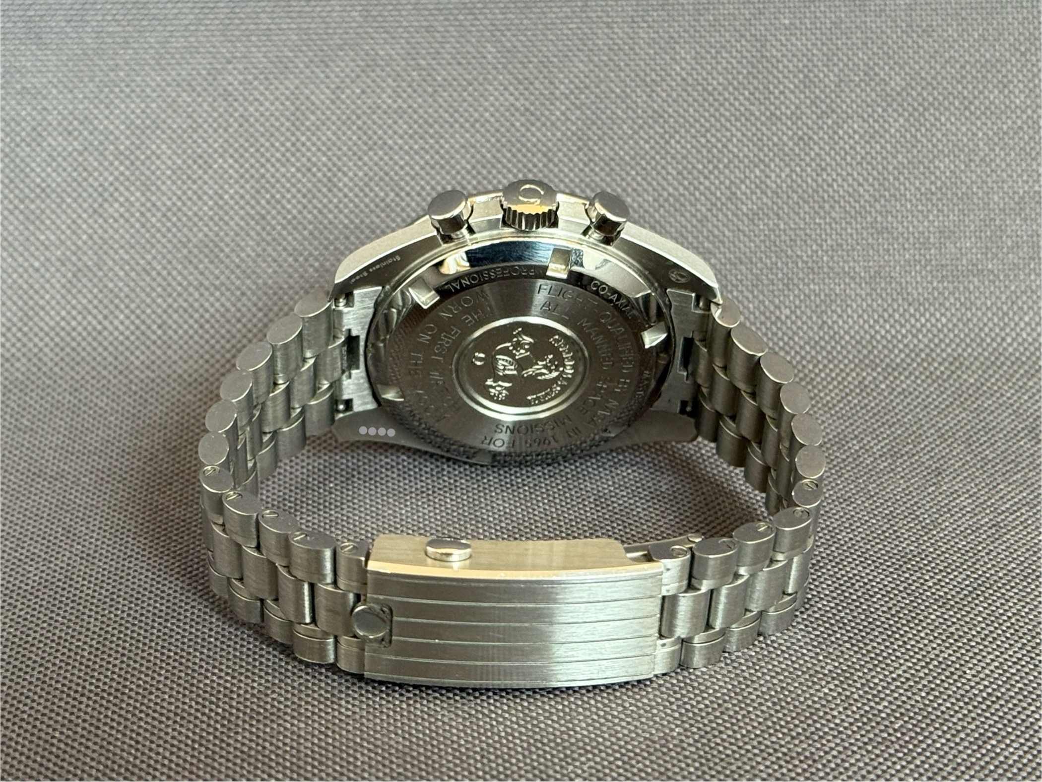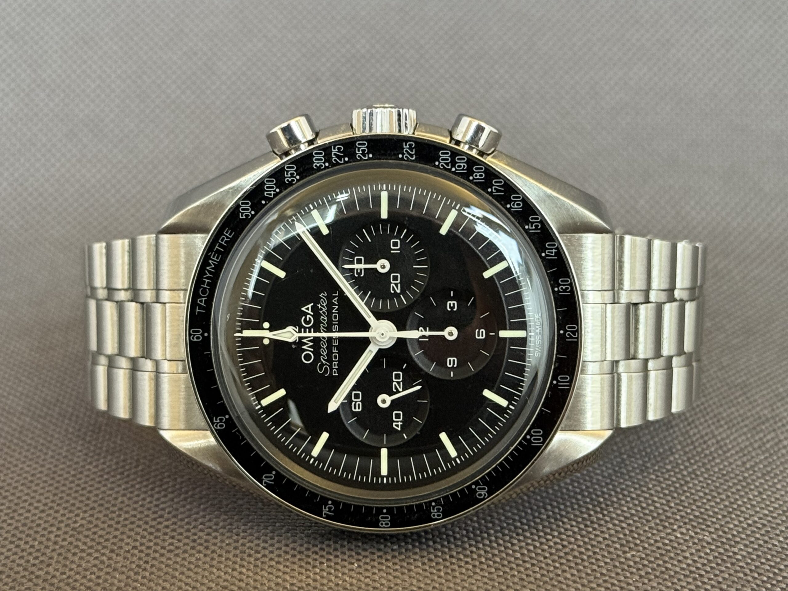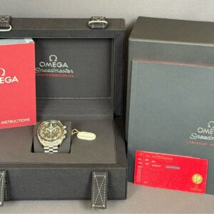 Super flot eksemplar af den populære Omega Speedmaster Moonwatch. Uret er kendt for at være det første ur på månen. Denne reference er i ‘Hesalite’ udgaven med plexiglas og måler 42mm. Gangreserve 50 timer og vandtæt til 50 meter.