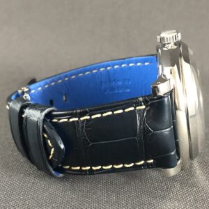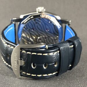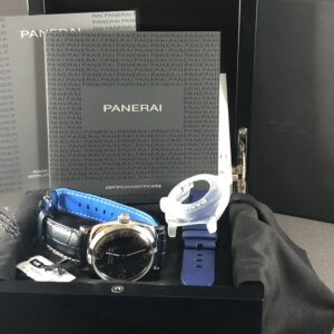Et perfekt eksemplar af Pam 932, der kun er produceret 300 af. Den blå sandwich skive er fantastisk og skal opleves. Blå kroko-rem og C-spænde. Det manuelle værk P. 3000 yder gangreserve på 72 timer og kan betragtes gennem bagkassen i safir. Vandtæthed til 100m.