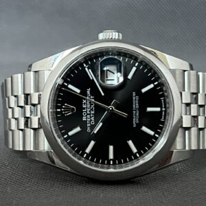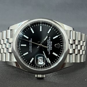 Et klassisk Datejust i stål med sort skive og jubilee lænke. Låsen har easy-link, så man nemt kan justere lænken. Det automatiske værk yder 70 timers gangreserve og en præcision på +/- 2 sek. Vandtæthed til 100m.