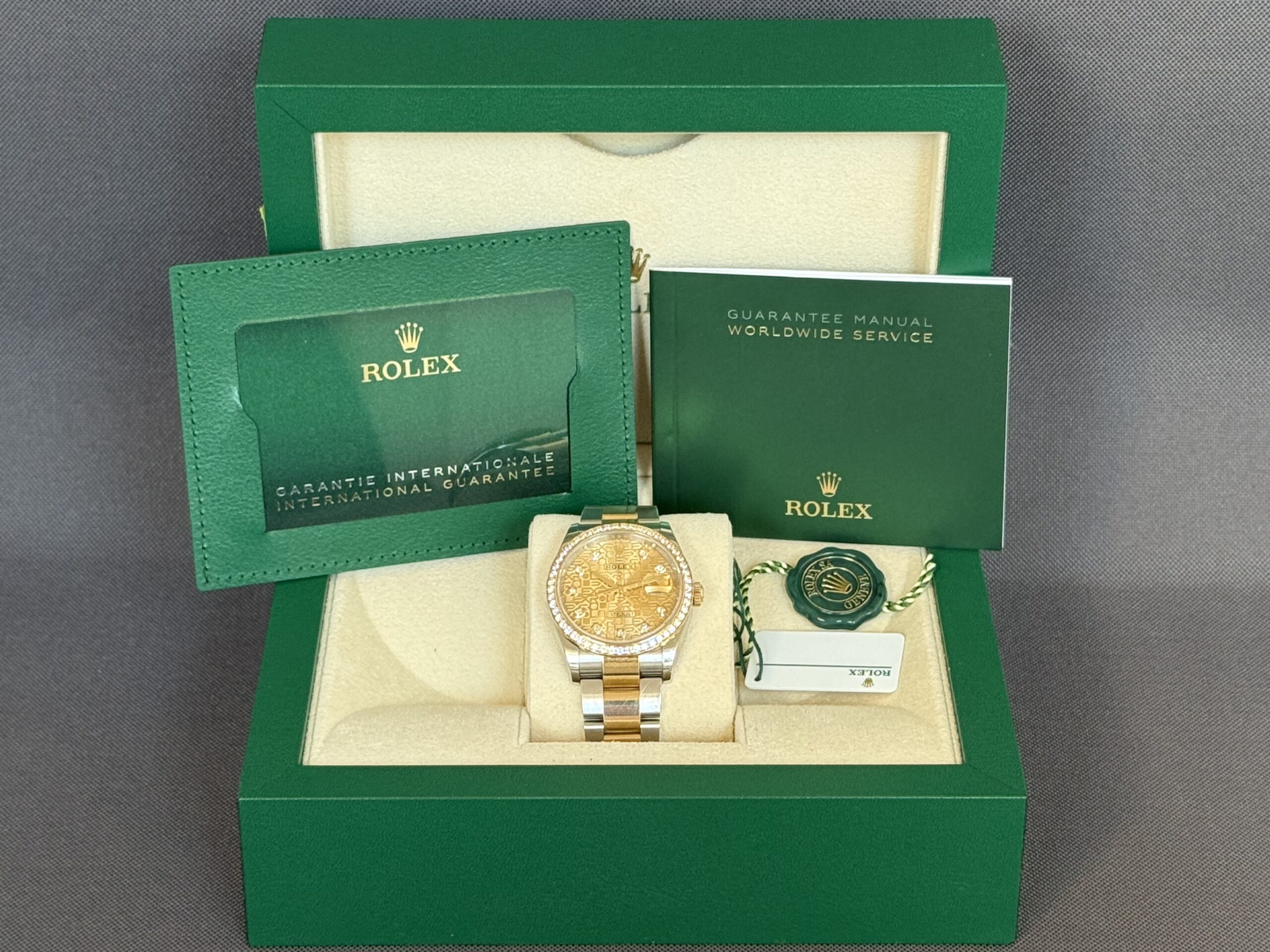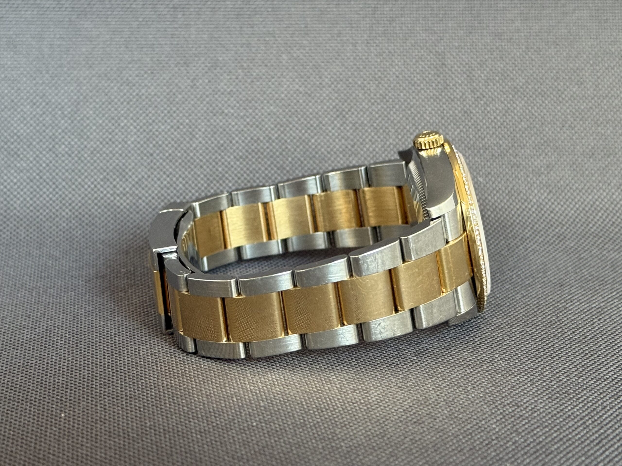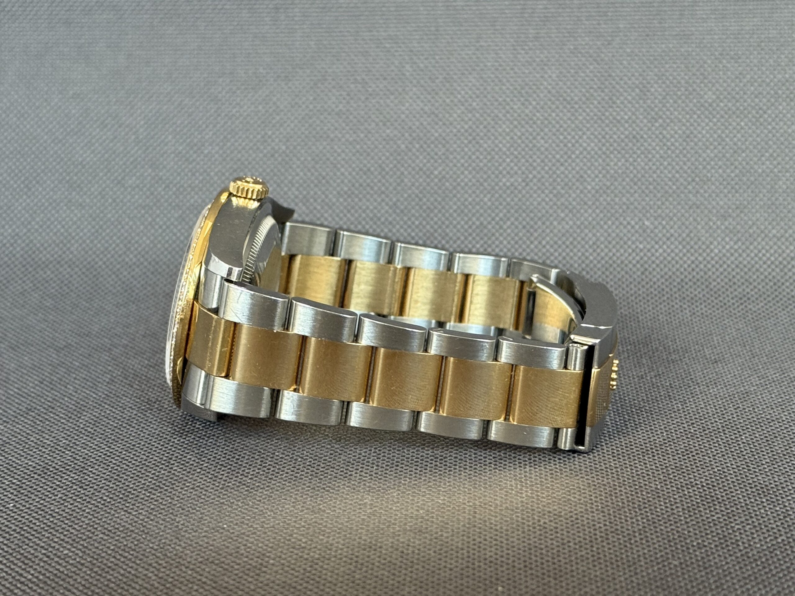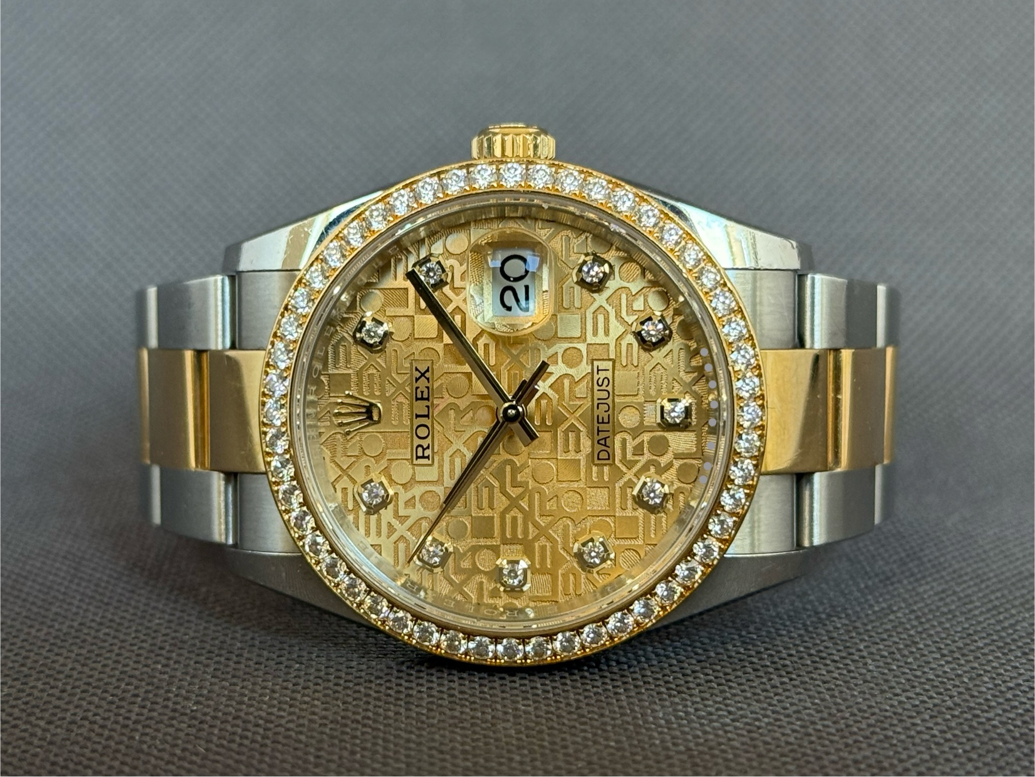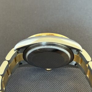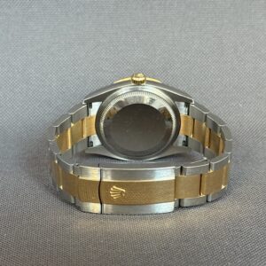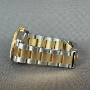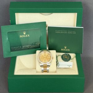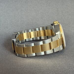 Super smukt two-tone Rolex Datejust RBR som er udsmykket med diamanter i lynetten samt i skiven fra Rolex. Låsen er med easylink som let kan justere urets størrelse i omkreds med 5mm. Gangreserve 70 timer og vandtæthed til 100m.