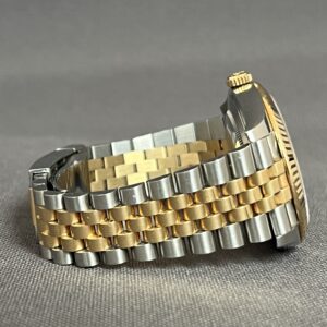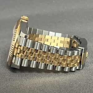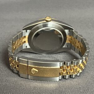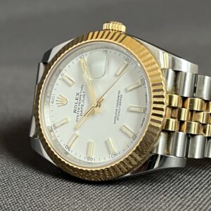 Datejust 41 med hvid skive i 18k guld og stål og jubilee lænke. I låsen kan lænken hurtigt justeres 5mm. Det automatiske værk yder 70 timers gangreserve og har en præcision på +/- 2 sek. Vandtæthed til 100m.
