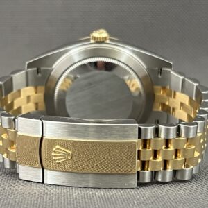 Datejust 41 med sort skive i 18k guld og stål og jubilee lænke. I låsen kan lænken hurtigt justeres 5mm. Det automatiske værk yder 70 timers gangreserve og har en præcision på +/- 2 sek. Vandtæthed til 100m.