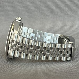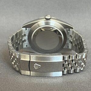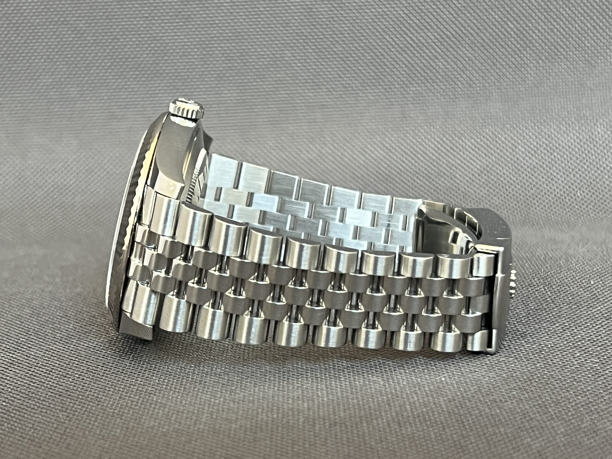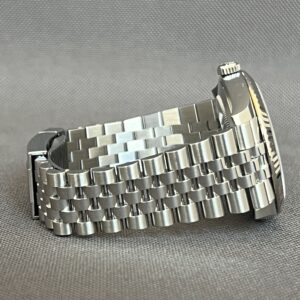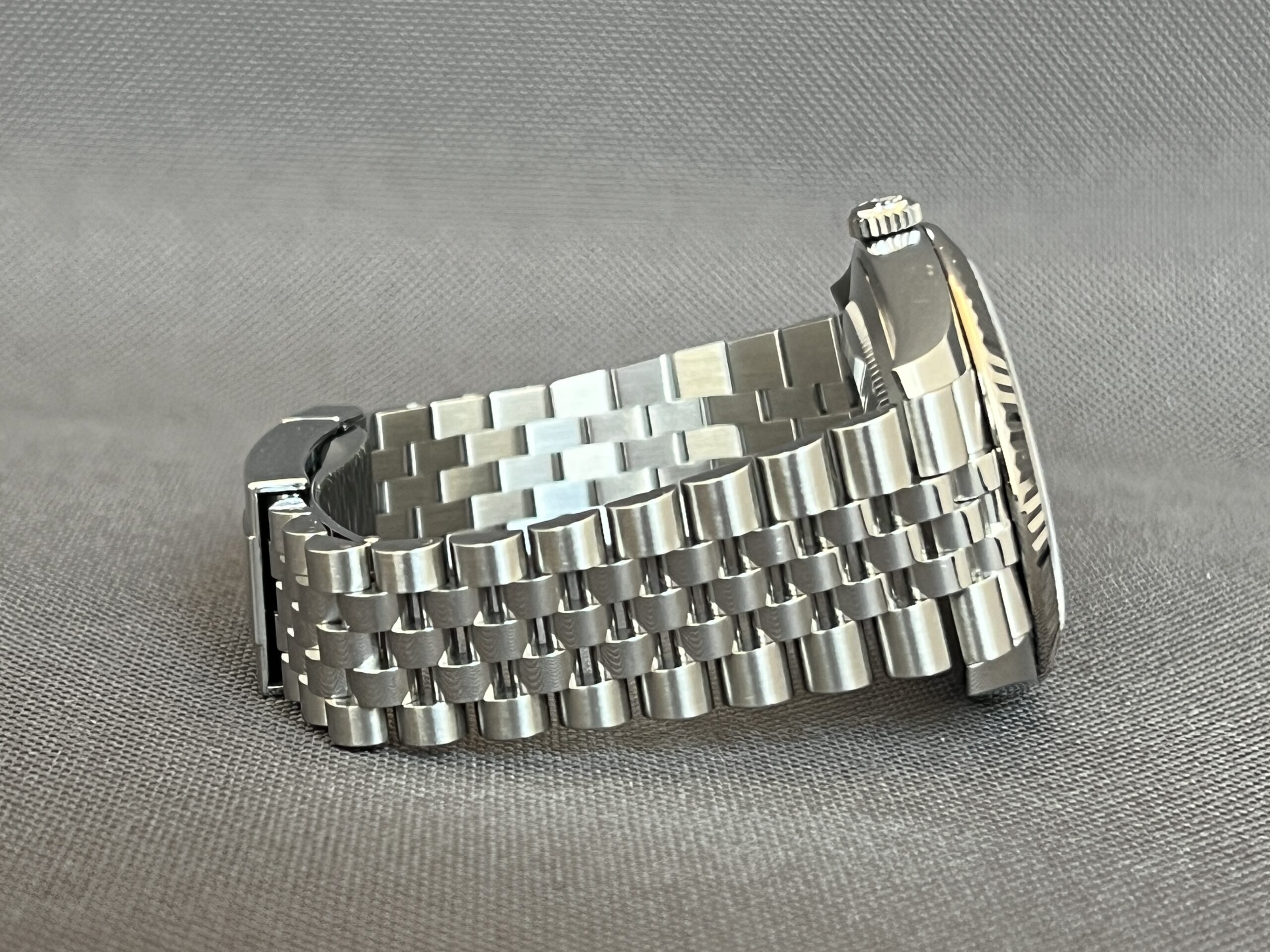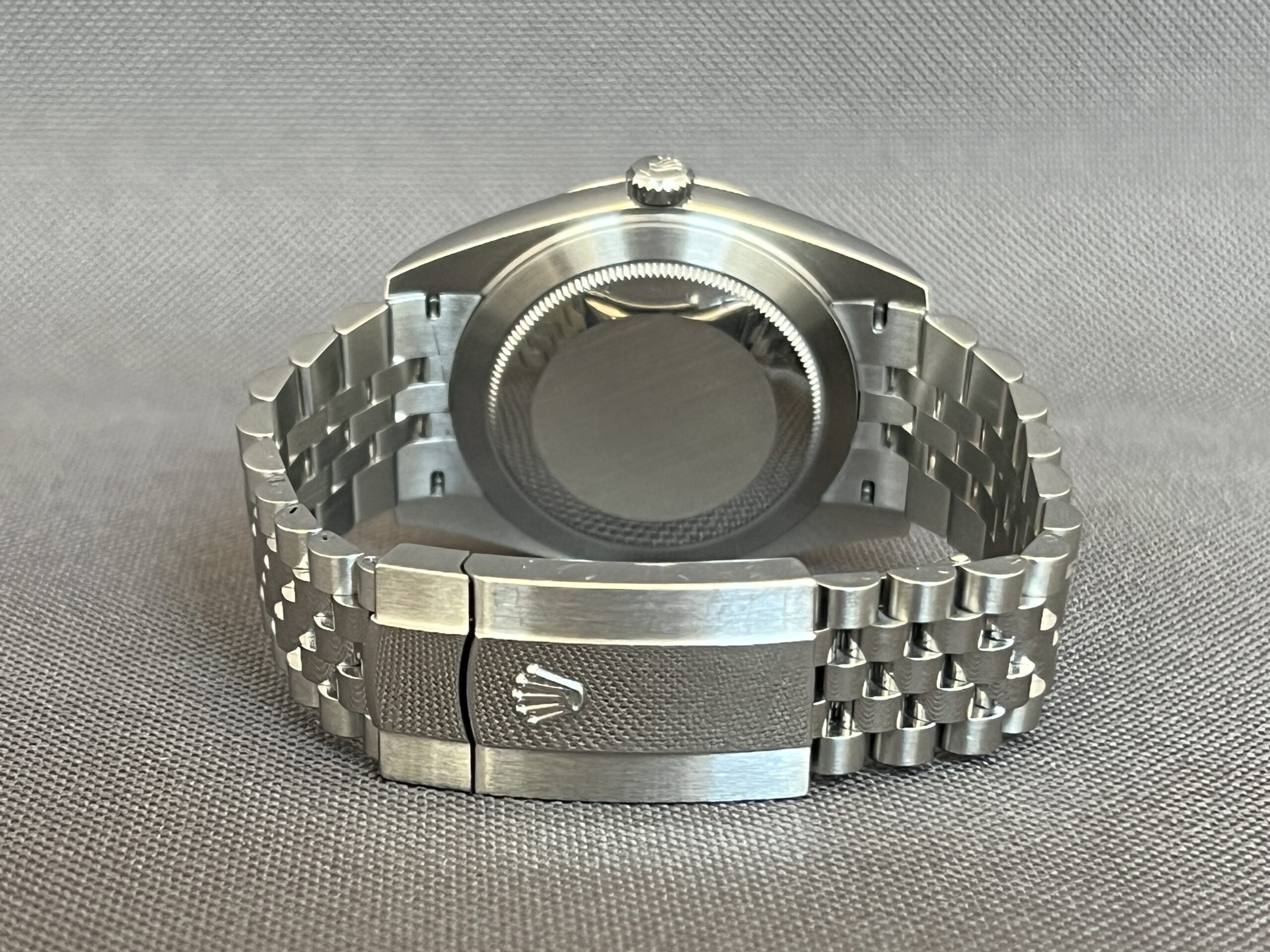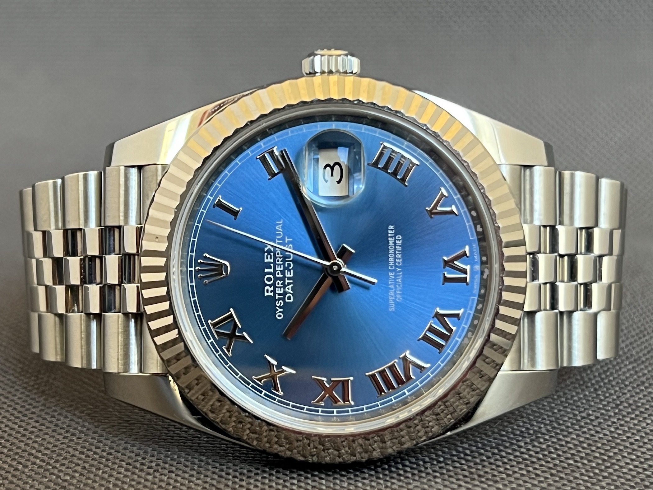 Datejust 41 med den eftertragtede blå skive med romertal, hvidgulskrans og jubilee lænke. I låsen kan lænken hurtigt justeres 5mm. Det automatiske værk yder 70 timers gangreserve og har en præcision på +/- 2 sek. Vandtæthed til 100m.
