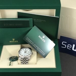Datejust 41 med hvid skive, hvidgulskrans og jubilee lænke. I låsen kan lænken hurtigt justeres 5mm. Det automatiske værk yder 70 timers gangreserve og har en præcision på +/- 2 sek. Vandtæthed til 100m.