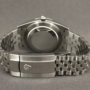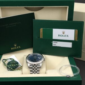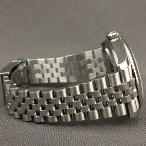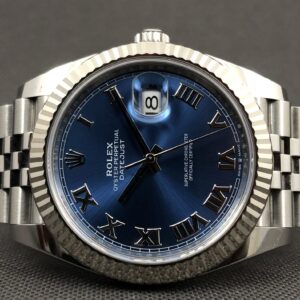 Et flot eksemplar af Datejust 41 med Middelhavsblå skive med romertal, hvidgulskrans og jubilee lænke. I låsen kan lænken hurtigt justeres 5mm. Det automatiske værk yder 70 timers gangreserve og har en præcision på +/- 2 sek. Vandtæthed til 100m.