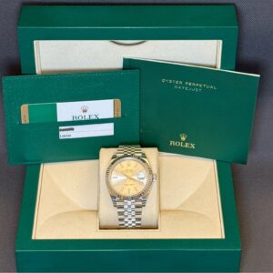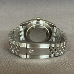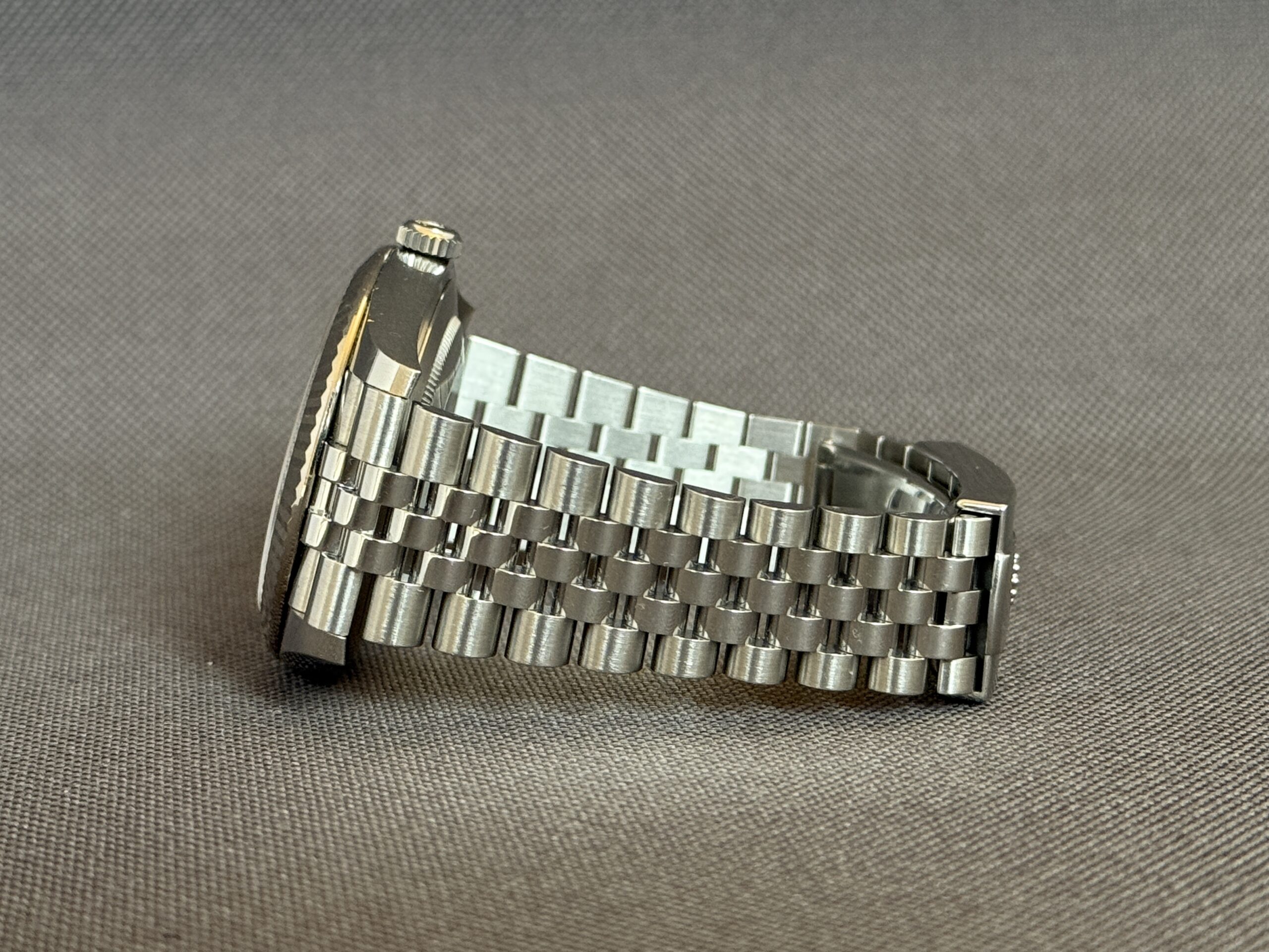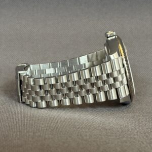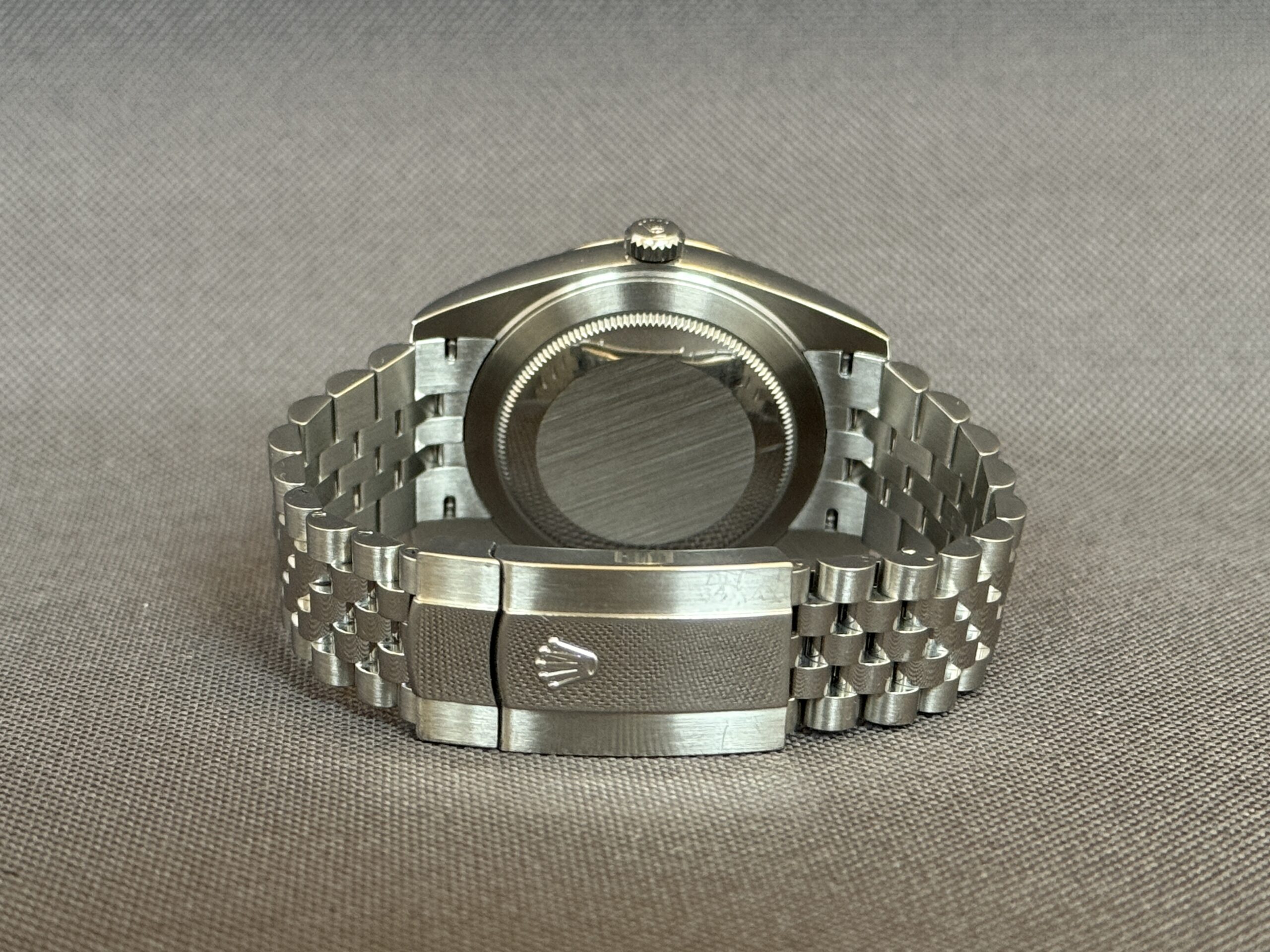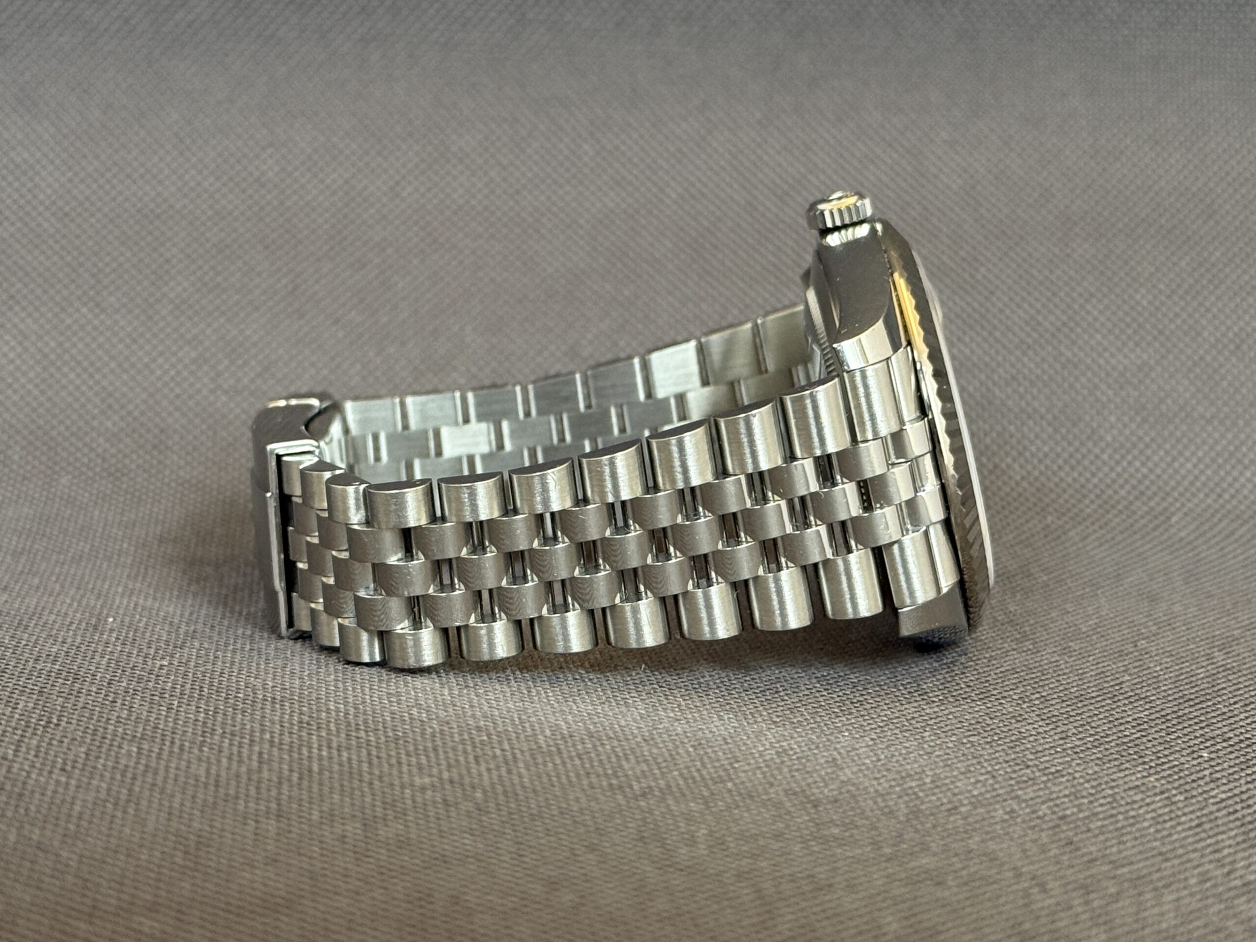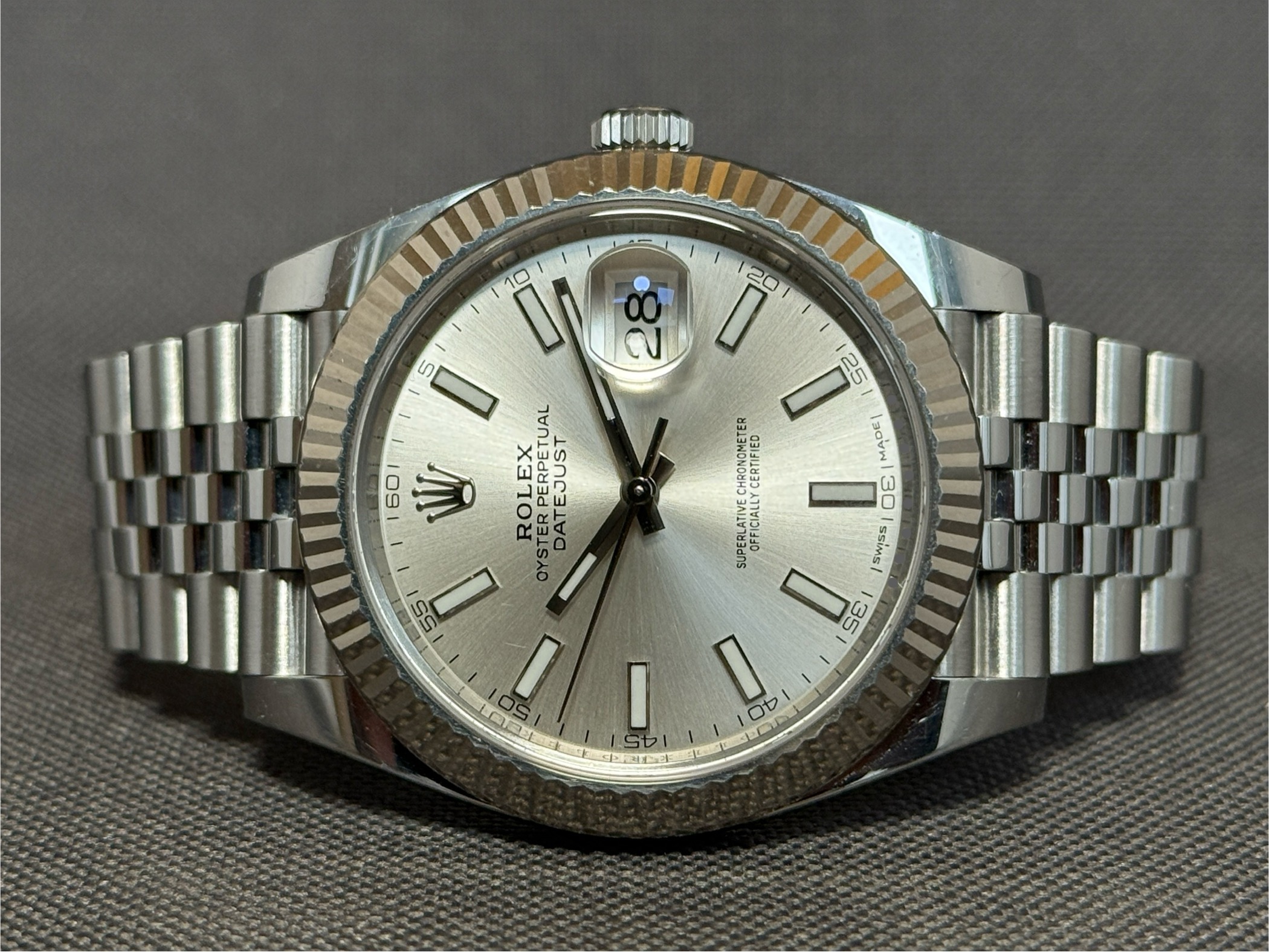 Den populære Datejust 41 med sølv skive, hvidgulskrans og jubilee lænke. I låsen kan lænken hurtigt justeres 5mm for mere komfort. Det automatiske værk yder 70 timers gangreserve og har en præcision på +/- 2 sek. Vandtæthed til 100m.