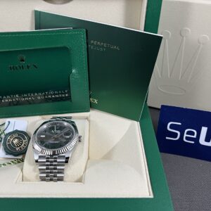 Et NYT eksemplar af Datejust 41 med Wimbledon skive, hvidgulskrans og jubilee lænke. I låsen kan lænken hurtigt justeres 5mm. Det automatiske værk yder 70 timers gangreserve og har en præcision på +/- 2 sek. Vandtæthed til 100m.