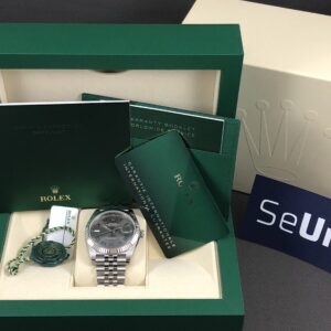 Et NYT eksemplar af Datejust 41 med Wimbledon skive, hvidgulskrans og jubilee lænke. I låsen kan lænken hurtigt justeres 5mm. Det automatiske værk yder 70 timers gangreserve og har en præcision på +/- 2 sek. Vandtæthed til 100m.