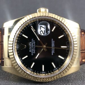 Et eksklusivt Datejust i 18k guld med sortskive, kroko-rem og lås i 18k guld. Det robuste værk 3135 yder gangreserve på 48 timer. Vandtæthed til 100m.