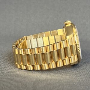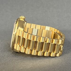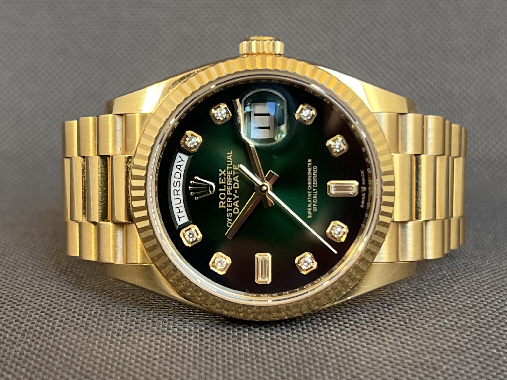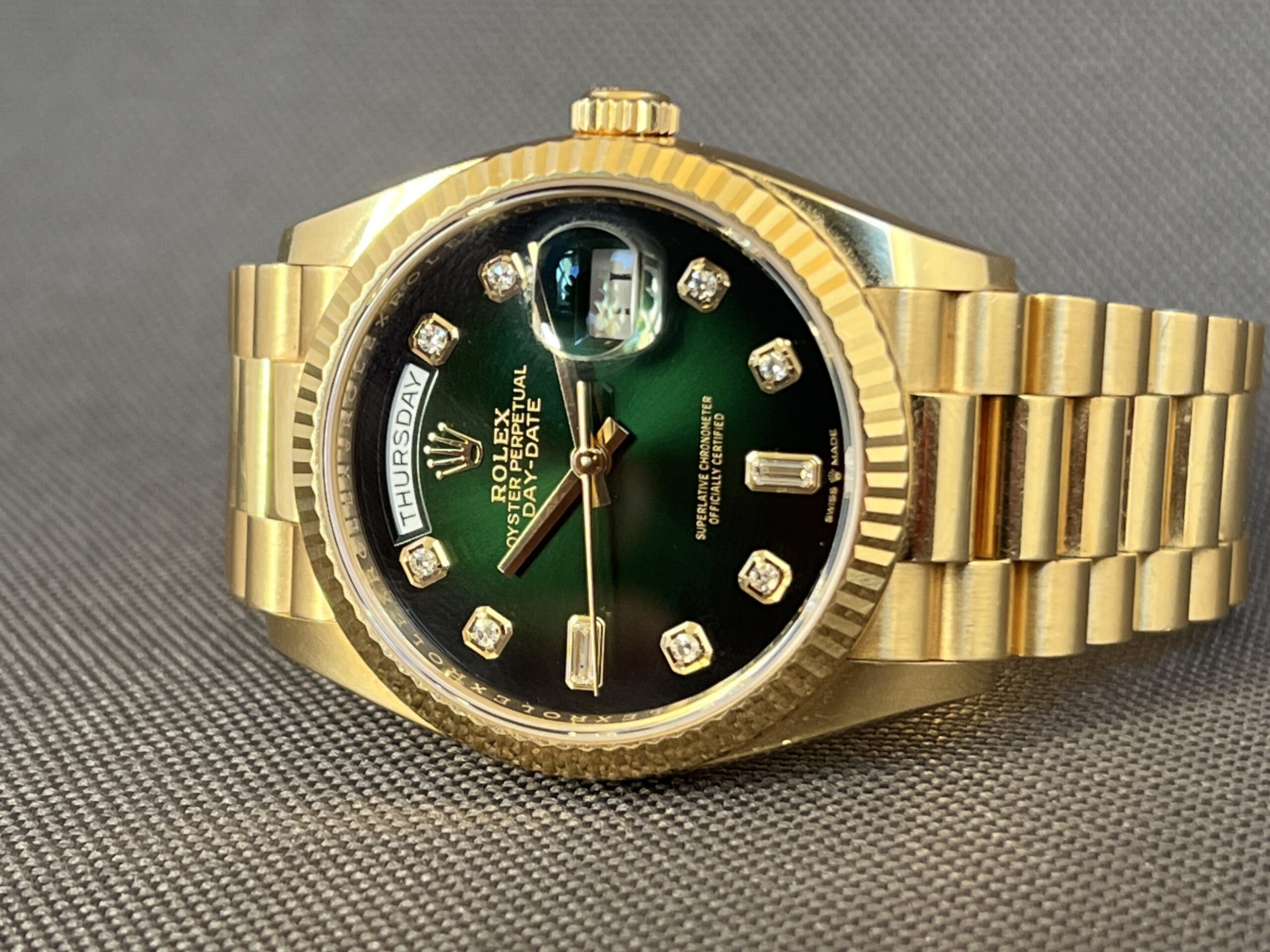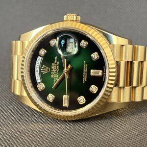 Smukt Rolex Day-Date 36 i gul guld med den eftertragtede grønne Ombré skive med diamanter. Det automatiske værk yder 70 timers gangreserve. Vandtæthed til 100m.