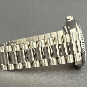 Det eksklusive DAY-DATE 40 i hvidguld, flutet bezel, president lænke og blå skive med romertal. Dette eksemplar er i super flot stand. Det automatiske værk kaliber 3255 yder 70 timers gangreserve og en præcision på +/- 2sek. Vandtæthed til 100m. Nuværende listepris er 363.000kr.