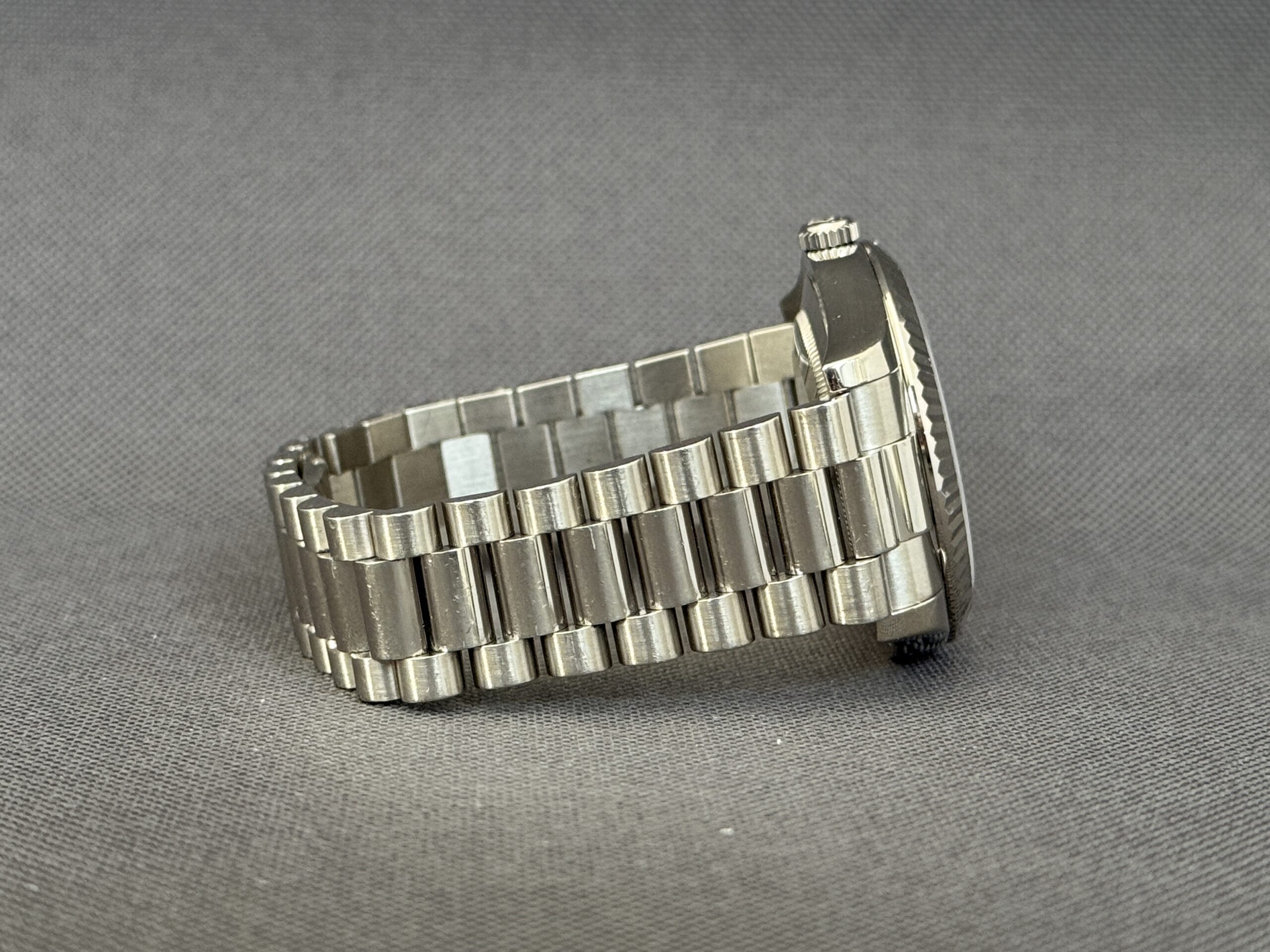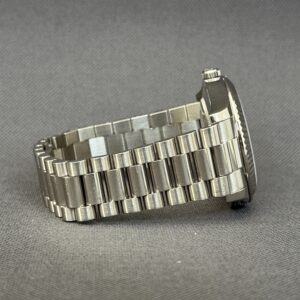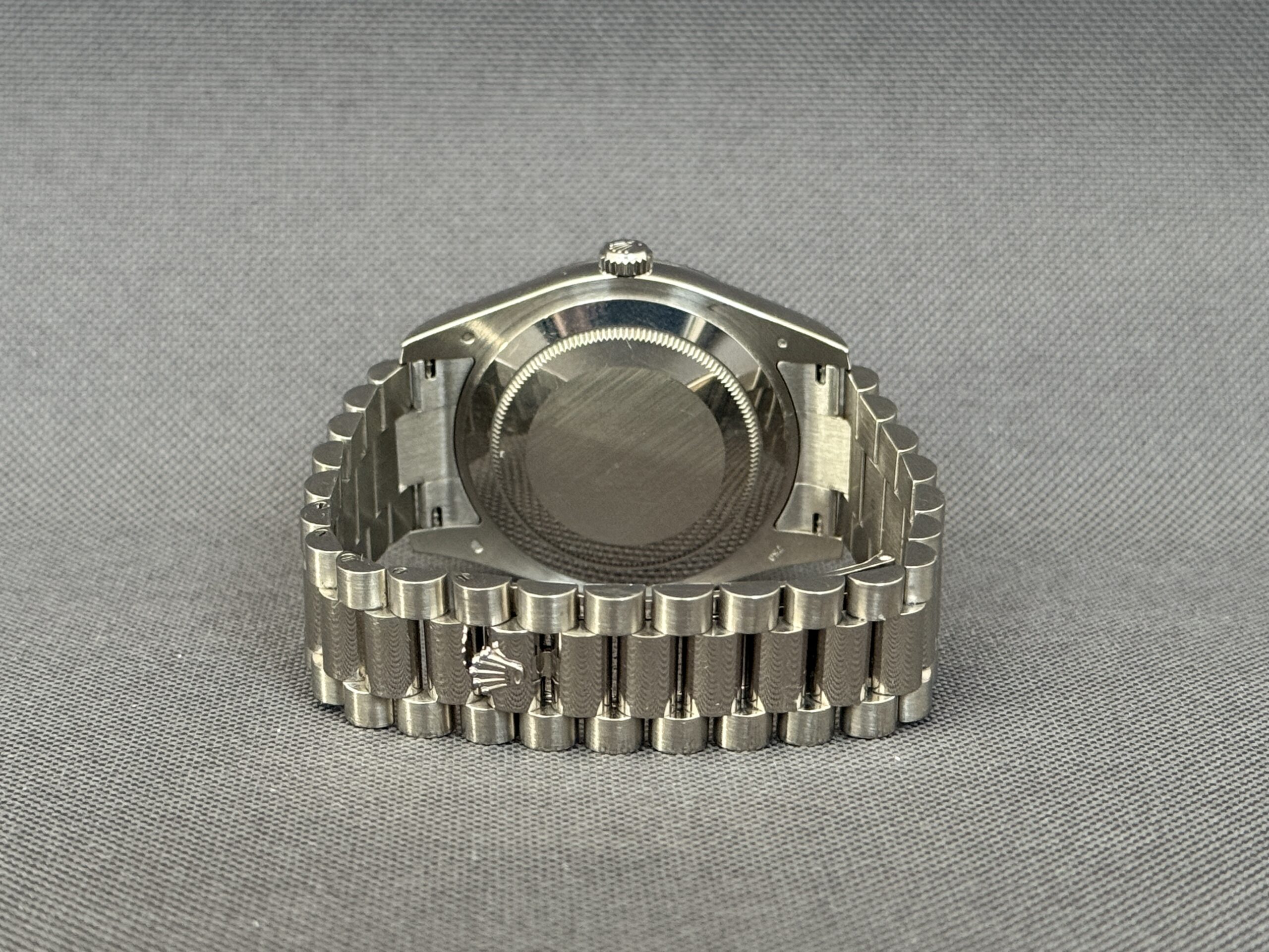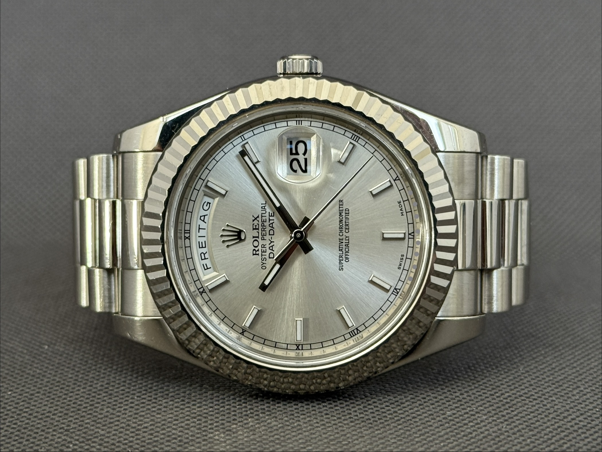 Et smukt Day-Date II i hvidguld med sølv skive og president lænke. Det automatiske værk yder 48 timers gangreserve. Vandtæthed til 100m.