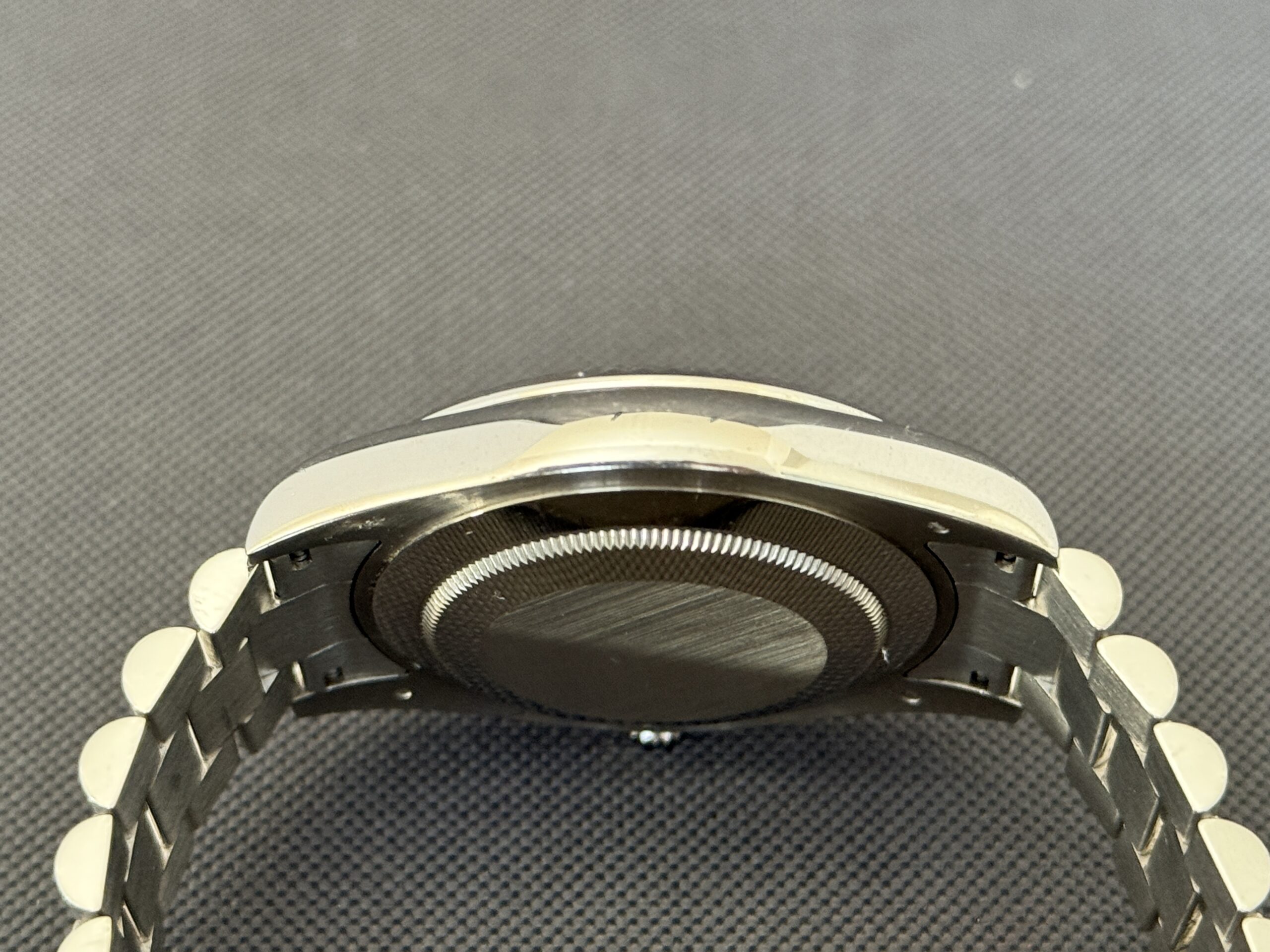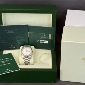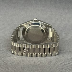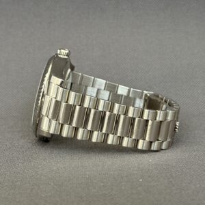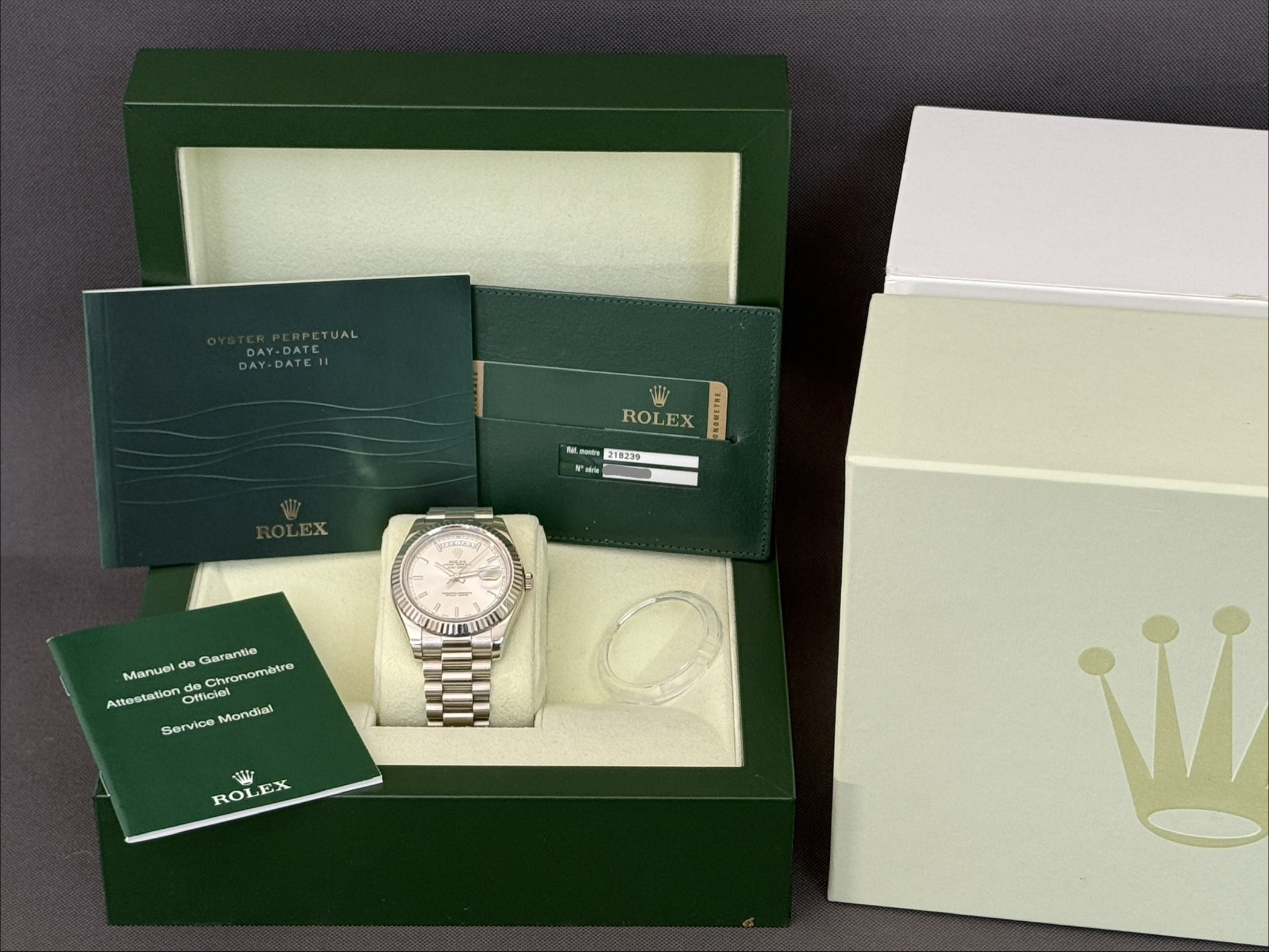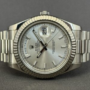 Et smukt Day-Date II i hvidguld med sølv skive og president lænke. Det automatiske værk yder 48 timers gangreserve. Vandtæthed til 100m.
