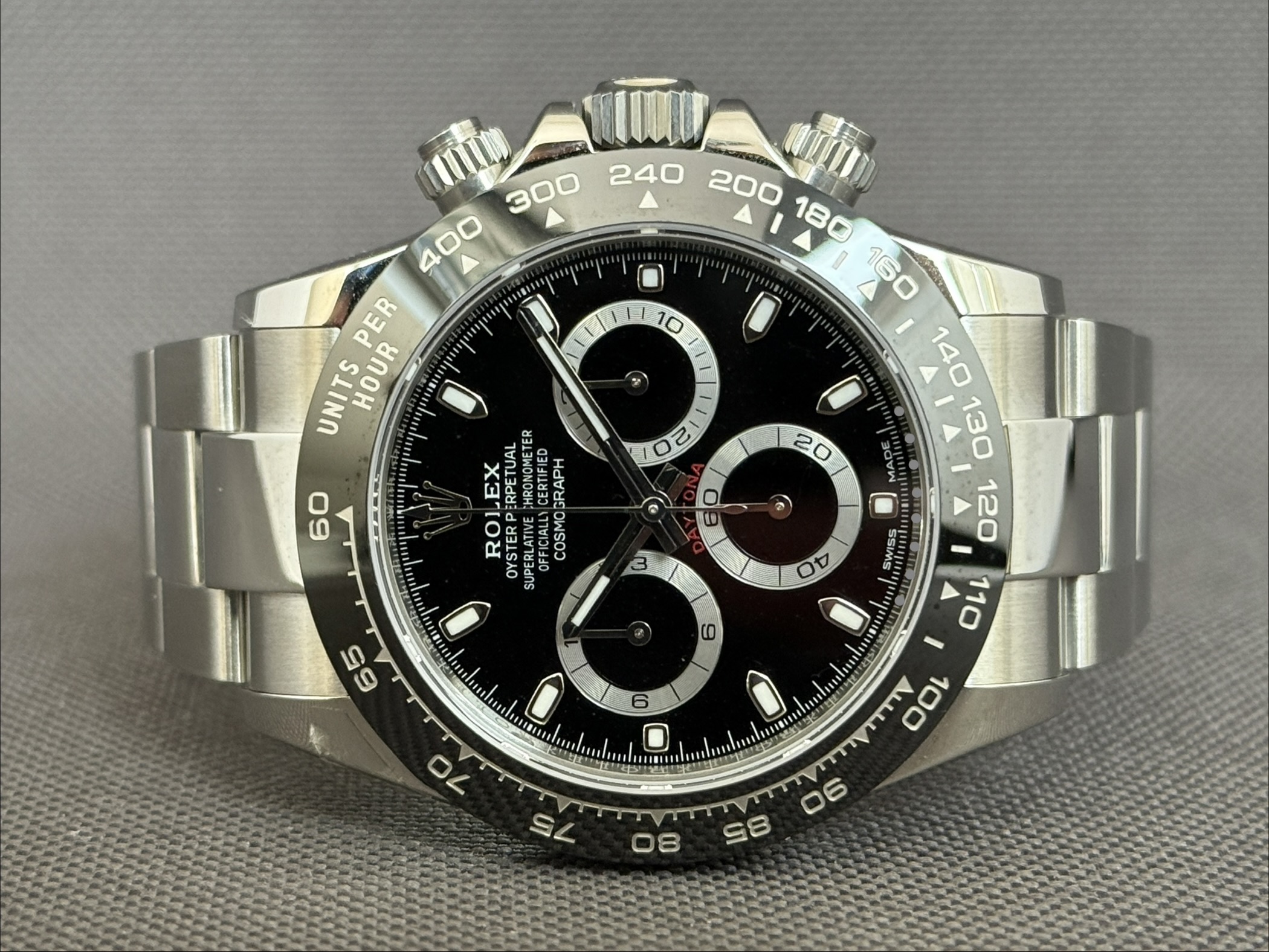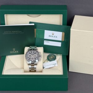 Nyt og ubrugt komplet sæt af det eftertragtede Daytona i stål med sort skive og sort keramisk krans. Det automatiske værk kaliber 4130 yder 72 timers gangreserve. Vandtæthed til 100m.