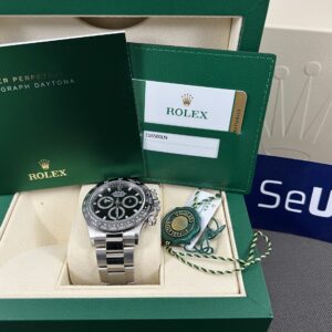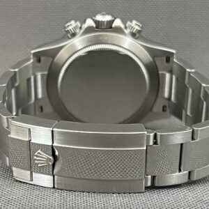Komplet Klarlund sæt af det eftertragtede Daytona i stål med sort skive og sort keramisk krans. Uret fremstår upoleret med hairlines fra almindelig brug. Det automatiske værk kaliber 4130 yder 72 timers gangreserve. Vandtæthed til 100m.