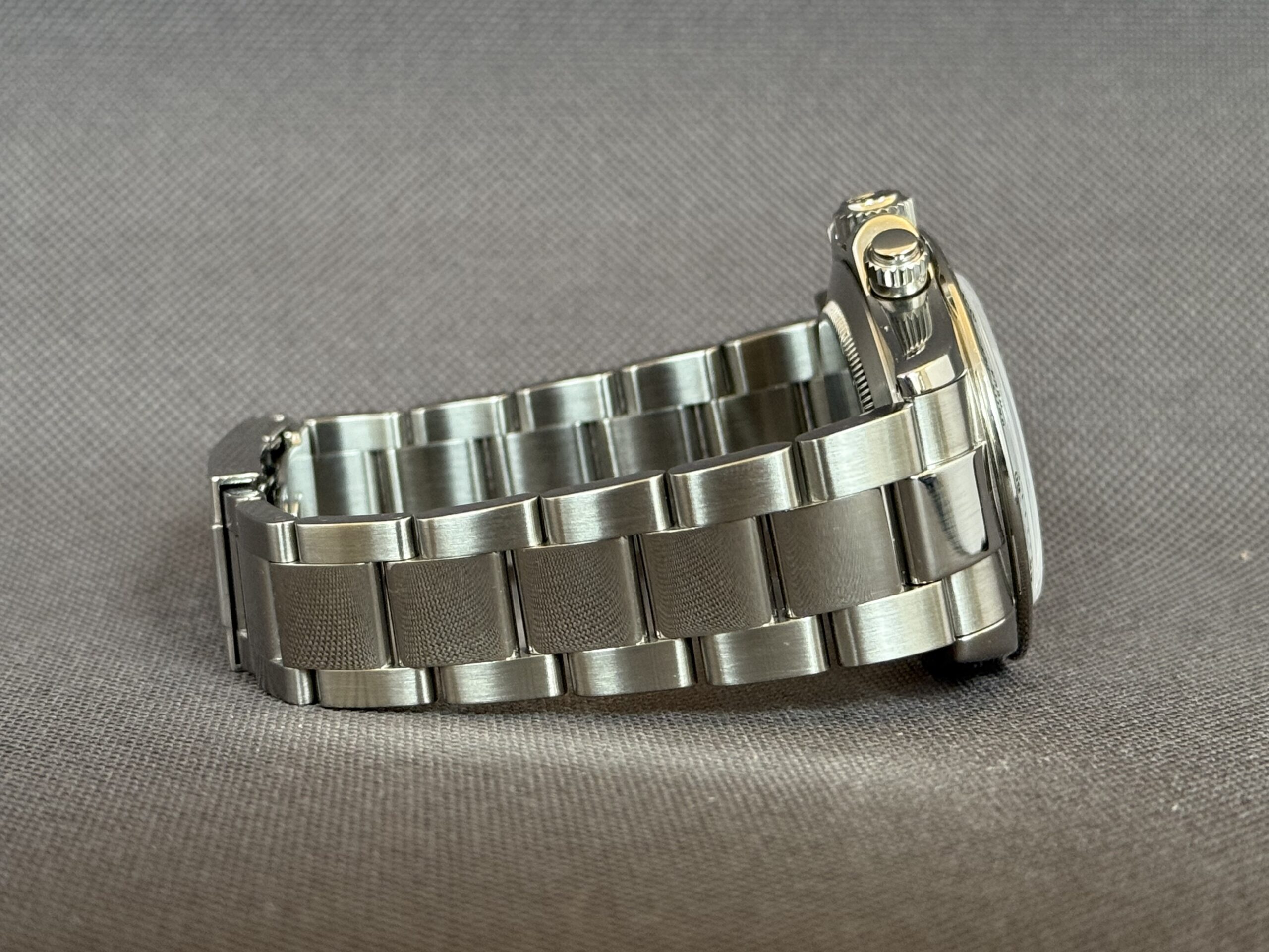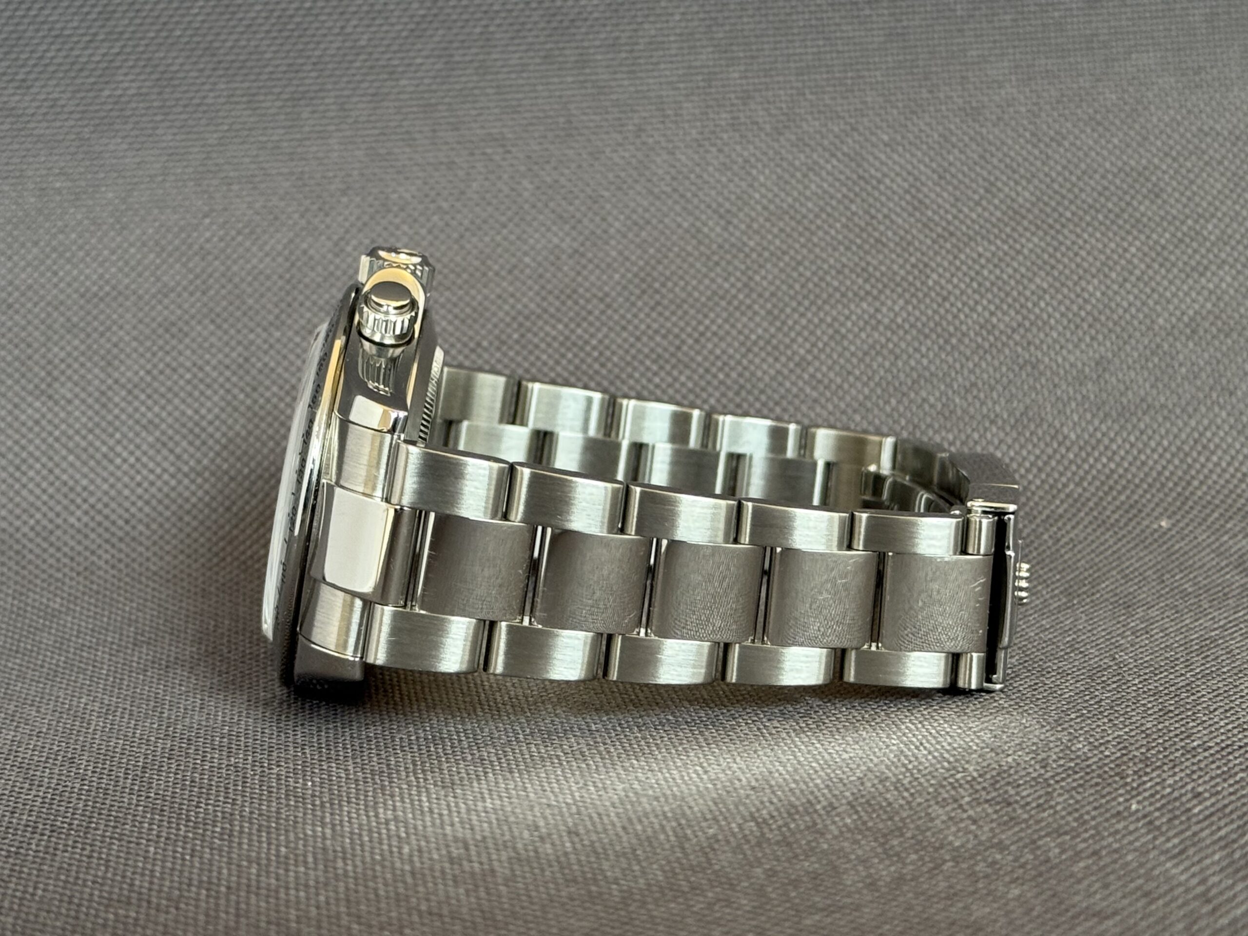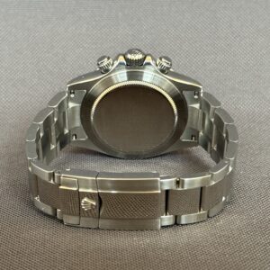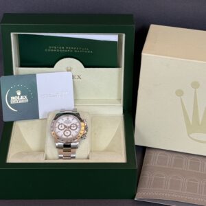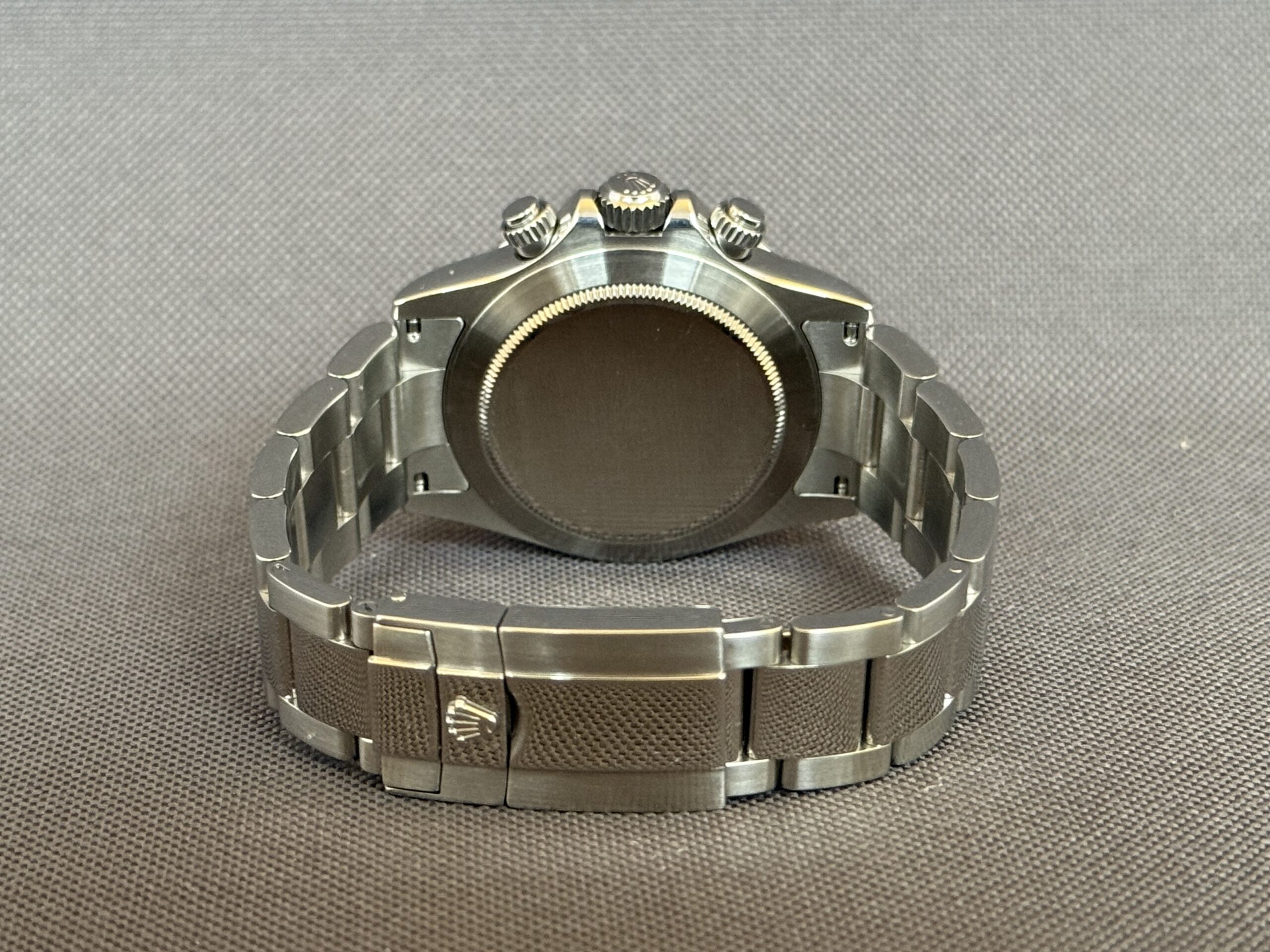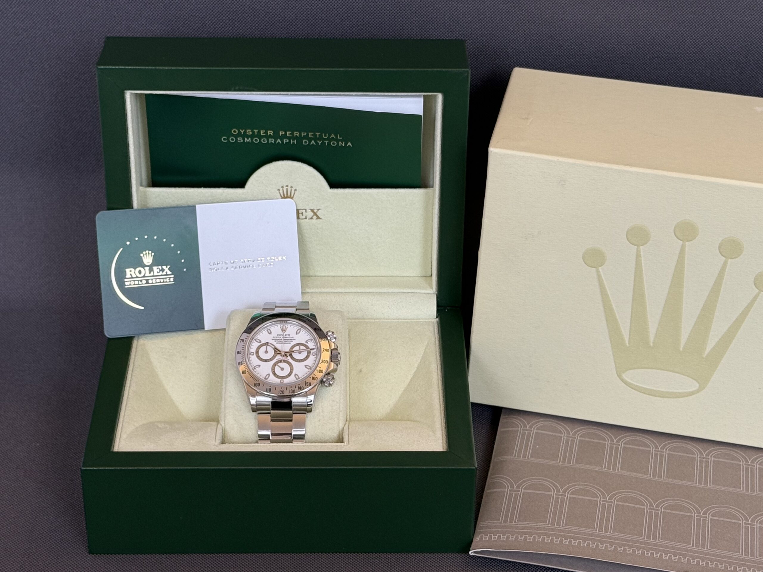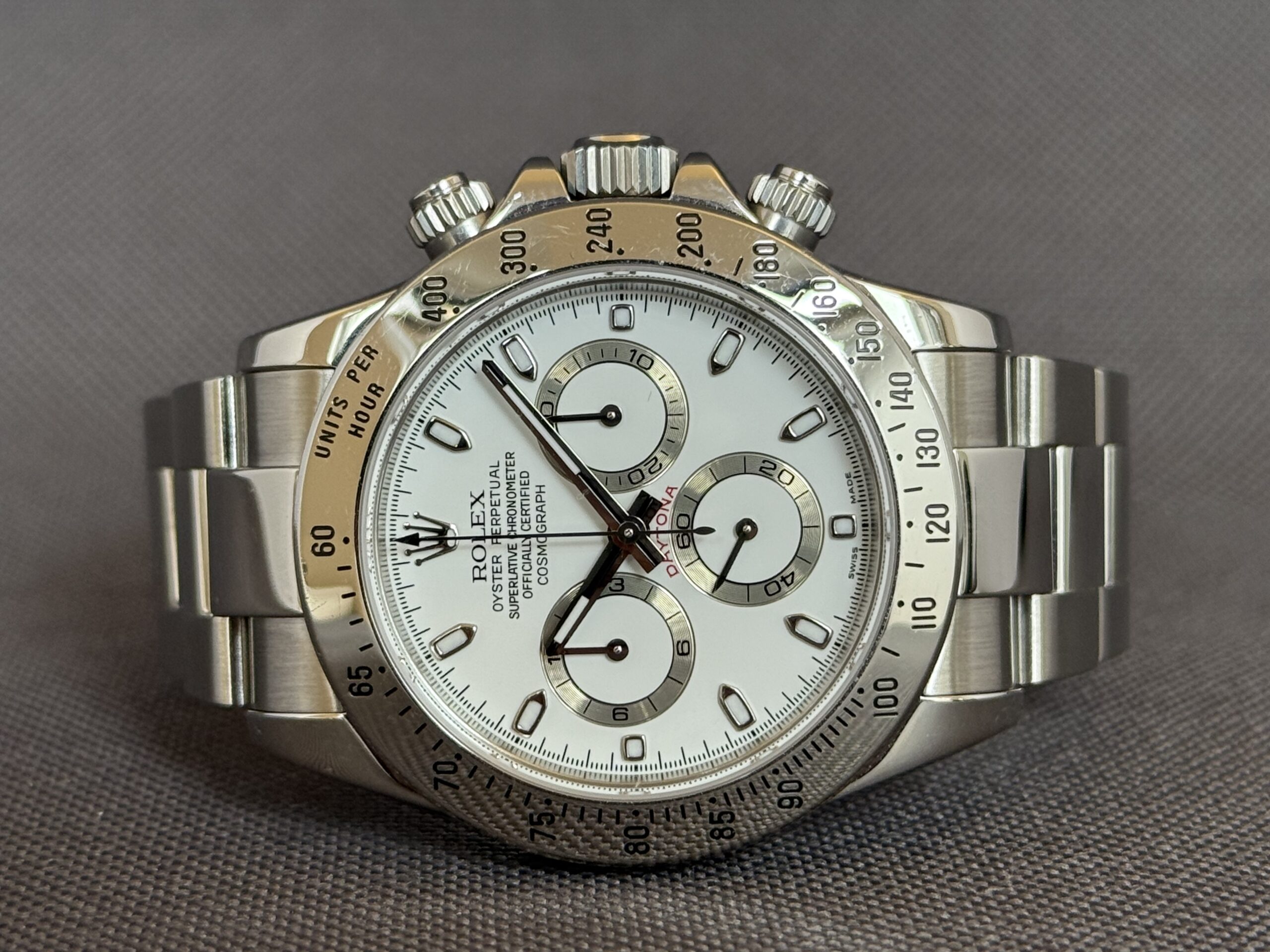 Den populære Daytona Chronograph ref. 116520 med hvid skive, uret er i pæn stand og kommer med servicebevis fra Rolex 2025. Gangreserve 72 timer og vandtæt til 100 meter.