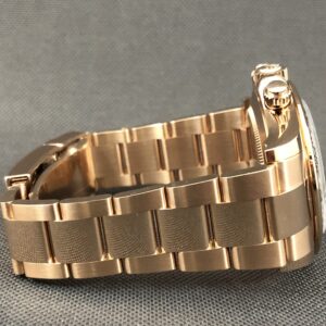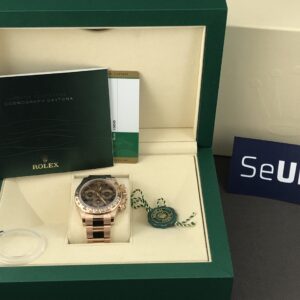 Rolex Daytona i en eksklusiv udgave. Her i rosa-guld med den udgåede chokolade-skive med arabertal. Det automatiske værk kaliber 4130 yder 72 timers gangreserve. Vandtæthed til 100m.