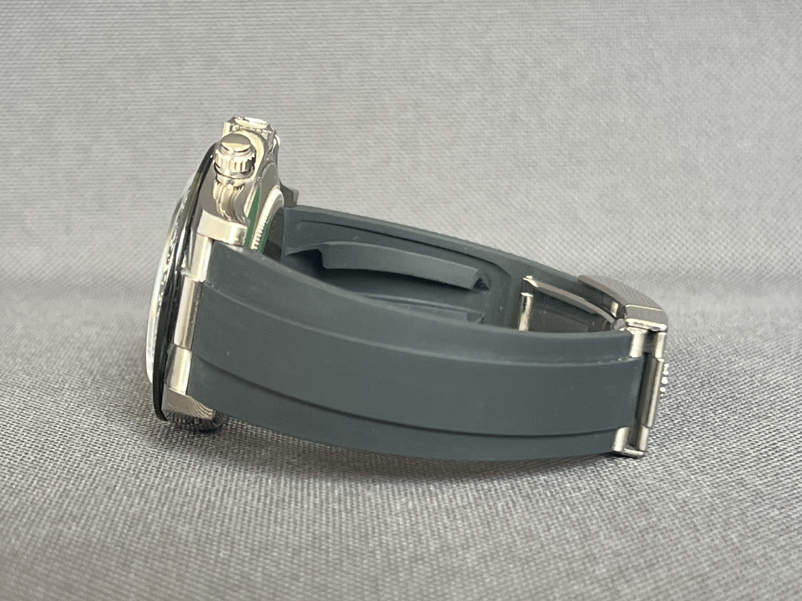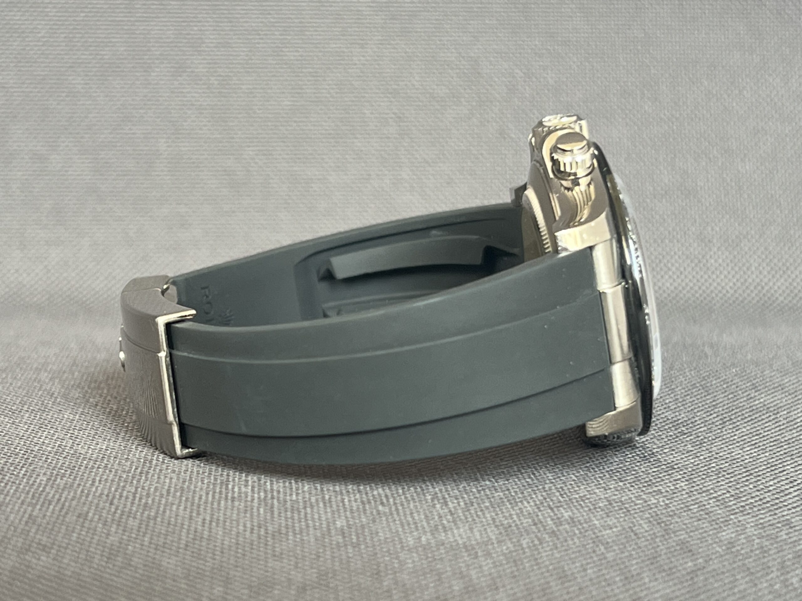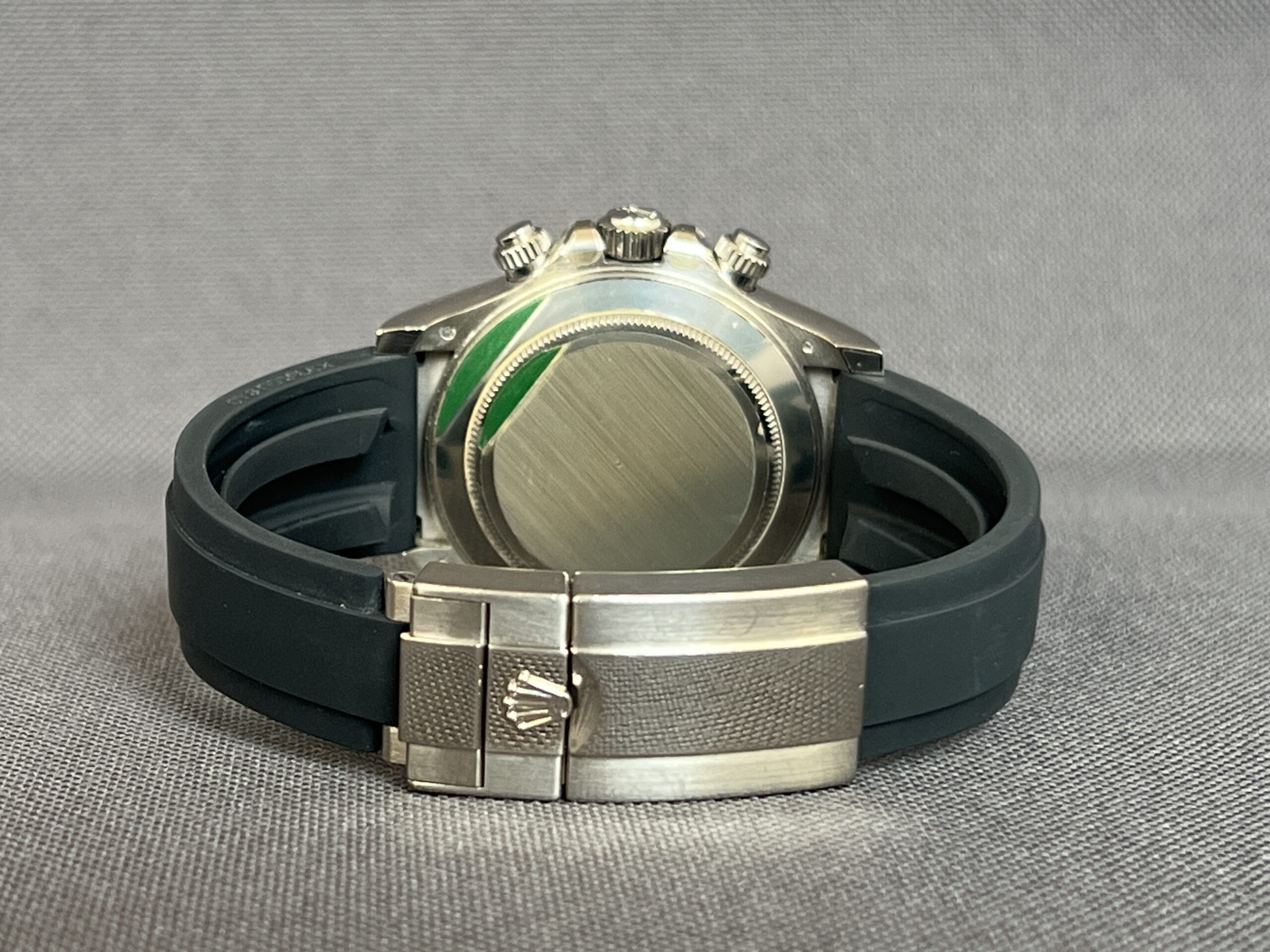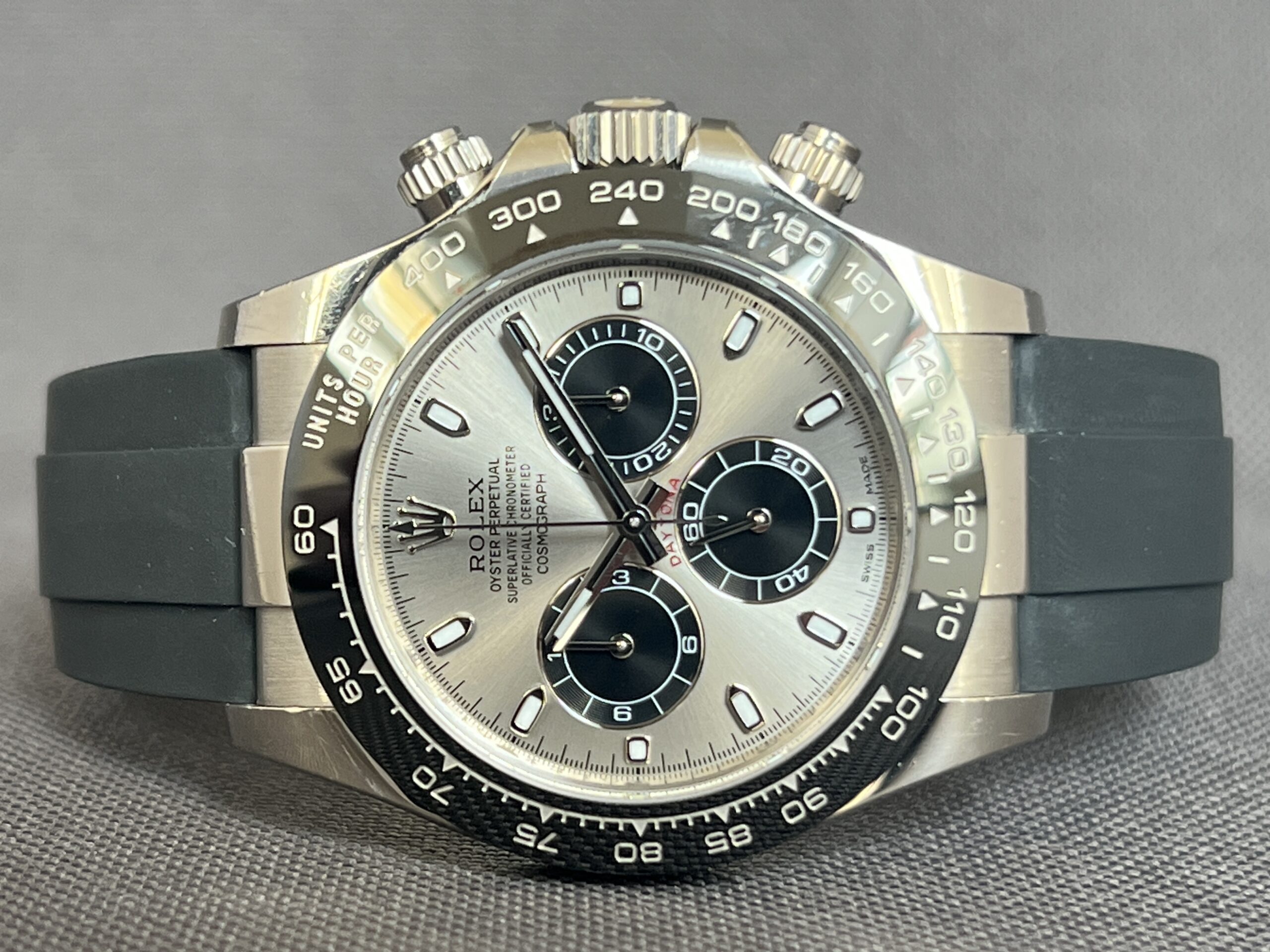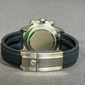 Rolex Daytona i hvidguld med den eftertragtede ‘Ghost’ skive og Oysteflex rem. Det automatiske værk yder 72 timers gangreserve. Vandtæthed til 100m.