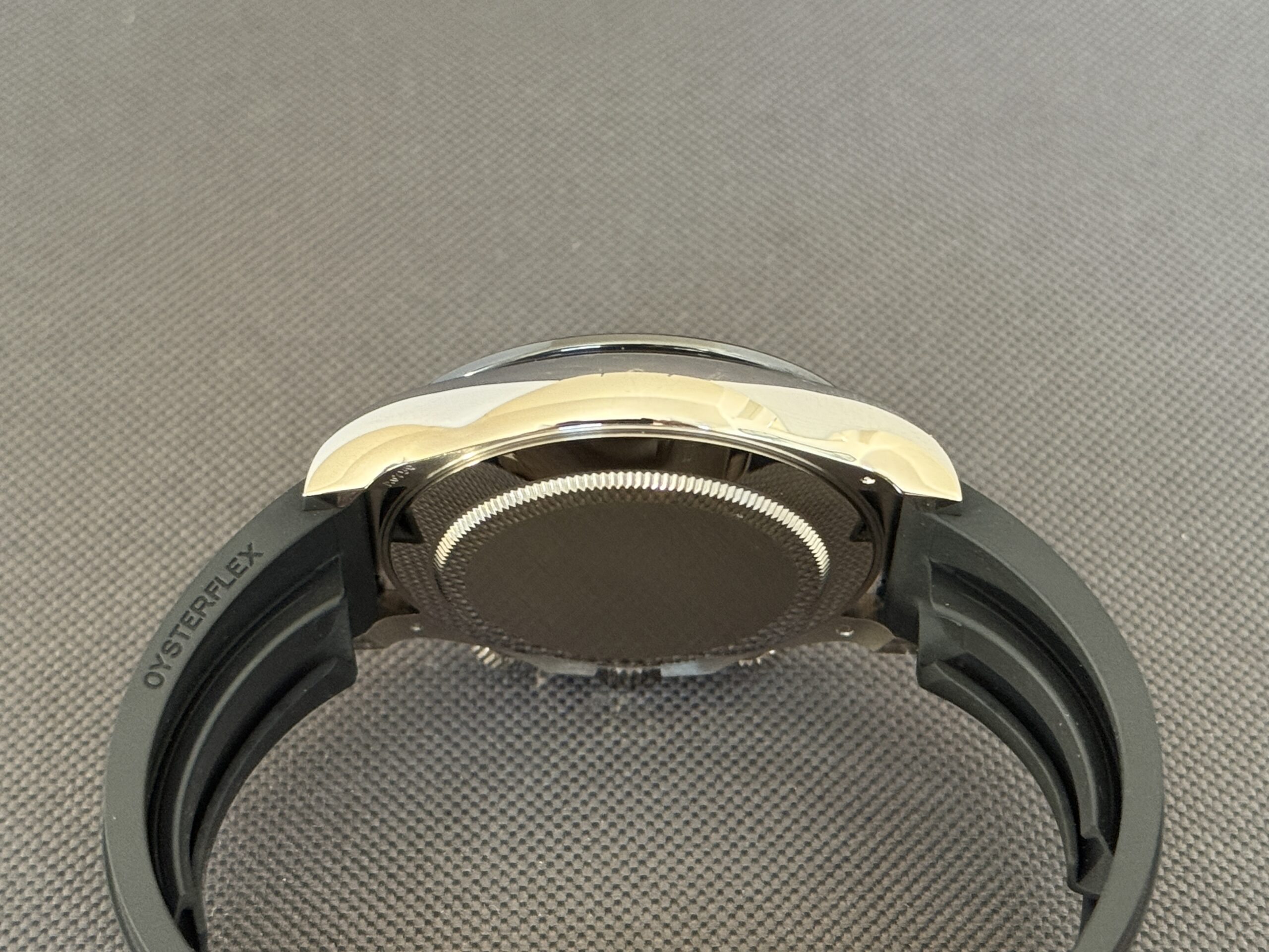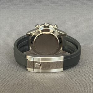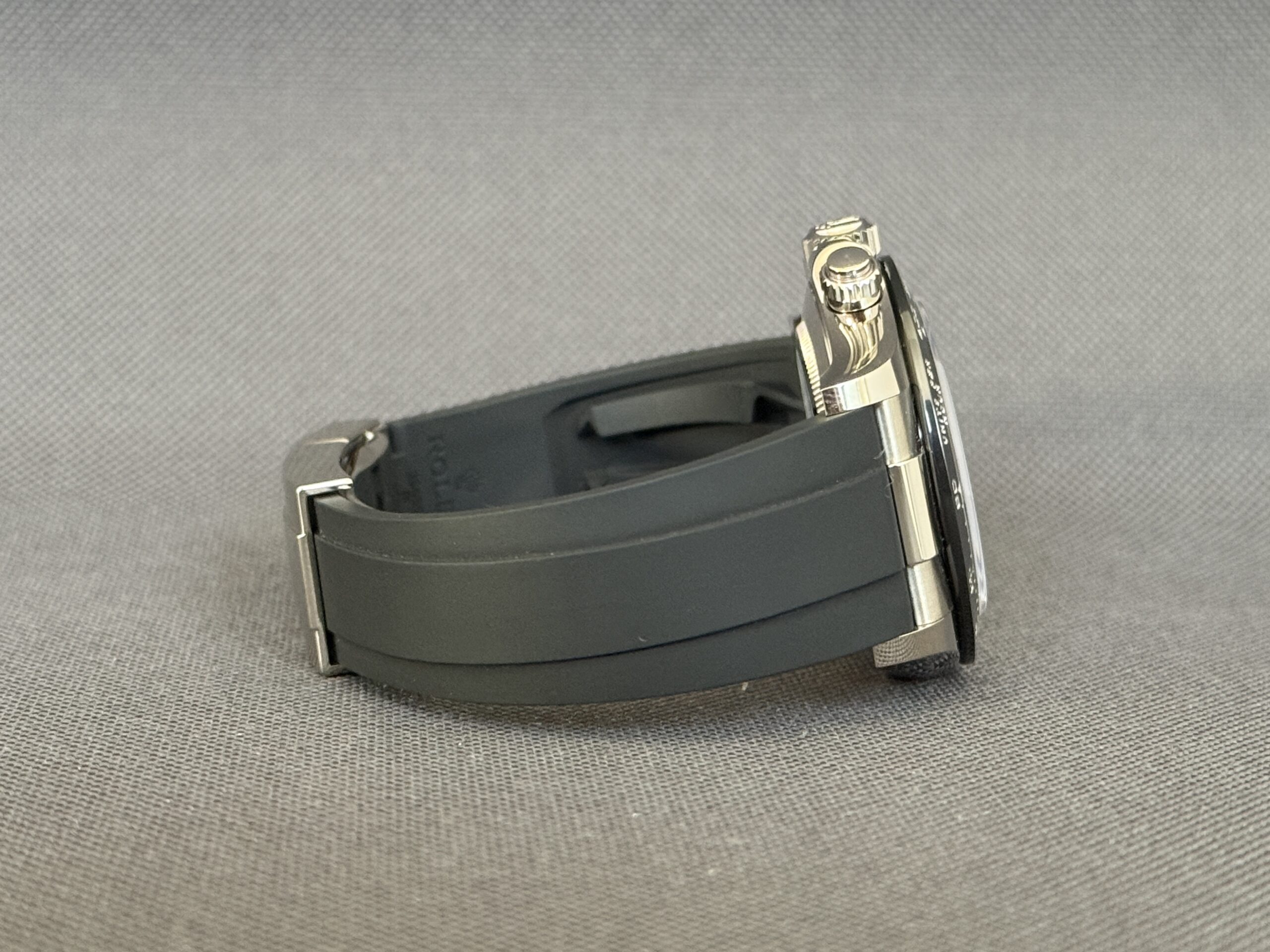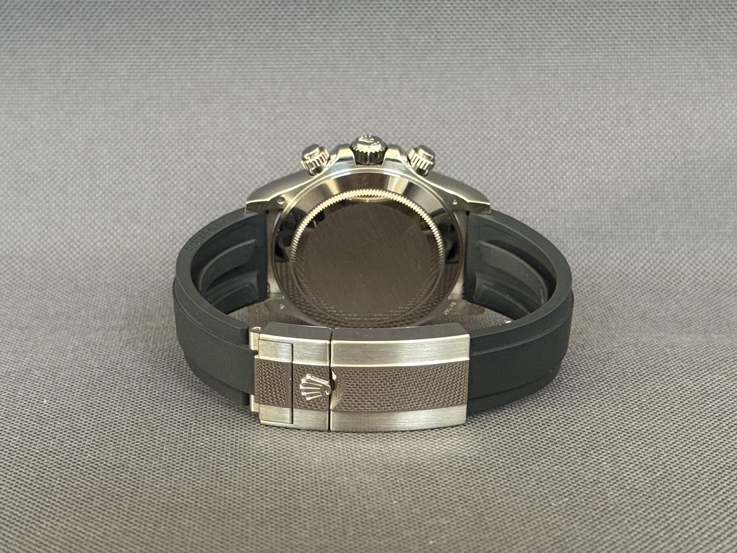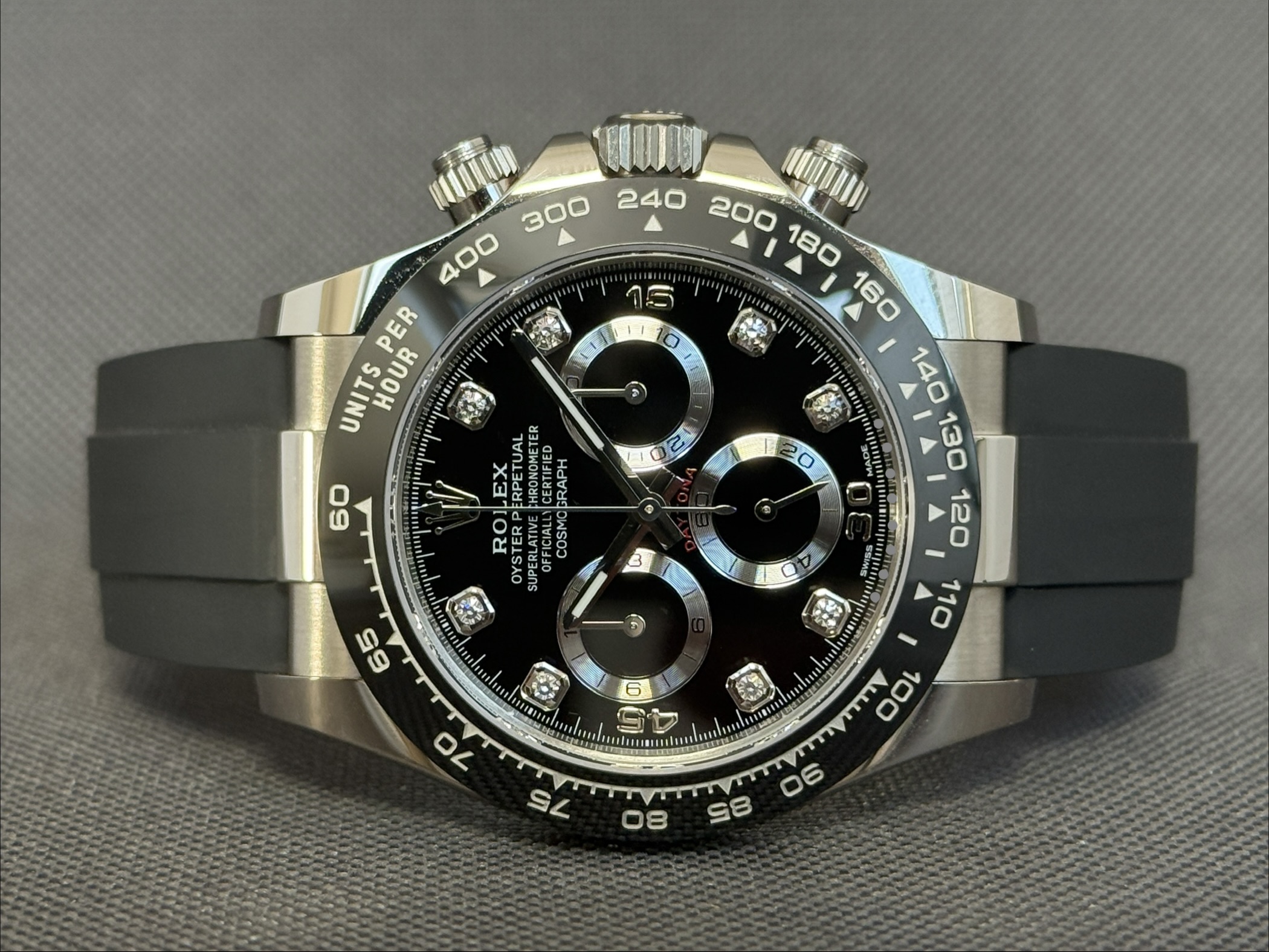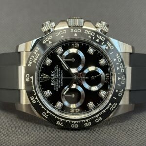 Nyt eksemplar af den populære Rolex Daytona i hvidguld med sort skive, diamanter og Oysterflex rem, som giver uret en yderst behagelig komfort på armen. Det automatiske kaliber 4130 yder 72 timers gangreserve. Vandtæthed til 100m.