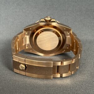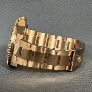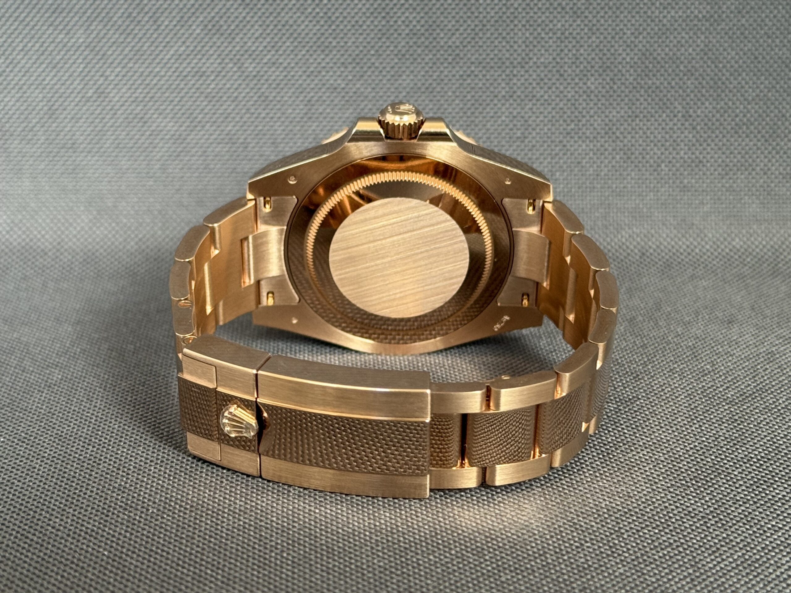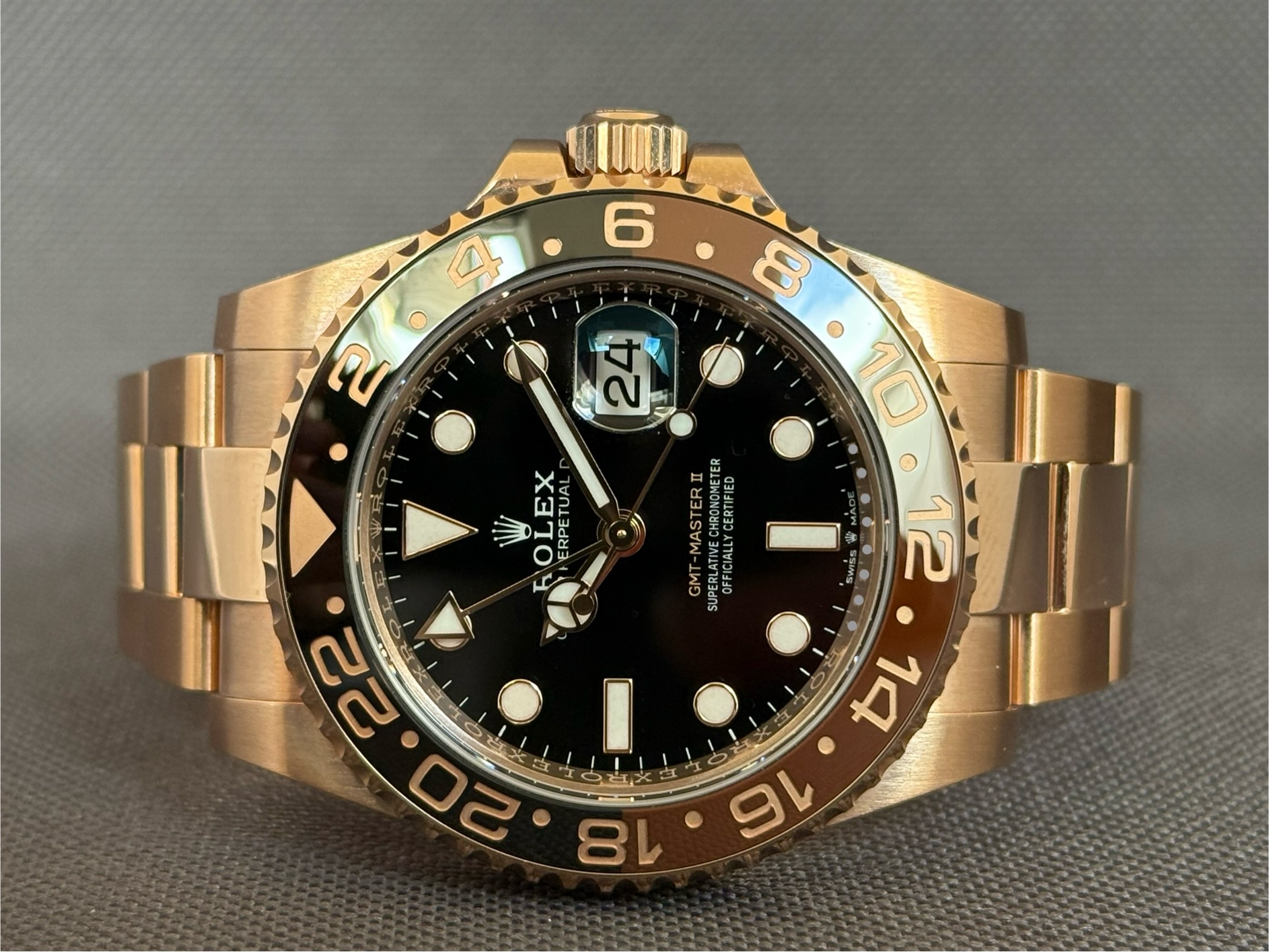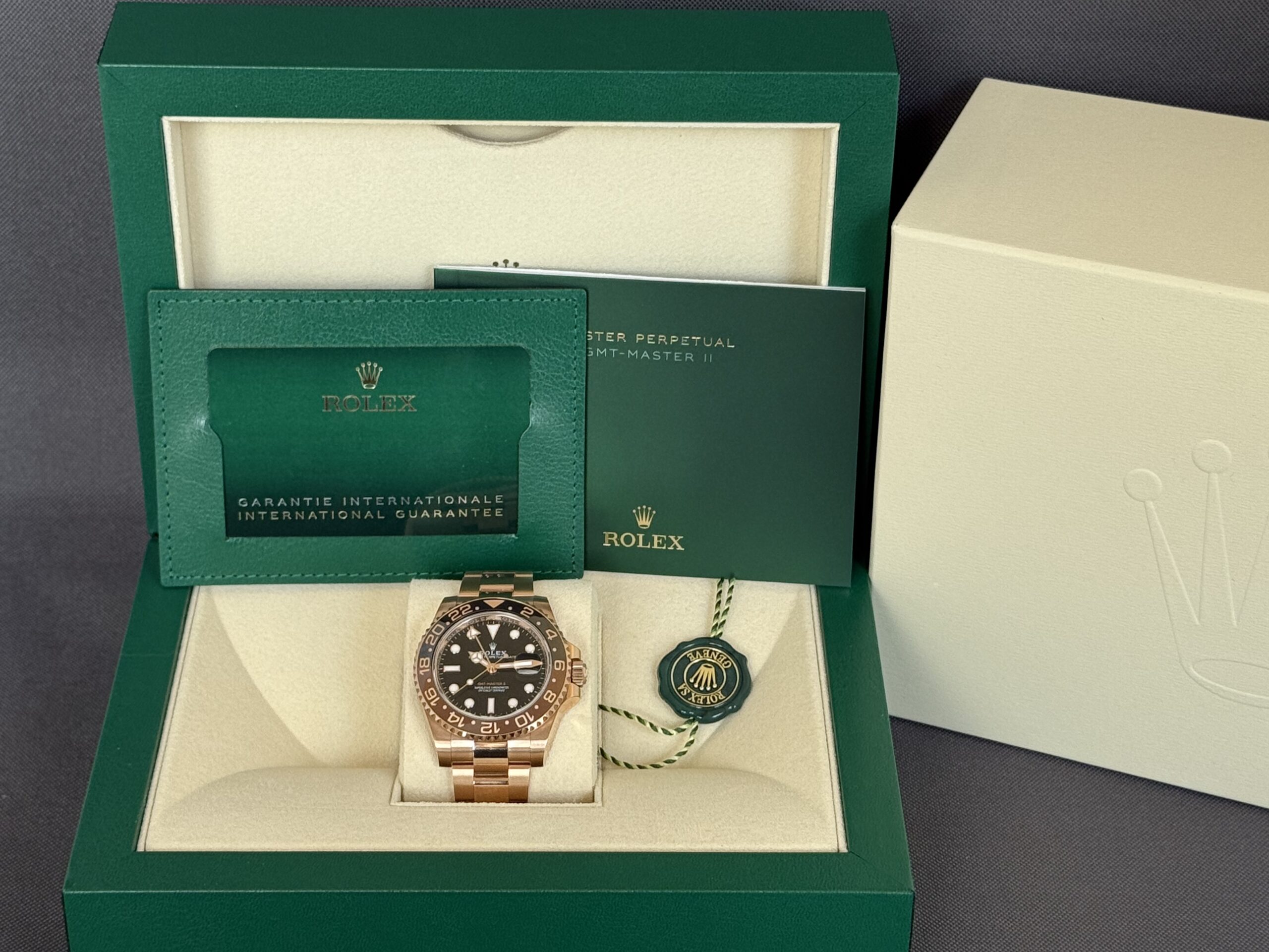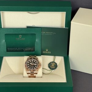 Nyt GMT-Master II ‘Rootbeer’ i 18 karat everose guld med keramisk lynette i sort og brun. I låsen er der easylink som gør det nemt at justere størrelsen på lænken, uret er med GMT funktion som gør at uret kan stilles til to tidszoner, gangreserve 70 timer, vandtæt til 100m.