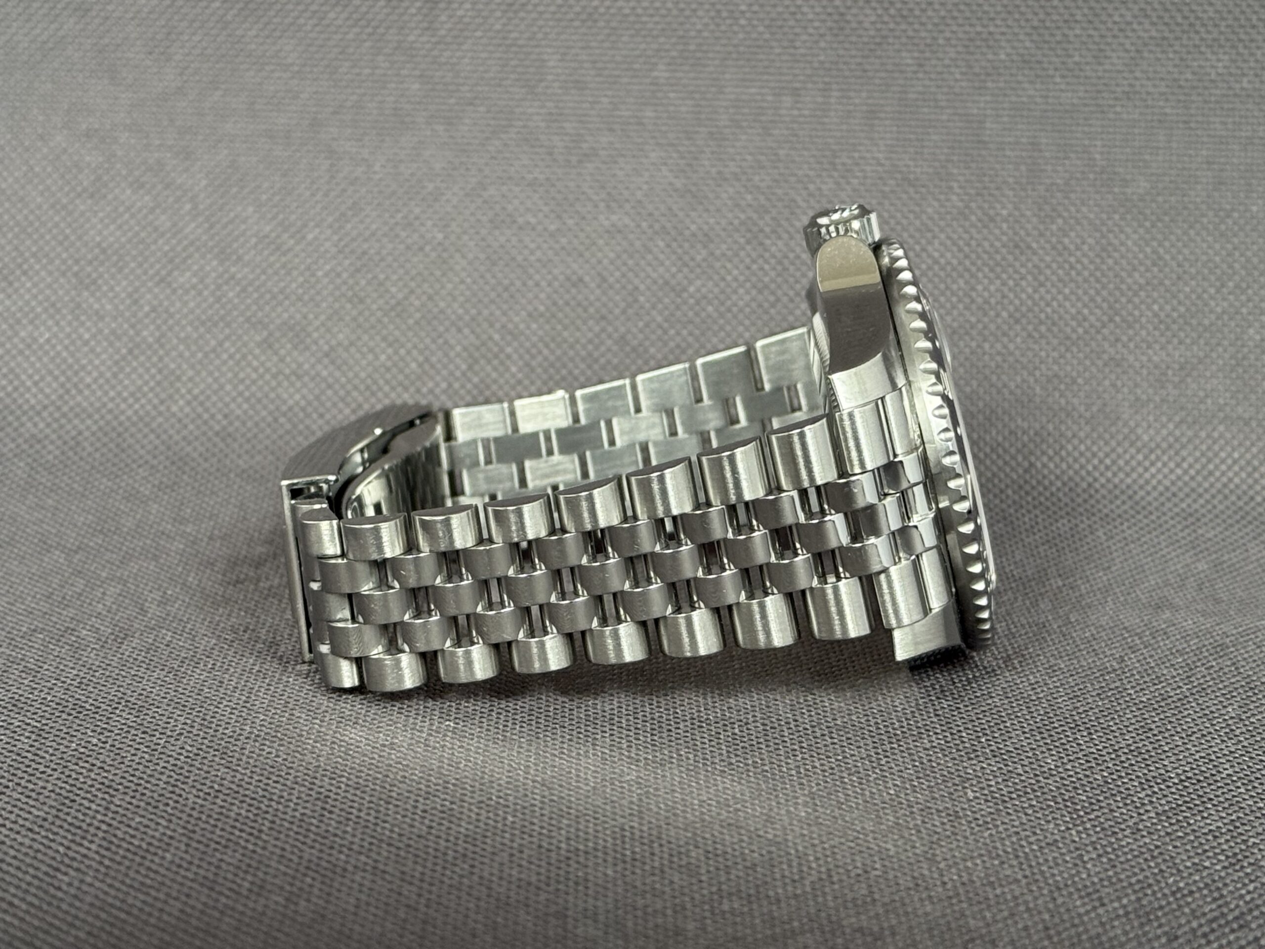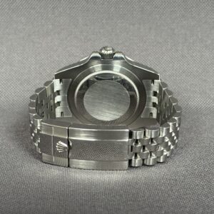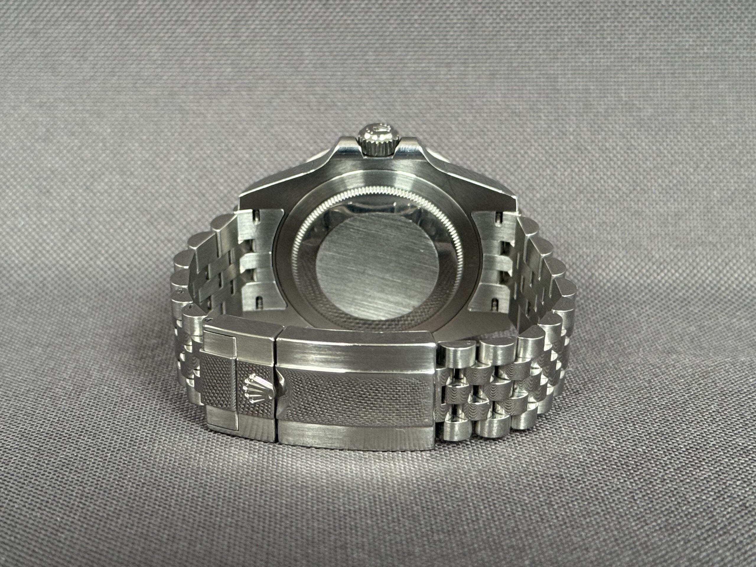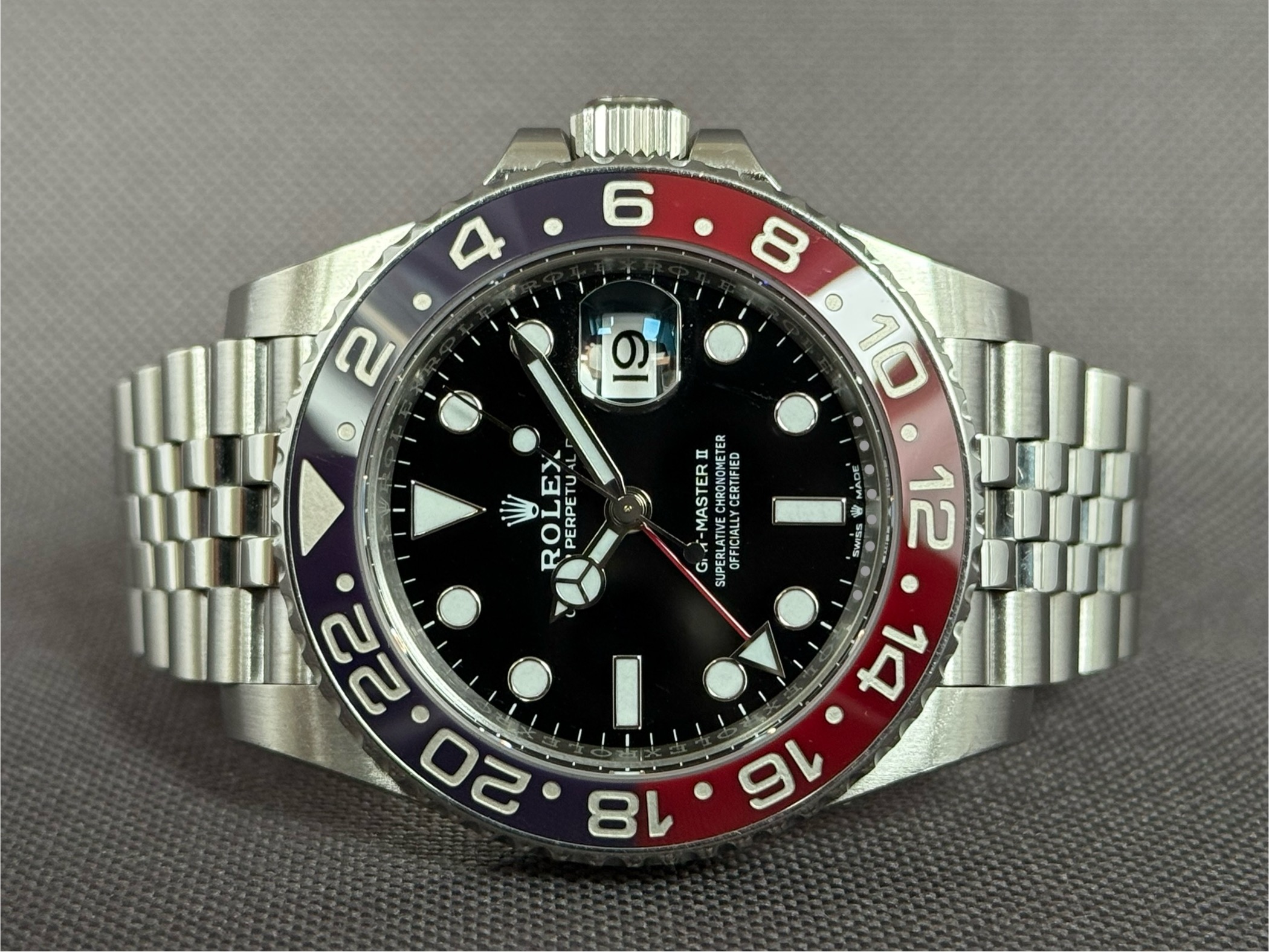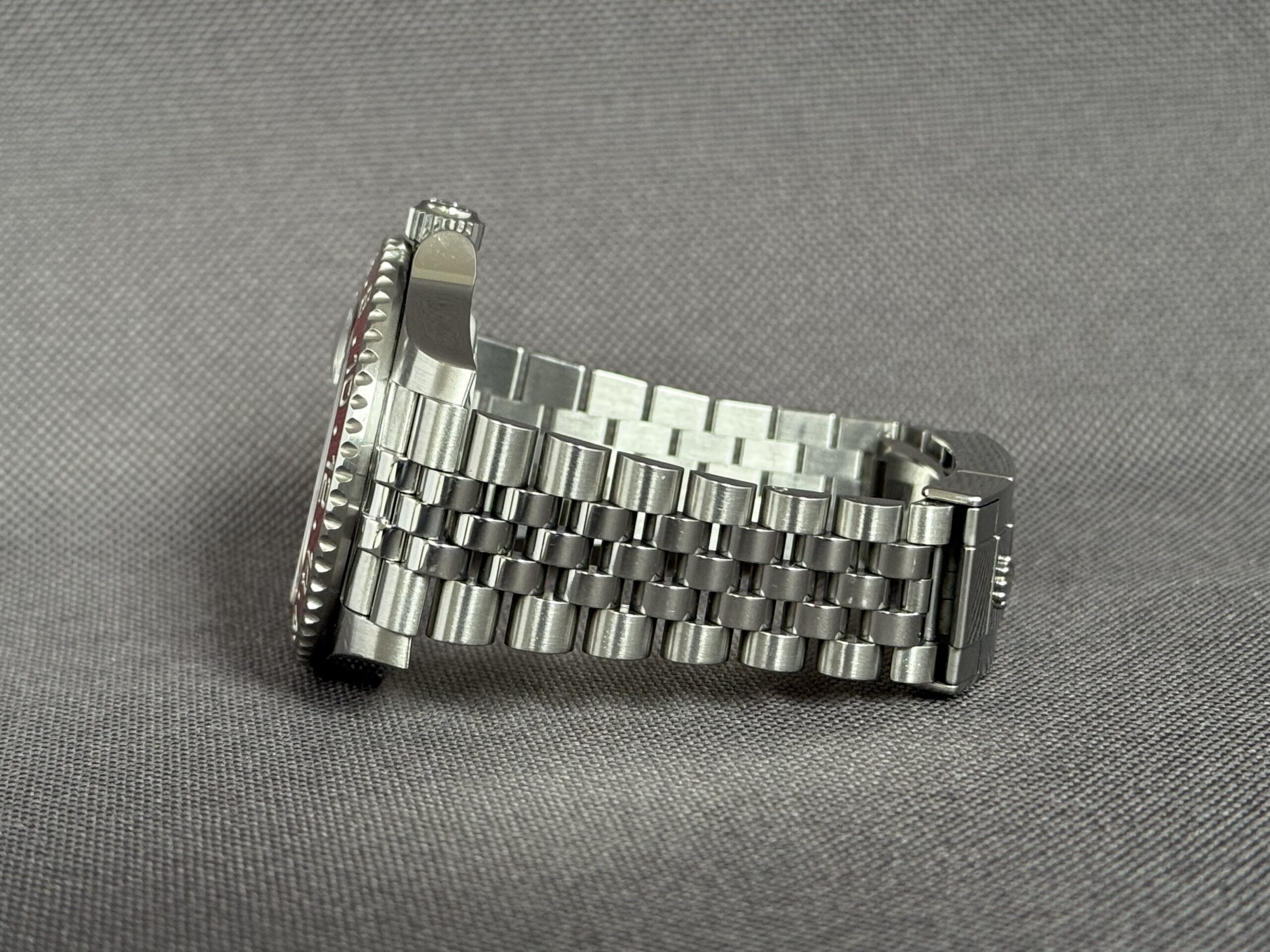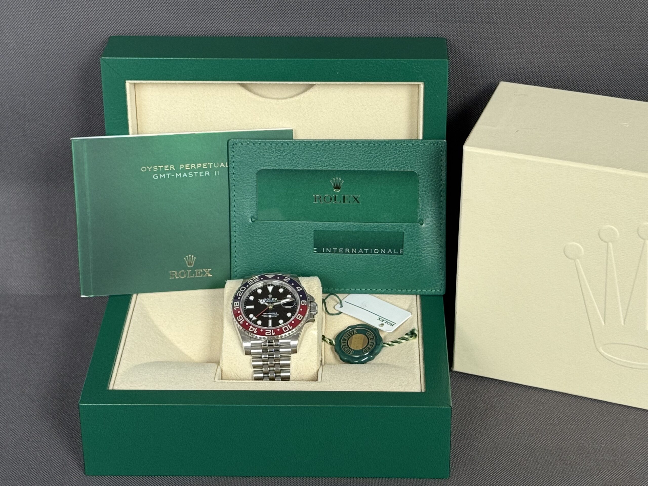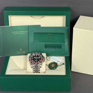 Den aktuelle udgave af Rolex GMT-Master II ‘Pepsi’. Uret har den flotte Jubilee lænke, der har ekstra god bærekomfort og en lås med Easylink, der giver mulighed for en hurtig tilpasning på 5mm. I urkassen sidder det nye forbedrede værk 3285, som har 70 timers gangreserve og en præcision på +/- 2 sek. Med GMT funktionen kan du følge flere tidszoner. Uret er vandtæt til 100m. Et sporty og elegant rolex, der egner sig til alle situationer.