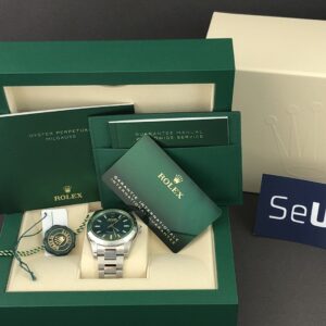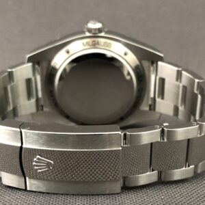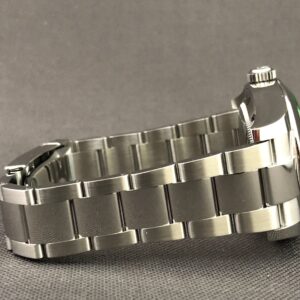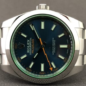 Det fantastiske Milgauss, der kan modstå magnetiske påvirkninger. Her med den smukke blå skive med ‘sunburst’, grønt safirglas og orange sekundviser formet som et lyn. Oysterlænke med polerede midterled og lås med easylink, hvilket giver mulighed for en hurtig tilpasning på 5mm. Værket er det robuste 3131 med gangreserve på 48 timer og præcision på +/- 2 sek. Vandtæthed til 100m