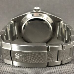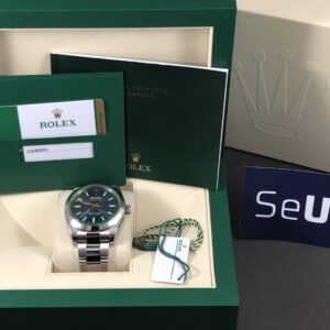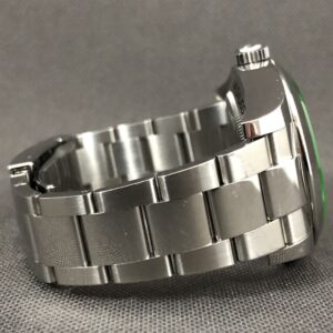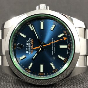 Det fantastiske Milgauss, der kan modstå magnetiske påvirkninger. Her med den smukke blå skive med ‘sunburst’, grønt safirglas og orange sekundviser formet som et lyn. Oysterlænke med polerede midterled og lås med easylink, hvilket giver mulighed for en hurtig tilpasning på 5mm. Værket er det robuste 3131 med gangreserve på 48 timer og præcision på +/- 2 sek. Vandtæthed til 100m