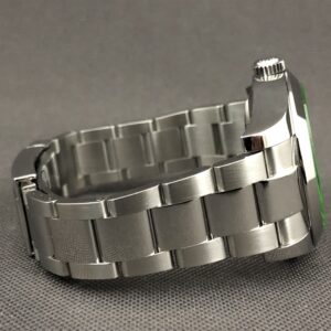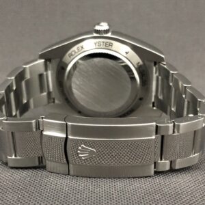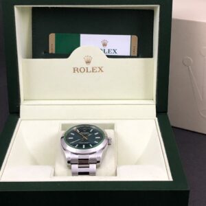 Det fantastiske Milgauss, der kan modstå magnetiske påvirkninger. Her med den smukke blå skive med ‘sunburst’, grønt safirglas og orange sekundviser formet som et lyn. Oysterlænke med polerede midterled og lås med easylink, hvilket giver mulighed for en hurtig tilpasning på 5mm. Værket er det robuste 3131 med gangreserve på 48 timer og præcision på +/- 2 sek. Vandtæthed til 100m