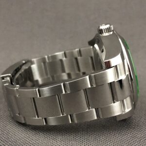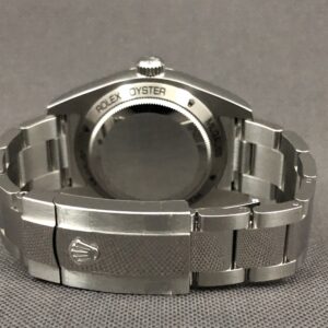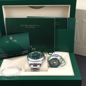 Det fantastiske Milgauss, der kan modstå magnetiske påvirkninger. Her med den smukke blå skive med ‘sunburst’, grønt safirglas og orange sekundviser formet som et lyn. Oysterlænke med polerede midterled og lås med easylink, hvilket giver mulighed for en hurtig tilpasning på 5mm. Værket er det robuste 3131 med gangreserve på 48 timer og præcision på +/- 2 sek. Vandtæthed til 100m