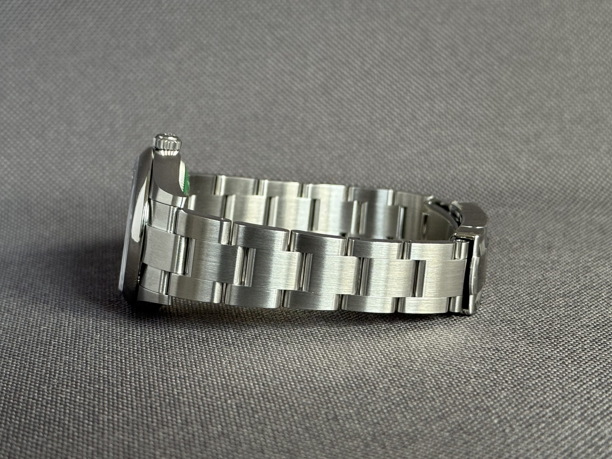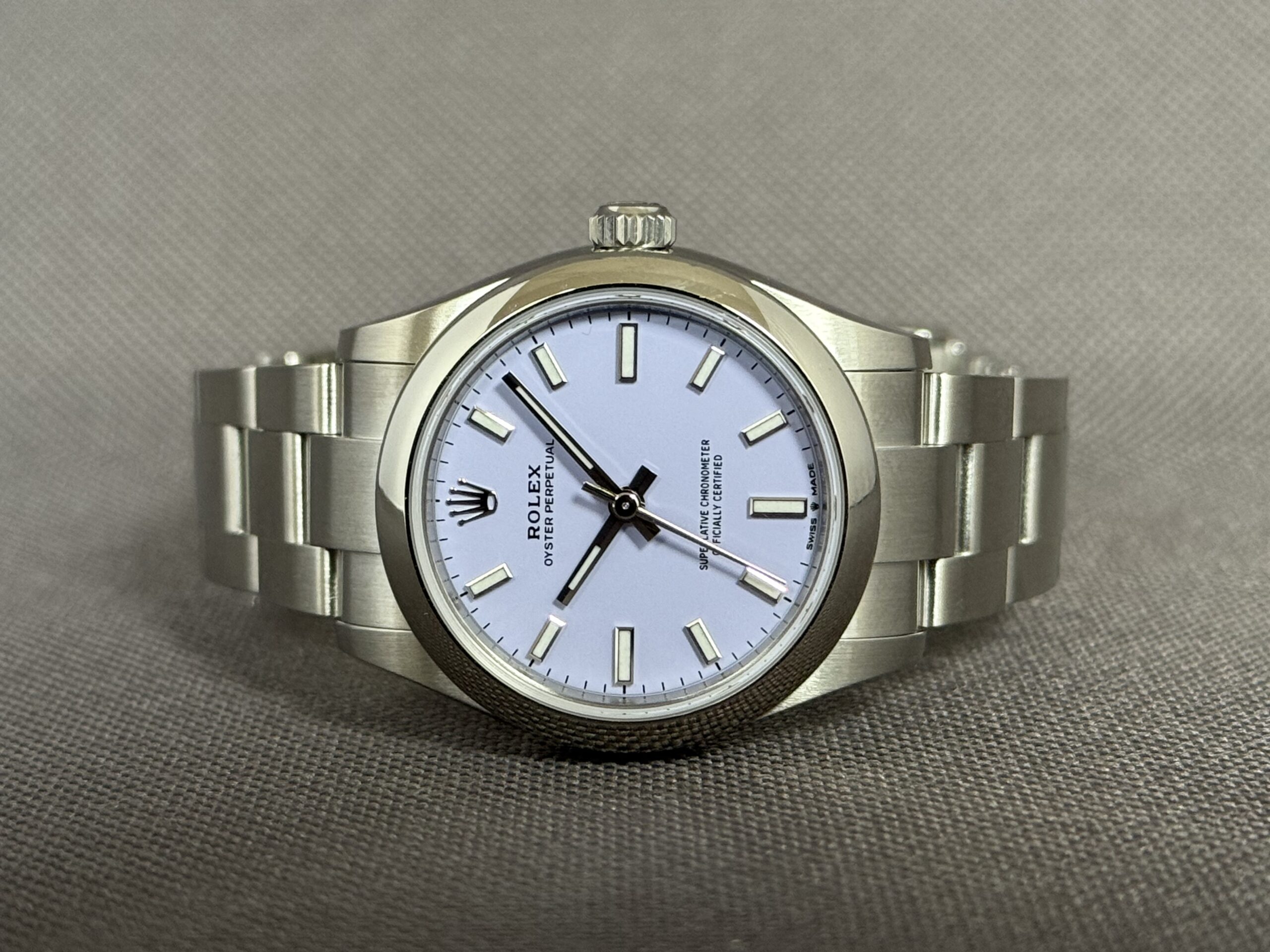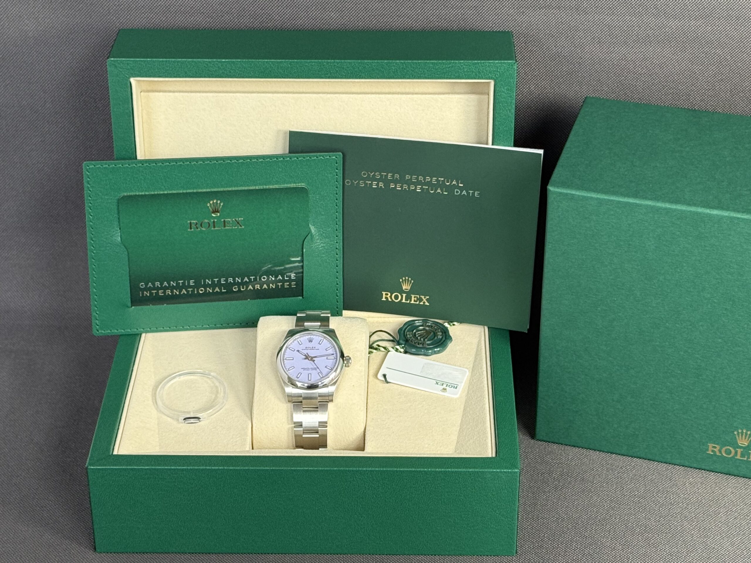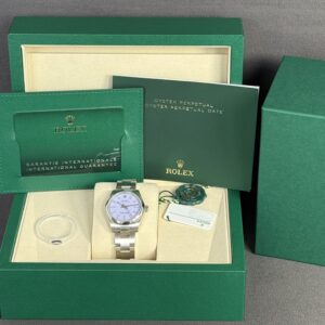 Smukt Rolex Oyster Perpetual i 31mm med den nyeste skive ‘Lavender’ som blev introduceret til W & W i år 2025. Låsen er med easylink som kan justeret med 5mm for ekstra komfort. Gangreserve 55 timer og vandtæt til 100 meter.