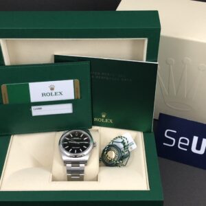 Klassisk og stilrent Rolex i stål med en smuk sort skive, oysterlænke og oysterlås. Værket er et 3132, der har gangreserve på 48 timer og en præcision på +/- 2 sek. Et robust Rolex, der egner sig til enhver lejlighed. Vandtæt til 100m.