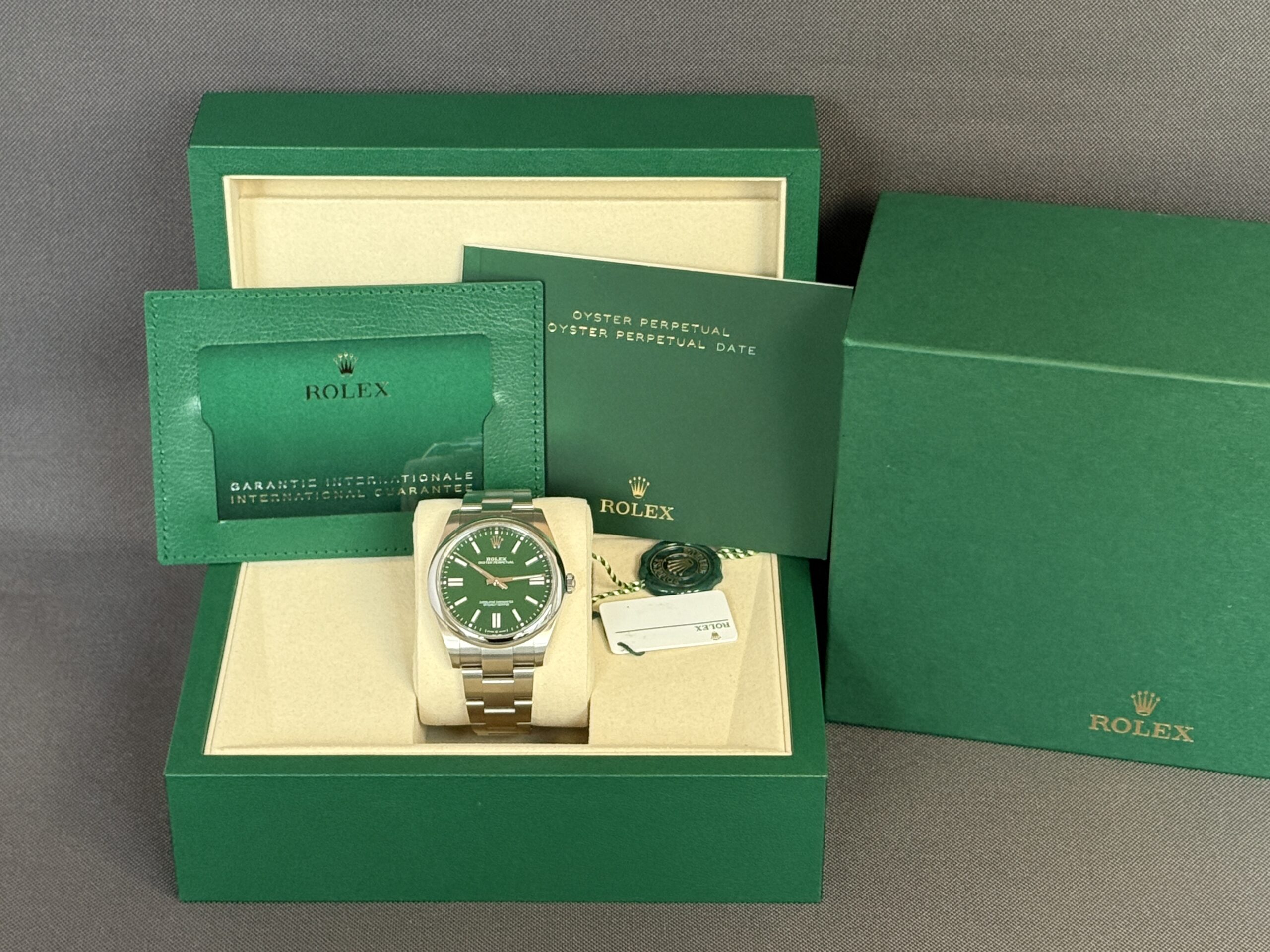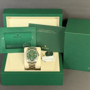 Super smukt Rolex Oyster Perpetual i 41mm med den populære grønne skive. Låsen er med easylink som kan justeret med 5mm for ekstra komfort. Inde i uret sidder Rolex nye Calibre 3230 som yder 70 timers gangreserve og vandtæthed til 100 meter.
