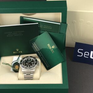 Rolex Sea-Dweller, 126600 med oysterlænke og glidelock til hurtig tilpasning af lænken. Det automatisk værk 3235 yder gangreserve på 70 timer og har en præcision på +/- 2 sek. Vandtæthed til 1220m.