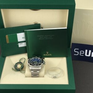 DEEPSEA BLUE her i nyeste version. Skiven er fantastisk og skal opleves. Med en diameter på 44mm og en højde på knap 18mm er det et dykkerur, der kræver sin arm. Keramisk indlæg, oysterlænke med lås, der giver mulighed for hurtig tilpasning uden brug af værktøj. Automatisk værk 3235 yder 70 timers gangreserve og en præcision på +/- 2 sek.. Vandtæthed til 3.900m.