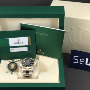 Det eftertragtede Sky-Dweller i guld/stål med riflet guld krans og sort skive. Her får du det mest avancerede værk fra Rolex med dato, måned og GMT funktion.