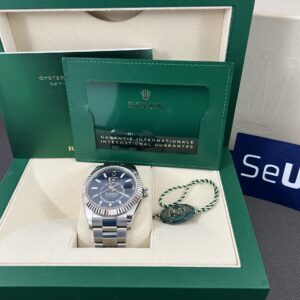Det eftertragtede Sky-Dweller i stål med hvidguldskrans og blå skive. Her får du det mest avancerede værk fra Rolex med dato, måned og GMT funktion.