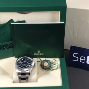 Det eftertragtede Sky-Dweller i stål med hvidguldskrans og blå skive. Her får du det mest avancerede værk fra Rolex med dato, måned og GMT funktion.