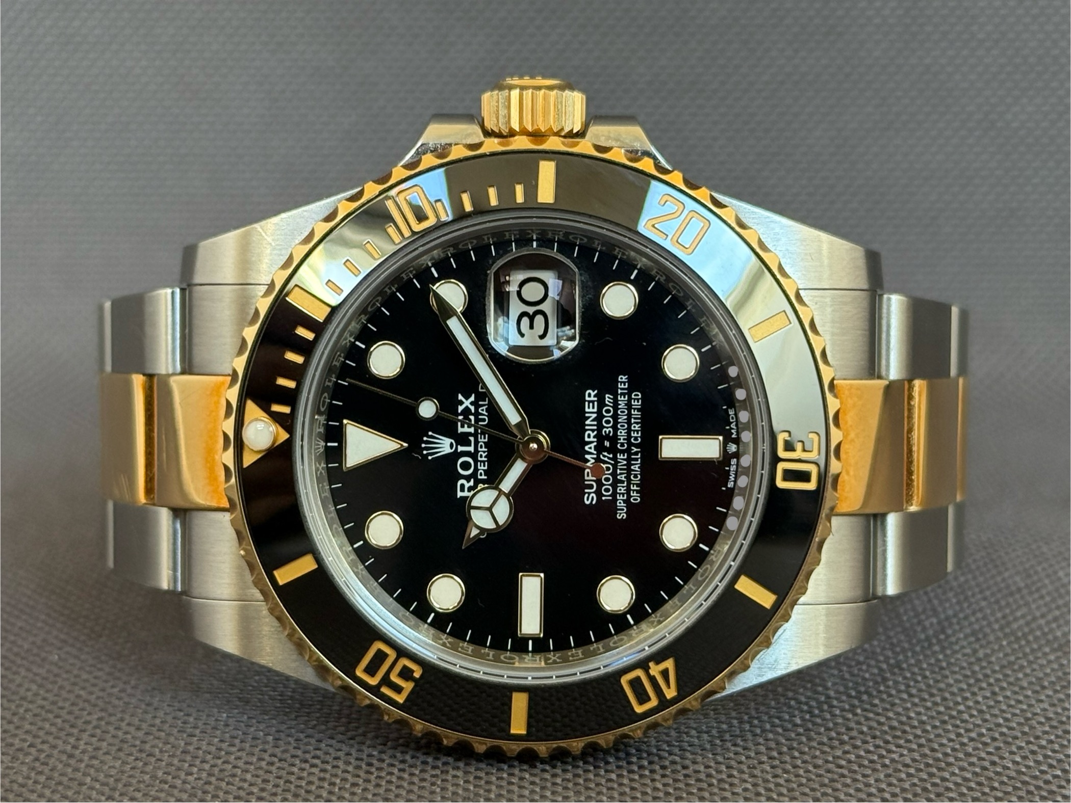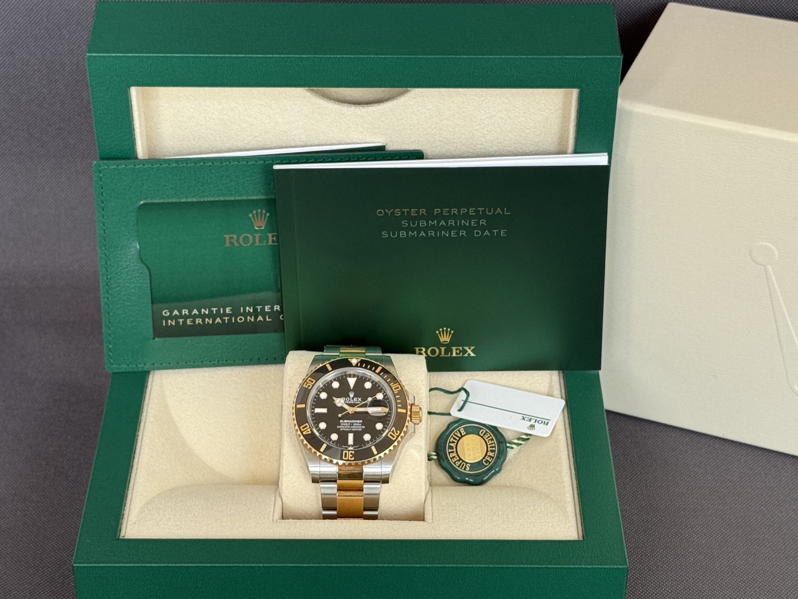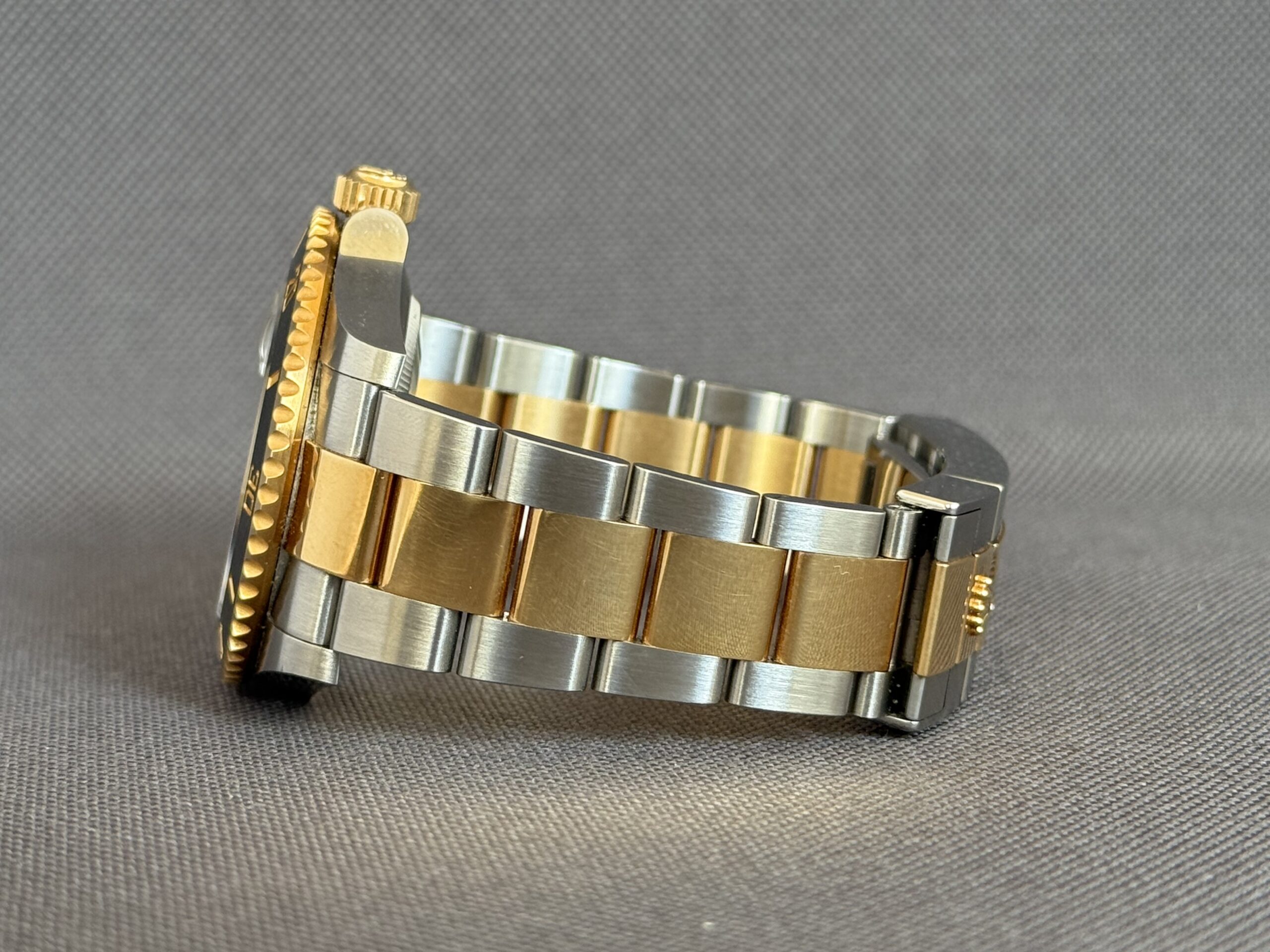 Nyeste udgave af Submariner Date i 18k guld og stål med sort skive. Nu i 41mm og smallere horn end den tidligere 116613LN. En anelse bredere lænke og et opdateret værk med længere gangreserve – 70 timer. Et fantastisk dykkerur i en eksklusiv udgave. Vandtæthed til 300m.