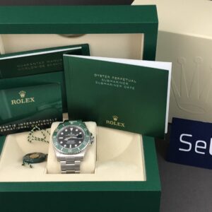 Submariner date med grønt indlæg (MK1) og en diameter på 41mm. Det nye automatiske værk 3235 yder gangreserve på 70 timer og har en præcision på +/- 2 sek. Vandtæthed til 300m.