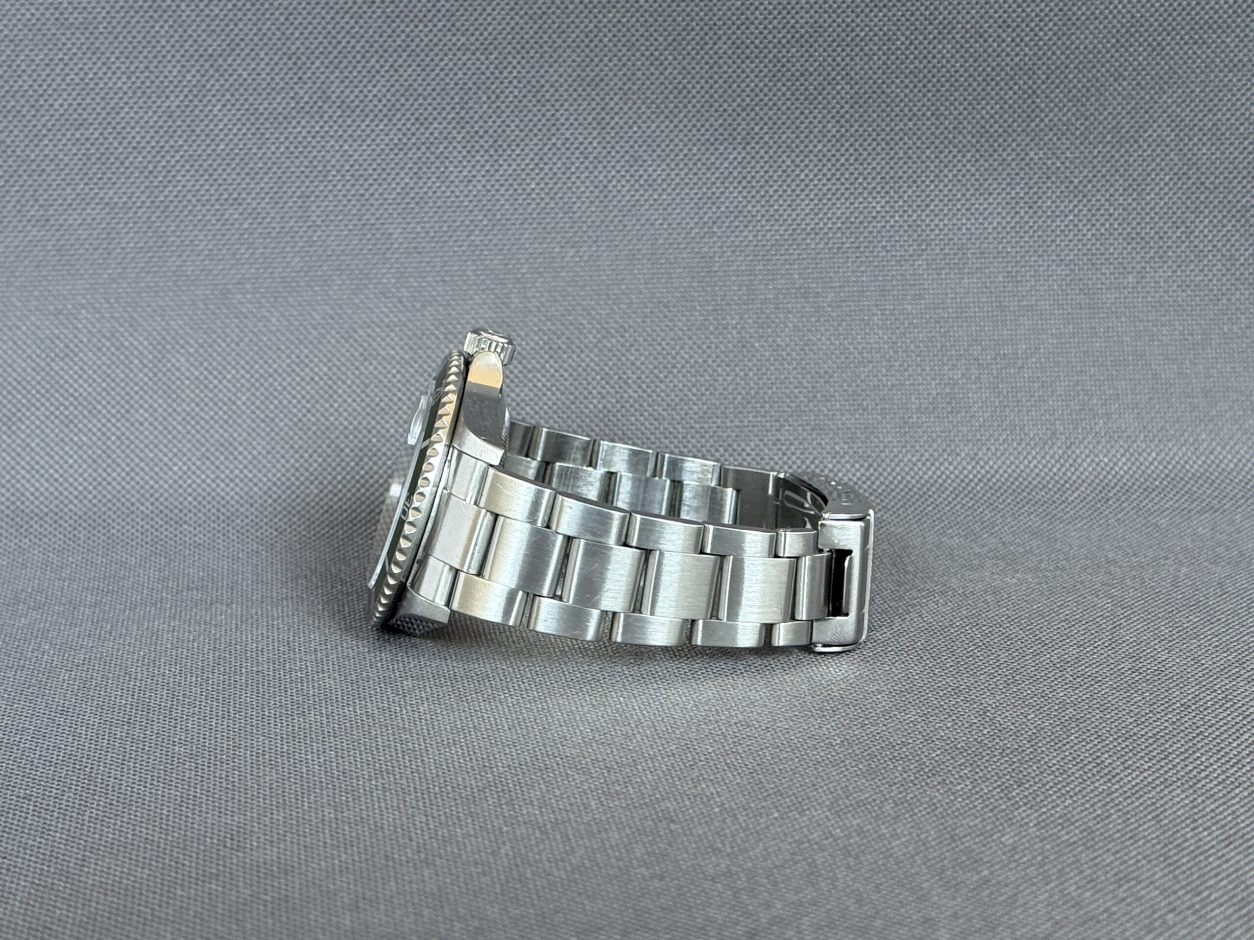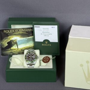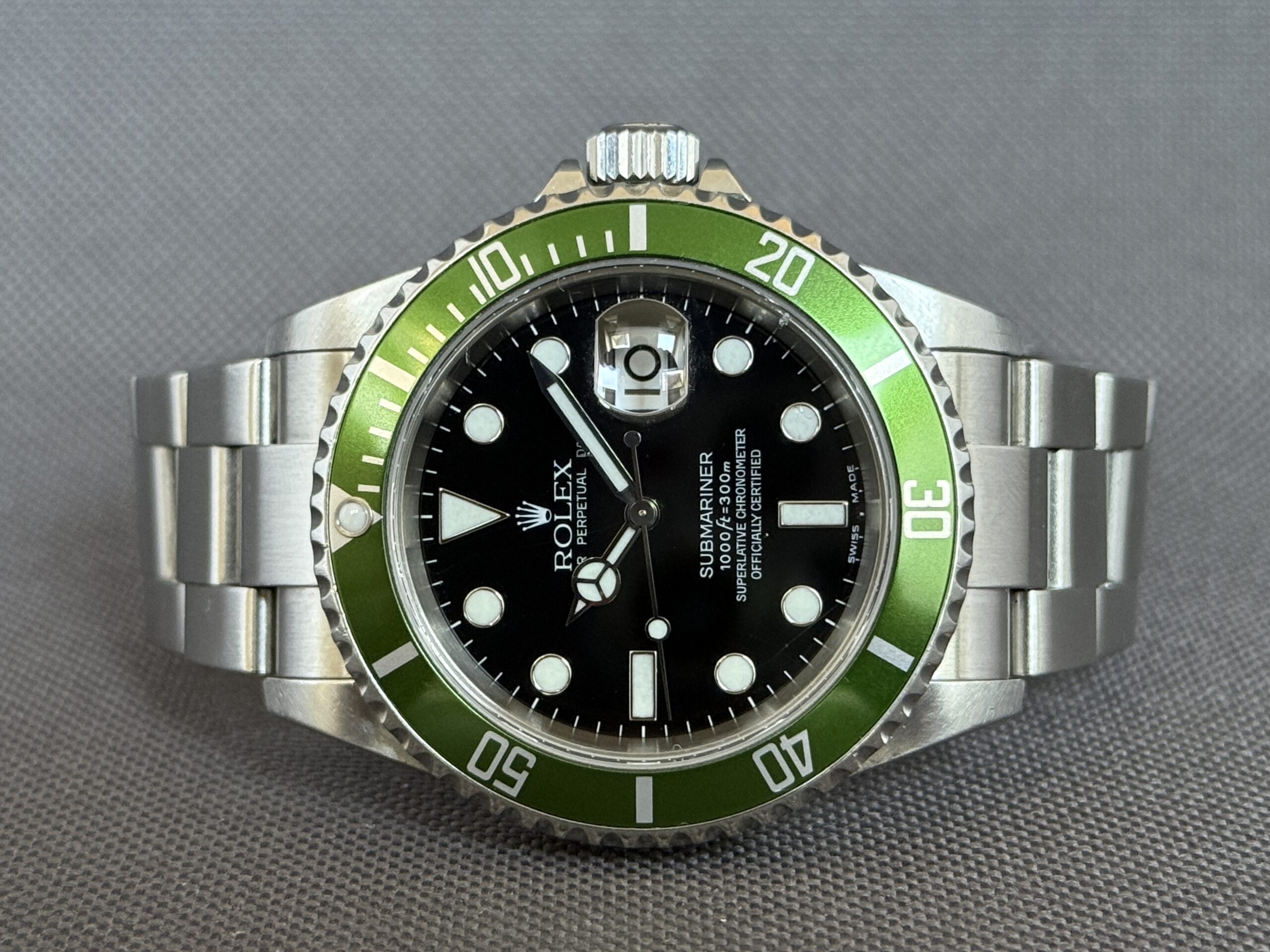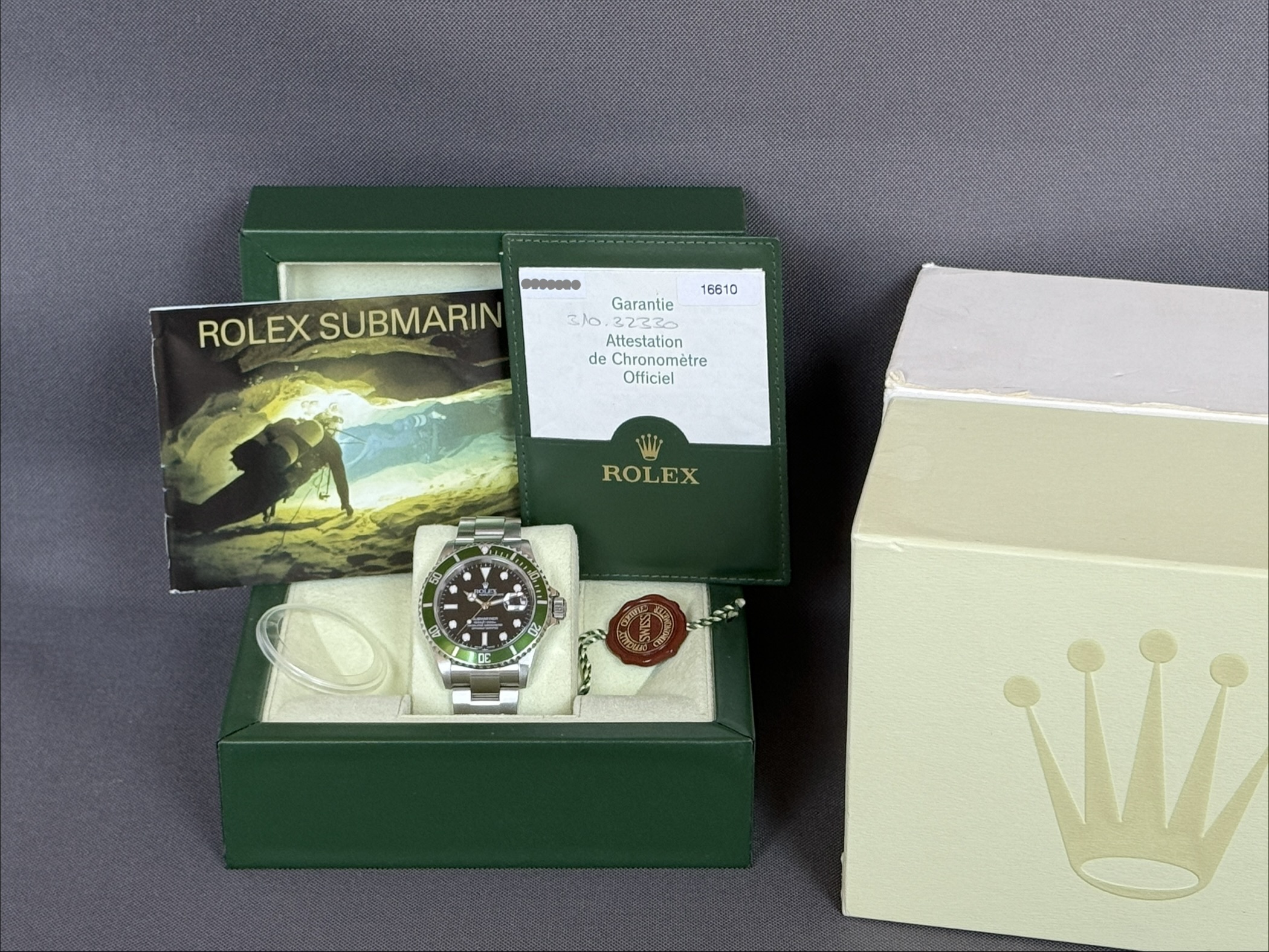 Ikonisk Rolex Submariner Date 16610LV i stål med den ikoniske grønne lynette og sort skive ‘Kermit’. Modellen blev lanceret i 2003 i forbindelse med Submarinerens 50-års jubilæum og er i dag et af de mest eftertragtede Submariner Date blandt entusiaster og samlere. Uret er udstyret med Rolex’ automatiske Caliber 3135, kendt for sin høje præcision, robusthed og driftssikkerhed. Gangreserve 48 timer og en garanteret vandtæthed ned til 300 meter.